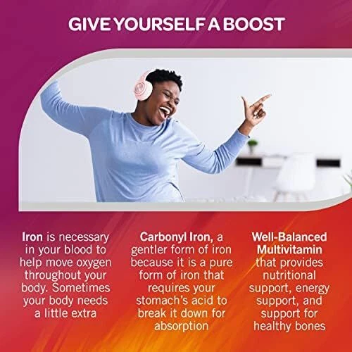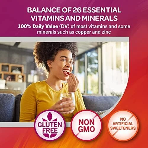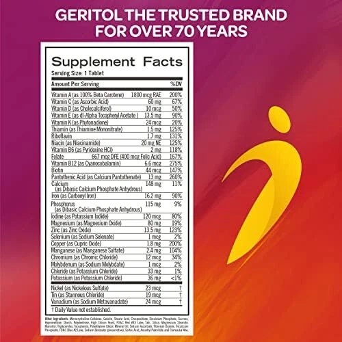 Trusted Brand for Over 70 Years: Geritol Multivitamin tablets are a well-balanced multivitamin for women, men, and children 12 years and older The Right Support: Geritol Multivitamins contain B-vitamins for energy support, antioxidants like beta carotene, and vitamins C and E for immune support, vitamin D for bone health and iron to help move oxygen throughout your body With 26 Essential Vitamins and Minerals: With close to 100% of the daily recommended allowance of many essential vitamins and minerals, Geritol vitamin supplement contains 26 essential vitamins and minerals Just What You Need, Nothing You Don’t: This vitamin for women and men is gluten-free, non-GMO and uses no artificial sweeteners Easy to Take: Take one tablet daily, immediately before, during, or after the meal of your choice; Not intended for children under 12