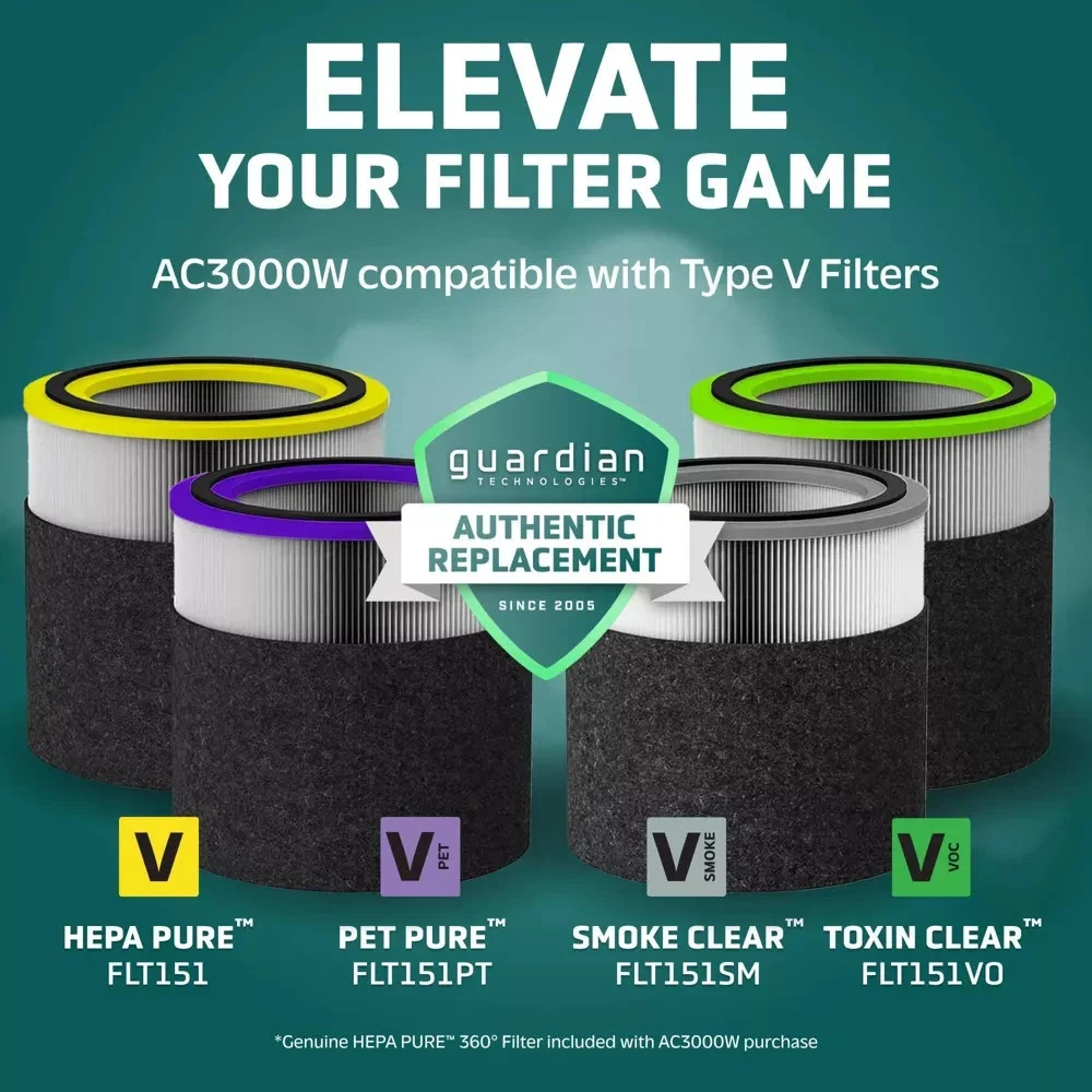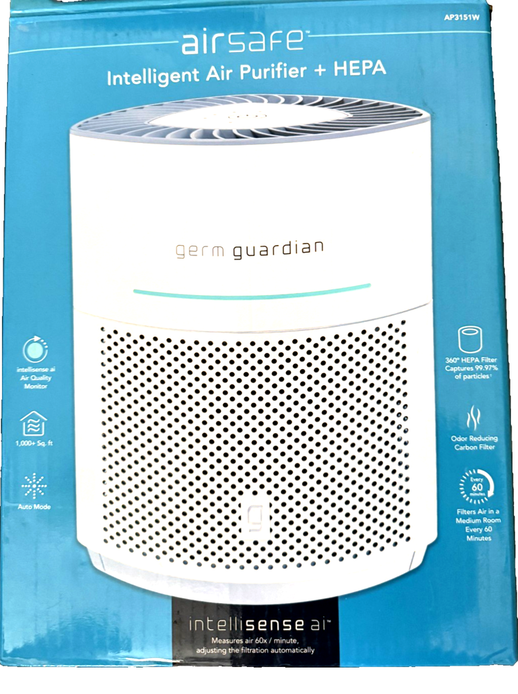 Highlights Guarding Your Air: Genuine high efficiency True 360 Degree HEPA air filter captures 99.97% of particles as small as 0.1 microns from all directions. Our True HEPA air filter traps dust, pollen, harmful germs, and pet dander* Germ-Reducing UV-C Technology: Ultraviolet - C (UV-C) light works with titanium dioxide to help reduce airborne germs, bacteria, and mold spores for cleaner, healthier air. Zero ozone certified for peace of mind** Intellisense Air Quality Indicator: Measures the room air quality 60 times per minute using a PM 2.5 sensor detecting tiny particles in the air smaller than the diameter of a strand of human hair. It automatically adjusts the speed when poor air is detected and returns to a lower speed after cleaning the dirty air Whole Room Coverage: An ideal air purifier for bedrooms and living spaces, this powerful home air purifier circulates and filters the air in medium (215 sq. ft.) rooms every 12.5 minutes or in a large (1043 sq. ft.) rooms every 60 minutes Reduces Odors: Activated carbon pre-filter traps dust, pet hair, and other large particles while extending the life of the HEPA filter. Treated carbon absorbs volatile organic compounds from the air and reduces odors from smoking, cooking, and pets Quiet Operation: 4 speed options with the lowest setting being utilized as gentle white noise for a quiet, restful night's sleep Genuine GermGuardian Filters: Replacement filter is HEPA Filter V (model numbers FLT151, FLT151PT, FLT151SM, FLT151VO). Carbon filters are available for an extra layer of protection (model FLT15CB4). The UV-C Replacement bulb is LB1000, off-brand filters may reduce efficacy, and may cause damage to the air purifier Performance Verified: *Initial efficiency value. As small as 0.1 microns from the air passing through the filter media. **Tested with Staphylococcus Albus, Escherichia Coli, Aspergillus, and Phi-X174 Description Elevate your home's atmosphere with the GermGuardian AC3000W AirSafe home air purifier for bedrooms, kitchens, offices, and more – It filters odors and trap allergens with 4 layers of protection. Immerse yourself in the tranquility of clean, allergen-free air as this powerful air purifier effortlessly captures and eliminates airborne particles. Equipped with a 360 Degree True HEPA Pure filter and optional UV-C light, this air purifier captures a remarkable 99.97% of dust, pollen, pet dander, and other allergens. Our testing proves it! Your at-home comfort can be customized with 4 speed settings, including an ultra-quiet mode on the lowest speed setting. This AirSafe purifier features an Intellisense air quality indicator, measuring the air quality 60 times per minute. It automatically adjusts the speed when poor air is detected, and can monitor air quality 24/7, always cleaning every second of the day. This air purifier circulates the air in a medium 215 sq. ft. room every 12.5 minutes or in a large 1043 sq. ft. room every hour, making it ideal for bedrooms, offices, basements, and other open concept spaces. Looking out for your family's well-being is no small feat. That's why we'll take the task of guarding your air to keep it clean and fresh. Let our meticulously engineered, rigorously tested and reliably proven products purify your home and shield your environment from the smoke in your air.
