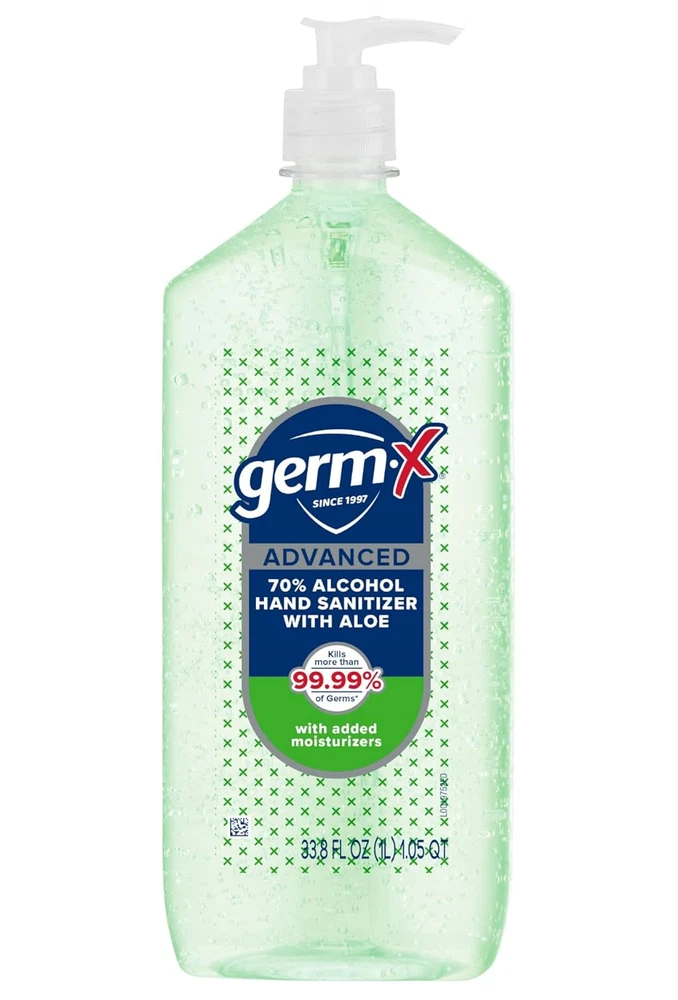 Germ-X Advanced Hand Sanitizer with Aloe and Vitamin E, Moisturizing Gel 1 Liter Seasonal Change Essential: Help keep your family healthy this Fall with Germ-X hand sanitizer. When used as directed, our sanitizing products kill 99.99% of many common germs. Use at home, work, school or on the go Fast and Effective: Cleaning on the go just got a lot easier. Germ-X Advanced Aloe Hand Sanitizer gel kills 99.99% of germs without water in as little as 15 seconds Moisturizing Hand Sanitizer: This pleasant, fresh-smelling and non-drying sanitizing formula is enriched with Aloe and Vitamin E, leaving skin feeling soft and moisturized with no sticky residue Clear Gel Formula: This USP-grade liquid hand sanitizer is the perfect convenient alternative to soap and water to leave your hands feeling smooth and fresh X Germs with Confidence: We make Germ-X products that go wherever you go. From convenient pumps, flip-top caps, sprays, and even wipes, Germ-X products have you covered Manufactured In The USA: The makers of Germ-X products have been helping happy, healthy families since 1997 Pack of 1 x 1 Liter Hand Sanitizer with Aloe and Vitamin E 3.88 inches x 2.89 inches x 9.64 inches. Weight: 2.09 lb Unit Count 33.8 Fluid Ounces Special Feature No Rinse Number of Items 1 Country of Origin USA Product Dimensions 2.89 x 3.88 x 9.64 inches; 2.09 Pounds Active Ingredients vitamin e Manufacturer Advanced Scent with Aloe Size 33.8 Fl Oz (Pack of 1)