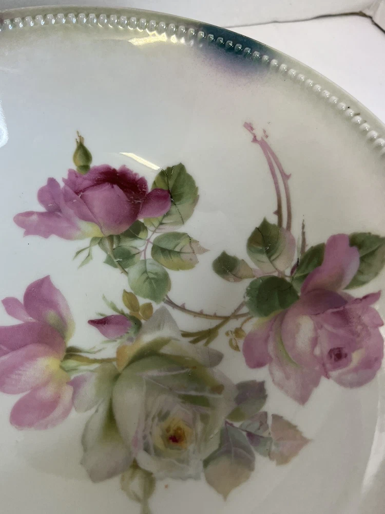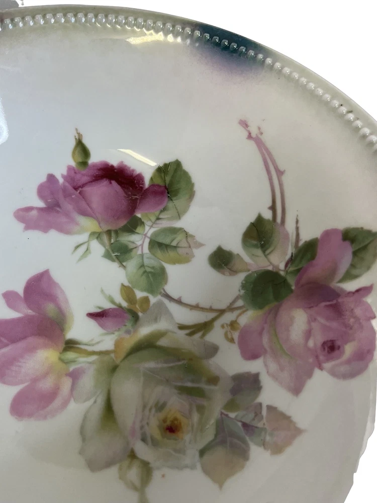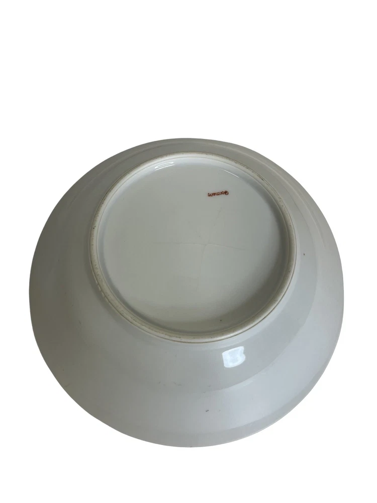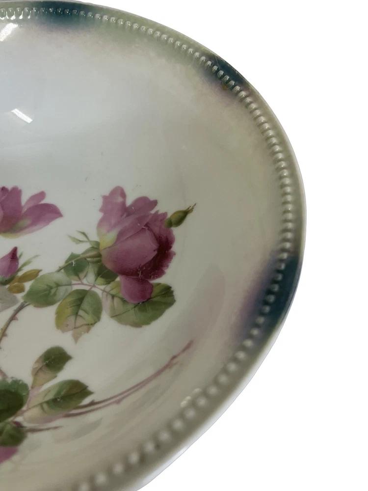German Hand Painted Vegetable Serving Bowl Pink Roses 8 in diameter , 2.25 in tall. Good Condition - No chips or cracks - some glazing on bottom - see pictures for details Please contact me with any questions
