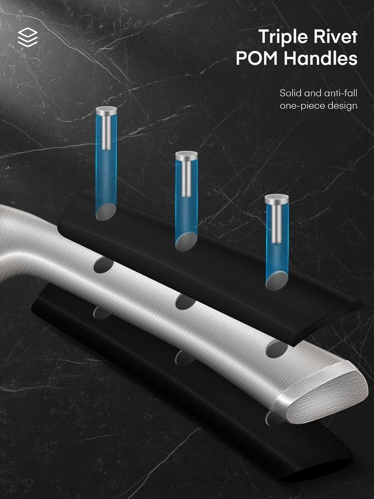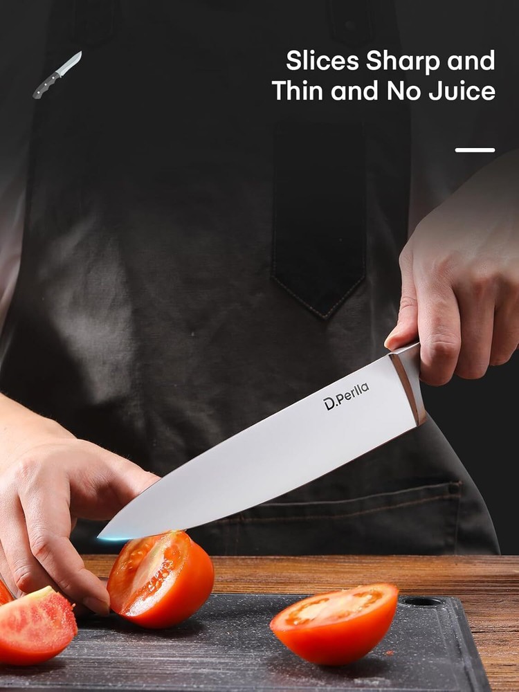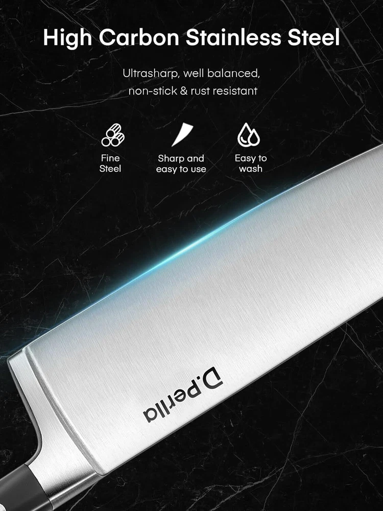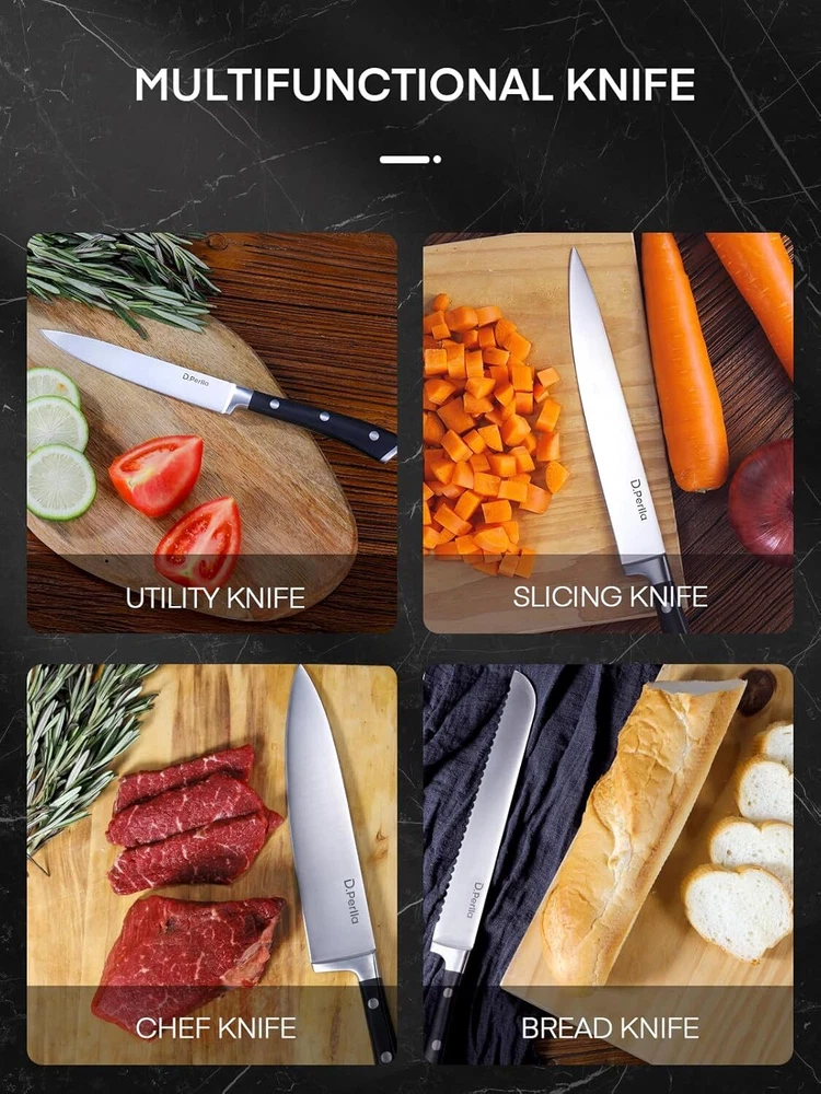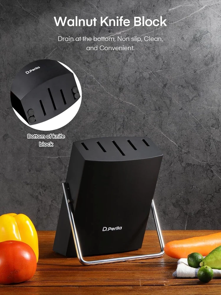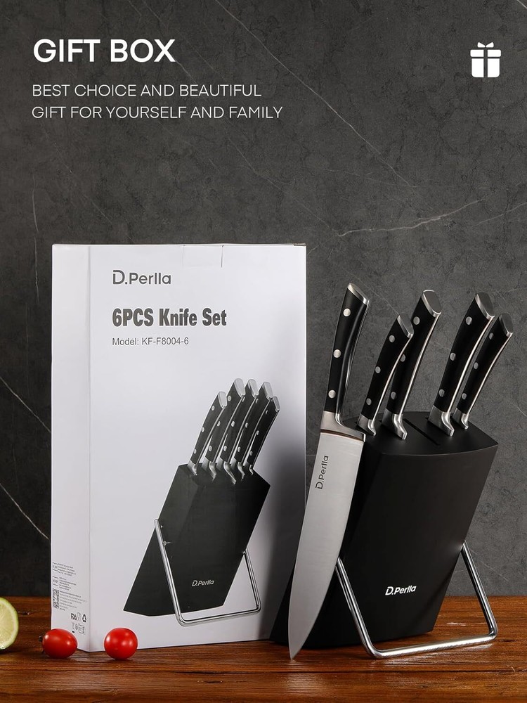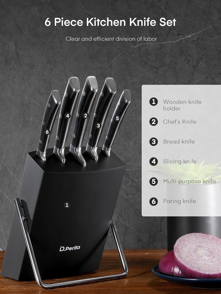 Product Description Knife Set, 6 Pieces Small Kitchen Knife Set with Block, German Stainless Steel Knives Set, Sharp Chef Knife Block Set, Black 6 PCS Compact Kitchen Knife Set: The classic-looking set includes the most useful knives for home-kitchen use, a black coated Acacia wood block, 8” Chef’s Knife; 8” Slicer Knife; 8” Bread Knife; 5” Utility Knife; 3.5” Paring Knife. Ultra Sharp & Sturdy Blade: Each blade edge is 15 ° per side for precise cutting, slicing and peeling. Forged from 1.4116 imported German Stainless Steel that is hard and resistant to stains and rust. Tri-Rivet Construction & Ergonomic Handle: The non-slip handle is ergonomically crafted for complete comfort and the bolster of one piece steel is strong and sturdy , thereby ensuring total control and stability.You can effortlessly use the kitchen knives when cooking! Space Saving Knife Block: Black coating provides a better protection against stains.All kinds of knives are placed in the convenient wooden block.Your countertop in the kitchen will become neater and cleaner than before. Easy to Clean and Care: To protect the sharpness and glossiness of the knives sets, we recommend hand wash.We’re dedicated to enhance your cooking experience. If you have any problem about it, please feel free to contact us. About Us We are a reputable seller with many years of experience selling on eBay. Our goal is to provide high-quality products and excellent customer service. Shipping Items will be shipped within 1-3 business days when we received payment. (Orders are not processed on weekends & holidays) Tracking information will be sent once item is shipped. Delivery time depends on destination and other factors Item is shipped to ebay address. Leaving correct address can minimize delay. For international shipping and shipping to Guam, Hawaii and Alaska, Please contact us before placing the order. International buyers please note: Import duties, taxes and charges are not included in the item price or shipping charges. These charges are buyer’s responsibility. We will try our best to reduce the risk of the custom duties. Local pick-up is unavailable at the moment. Contact Us We reply any email messages within 1 business / working days(off-duty at weekend). If you do not get a response from us, then please check your junk or spam mailbox. Our Business hours: Mon-Fri 9:00-18:00, UTC/GMT +8 hours. Please contact us either by clicking "contact seller" in the "purchase history" section or simply click "ask a question" at the bottom of this page. If you are unsatisfied with our item or service, please contact us before leaving any feedback. We are committed to resolve all issues in a friendly and satisfactory manner.