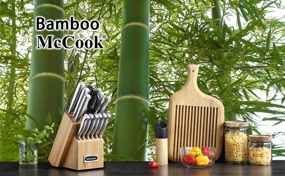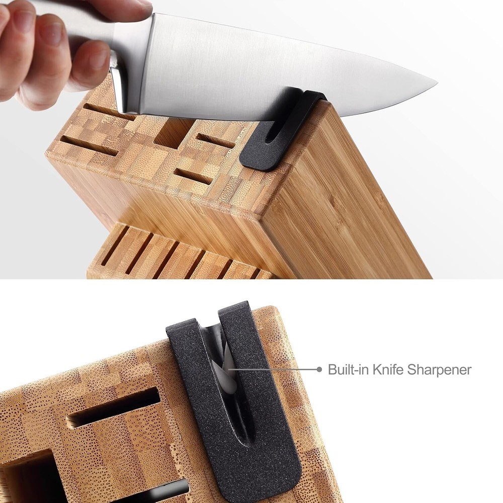 Knife Sets,German Stainless Steel Knife Block Sets with Built-in Sharpener PREMIUM KITCHEN KNIFE SET - Tarnish-resistant and rust-resistant, this high carbon stainless steel cutlery set is of restaurant and culinary school knife set quality. WORLD CLASS KNIFE SET - Exclusive taper grind edge technology provides optimum sharpness for precise cutting and is easy to re-sharpen. It saves you the trouble of finding a sharpener and sharpening your knives on a whetstone, which makes great conveniences for you. EASY TO STORAGE - All knives store safely in the knife block with built-in sharpener for space efficient storage. VALUE SET - 15 pieces knife set includes: 8" chef knife, 8" slicing knife, 5" fine edge santoku knife, " serrated utility knife, 5" utility knife, " paring knife, 6pcs " serrated steak knives, 2 pairs of kitchen shears, and knife block with built-in sharpener EASY CARE - The kitchen knife set with block is easy and fast to clean. To protect the sharpness and glossiness of the knives, please DO NOT wash the knives in dishwasher. Clean and dry them immediately after hand washing to get the most out of them.