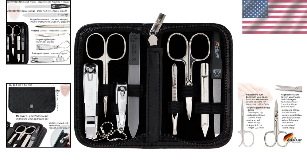 German-Made 8-Piece Nail Care Set with Stylish Gift Box - Perfect for Gifting ‹ › ‹ › ‹ › ‹ › ‹ › ‹ › ‹ › ‹ › German-Made 8-Piece Nail Care Set Elevate your grooming experience with our exquisite Nail Care Kit, crafted by the renowned artisans of Solingen, Germany. This set encapsulates the pinnacle of quality, combining professional-grade manicure and pedicure tools with a modern design and luxurious details. What's Included? Nail Scissors Cuticle Scissors Finger Nail Clipper Toe Nail Clipper Tweezers Double-Sided Glass Nail File Fine and Coarse Sapphire Nail File Nail Pusher/Cleaner Exceptional Craftsmanship: Handmade steel implements featuring bright nickel plating for corrosion protection Polished and hardened tools for maximum durability Thoughtfully packaged in an elegant gift box, perfect for any occasion Stylish, Practical Case: Luxurious synthetic leather construction in a sophisticated black ostrich finish Compact size: approximately 14.0 x 8.0 x 3.0 cm for easy storage and travel Included microfiber cleaning cloth for maintaining the pristine condition of your tools The Perfect Gift: Our nail care set is an unparalleled choice for those seeking a thoughtful, elegant present. Ideal for birthdays, holidays, anniversaries, and special occasions such as Mother’s Day or Valentine’s Day. It caters to both men and women, making it a versatile addition to anyone's grooming collection. Customer Satisfaction: We stand by the quality of our products and pride ourselves on first-class customer service. If you have any questions or concerns, please contact us directly—we are always here to find a solution tailored to your needs. Transform your nail care routine with our German-Made 8-Piece Nail Care Set and indulge in a world of luxurious grooming today! Shipping Free & Fast Shipping - We offer free shipping to most of the USA with a normal delivery time of 3-7 days. However, due to the current situation, additional delivery time (up to 3 weeks) may be required for some items. Alternative Carriers - We may use alternative carriers (e.g. USPS, FedEx, UPS, etc.) to ensure your package arrives safely and on time. Due to the use of multiple carriers, we are unable to provide a tracking number automatically. Handling Time - Orders are processed and shipped within 1-2 business days of receiving cleared payment. Shipping Restrictions - Shipping to Alaska, Hawaii, Puerto Rico, Guam, and other US territories may incur shipping charges or delivery restrictions. Please contact us before ordering, or your order can be refunded/cancelled. State Restrictions - There may be restrictions based on your state of purchase. For example, certain items may not be shipped to California due to state regulations. Contact for Tracking Updates - If you require tracking updates or have any concerns about the delivery of your order, please feel free to contact us, and we will be happy to assist you. Return 30-Day Hassle-Free Returns - We want you to be completely satisfied with your purchase. If you are not, you can return the item within 30 days of receiving it for a full refund or exchange. Easy Return Process - To start a return, simply contact us and we will provide you with a prepaid return shipping label and detailed instructions. Restocking Fee - There are no restocking fees for returns. However, the buyer is responsible for return shipping costs if the return is not due to a seller's error. Refund Processing Time - Refunds will be processed within 5 business days of receiving the returned item in its original condition. Payment We accept all major credit cards, PayPal, and Apple Pay for your convenience. Your payment information is secure and encrypted to ensure a safe and seamless transaction. Please complete your payment within 3 days of purchase to avoid any delays in shipping. Feedback Your feedback is extremely important to us. We strive to provide the best products and customer service possible. If you are satisfied with your purchase, please take a moment to leave us a positive review. If you have any concerns or issues with your order, please contact us before leaving negative feedback. We are committed to resolving any problems and ensuring your satisfaction. Contact Us If you have any questions or concerns, please feel free to reach out to our customer support team. You can contact us through the eBay messaging system. We are available Monday to Friday, 9:00 am to 5:00 pm EST, and we will do our best to respond to your inquiry within 24 hours. Buy it now and enjoy a pleasant shopping experience! UPC: Not Set Unit Quantity: 1 Set Includes: Cuticle Scissors,Tweezers,Nail Scissors,Finger Nail Clipper,Toe Nail Clipper,Glass Nail File (Double Sided),Nail Pusher/Cleaner Material: Steel,Synthetic Leather,Nickel Plated Features: Double-Sided,Hand Made,Polished,Hardened,Corrosion Resistant,Stylish Design,Durable,Gift Box Included Brand: Unbranded Type: Manicure Pedicure Grooming Kit Power Source: Manual Power: Not Set MPN: Not Set Color: Black Country/Region of Manufacture: Not Set Model: Not Set Unit Type: oz Personalize: Not Set