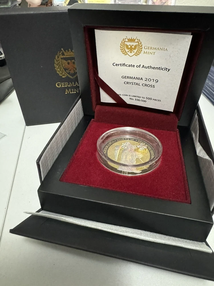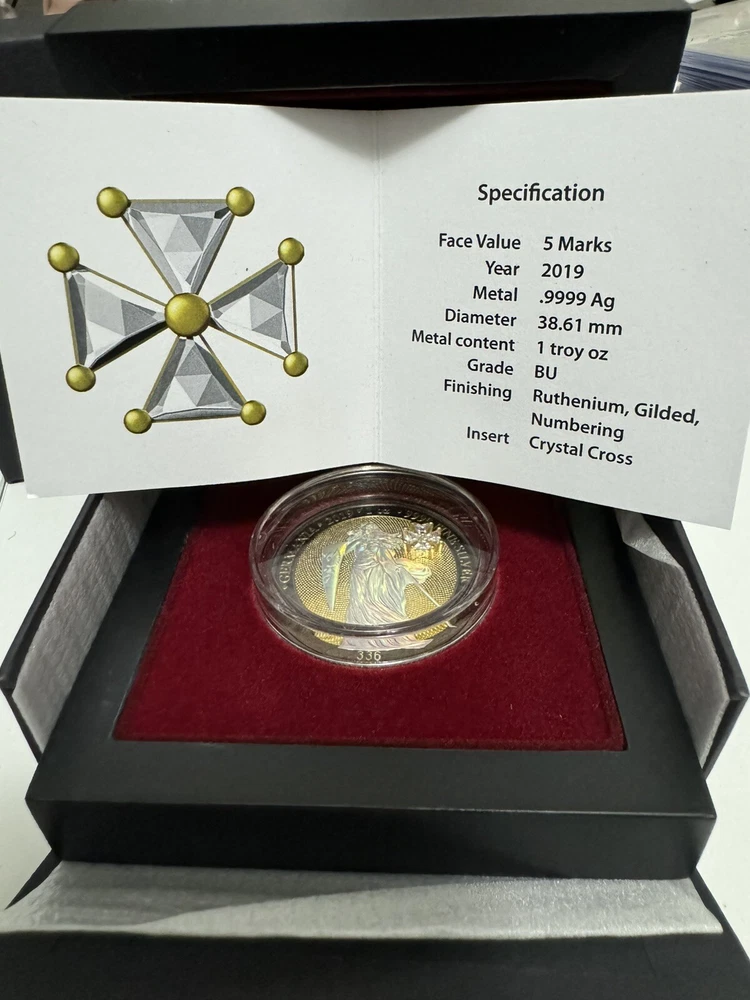 This stunning 1 oz silver coin from Germania 2019 is a must-have for any collector. The Crystal Cross design features intricate detailing and is limited to only 500 pieces. This particular coin is numbered 336/500 and comes with a COA certification. The composition of the coin is pure silver, making it a valuable addition to any collection. It is also uncertified, adding to its unique appeal. The coin comes in a protective case, ensuring its quality is maintained. Don't miss out on the opportunity to add this beautiful piece to your collection.
