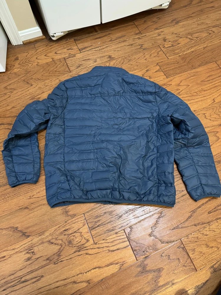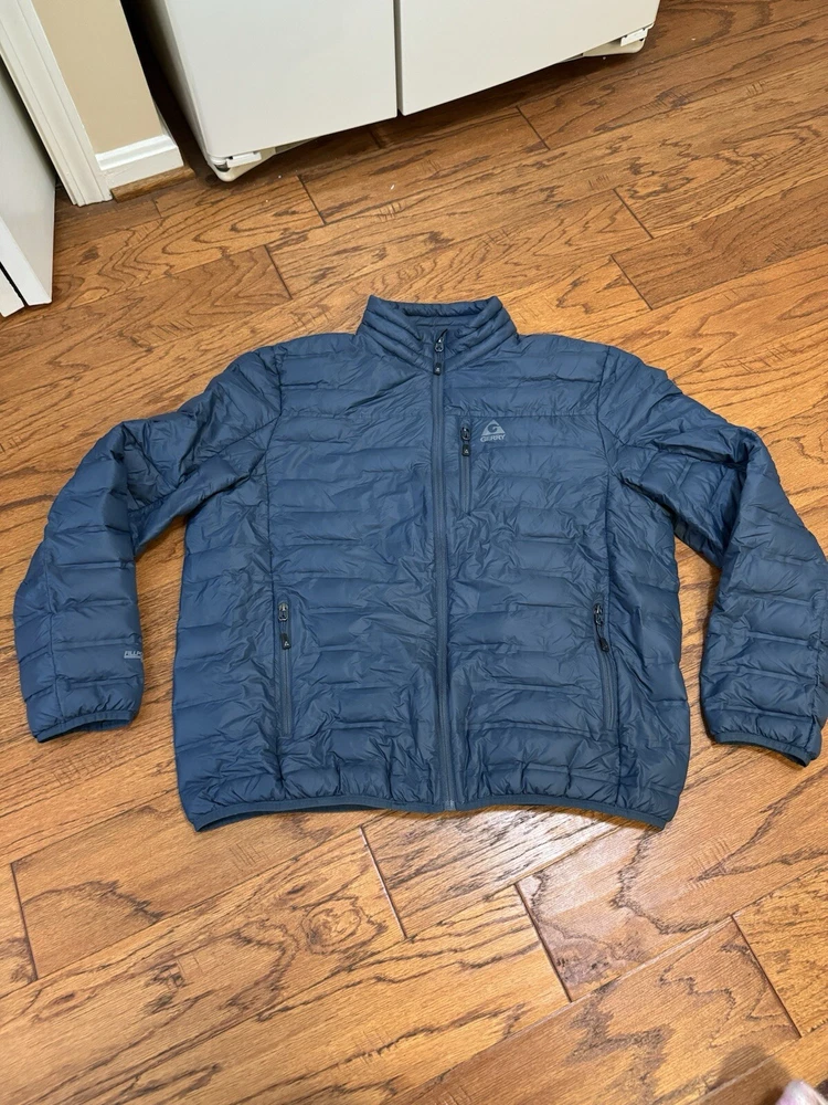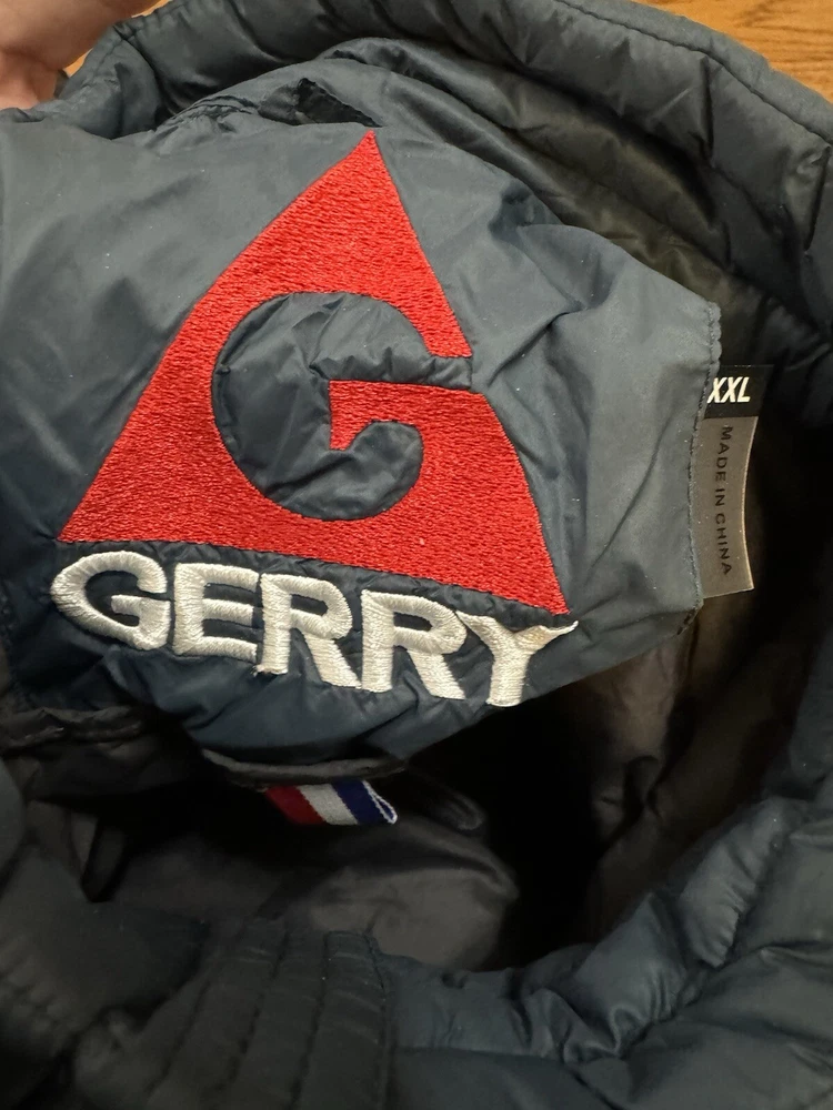 This Gerry down jacket for men in size 2XL features a lightweight and packable design with 650 fill power for warmth. The jacket is blue with a full zip closure and a stand-up collar. It is suitable for travel and casual wear, ideal for outdoor activities like walking and hiking. The jacket has a solid pattern, nylon outer shell and lining, and includes pockets for convenience.