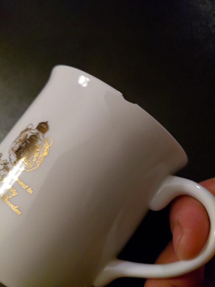 Small chip as seen in photos around rim of cup. The Gevalia Kaffe His Majesty The King of Sweden Coffee Mug Tea Cup is a vintage collectible featuring a traditional design with an embossed royal crown. Made of gold ceramic and porcelain, this round medium-sized mug is suitable for both hot and cold beverages. Perfect for all occasions, this unique piece is a great addition to any kitchen or home decor. Gevalia Kaffe, a Swedish coffee brand, originally manufactured this coffee mug in the 1970s, making it a special item for collectors of advertising and topographical souvenirs.