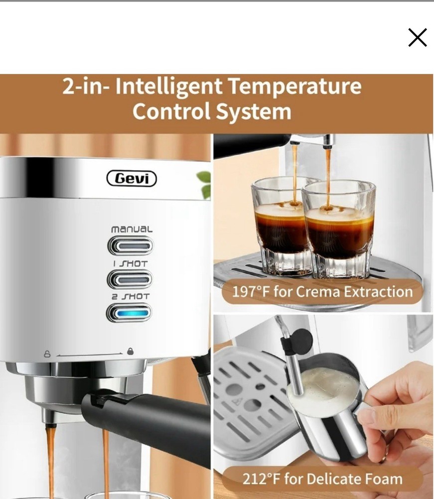 levate your coffee experience with the Gevi 20 Bar Automatic Espresso Machine. Featuring a powerful 1350W Thermoblock heating system, this machine can brew espresso or froth milk in just 45 seconds. Customize your drinks with the 3 cup size options, and enjoy the convenience of the 40.58 oz water tank and the stability of the 360-degree rotating milk frother wand. Crafted with a sleek white plastic design, this espresso machine delivers professional-grade coffee shop quality in the comfort of your own home. Enjoy a professional-grade coffee shop experience at home with the Gevi 20 Bar Automatic 40-Cup White Espresso Machine. Featuring a powerful 20 Bar high-pressure pump, this machine delivers fast and stable extraction, resulting in rich, flavorful espresso with a thick crema. The advanced 1350W Thermoblock Fast Heating System allows you to brew espresso or froth milk in just 45 seconds, ensuring your drinks are always hot and ready to enjoy. Customize your coffee with the three cup size options, allowing you to manually control the amount of espresso to suit your preferences. The 40.58 oz / 1.2 L water tank capacity provides ample capacity for multiple servings, while the 360-degree rotating milk frother wand ensures stable and consistent milk frothing. Crafted with a sleek white design, this espresso machine weighs 7.28 lbs and measures 12.2 x 6.1 x 12.2 inches, making it a compact and stylish addition to your kitchen. Powered by a 1350W wattage and equipped with a 20 Bar Italian ODM Pump pressure system, this espresso machine delivers professional-quality results every time. The package includes the Gevi ECME0-WH0A2 Espresso Machine with Milk Frother, a 1.5L oz Removable Water Tank, a 51 mm Portafilter, a 1 shot funnel, and a 2 shot funnel.