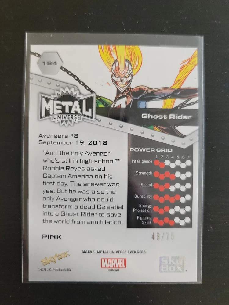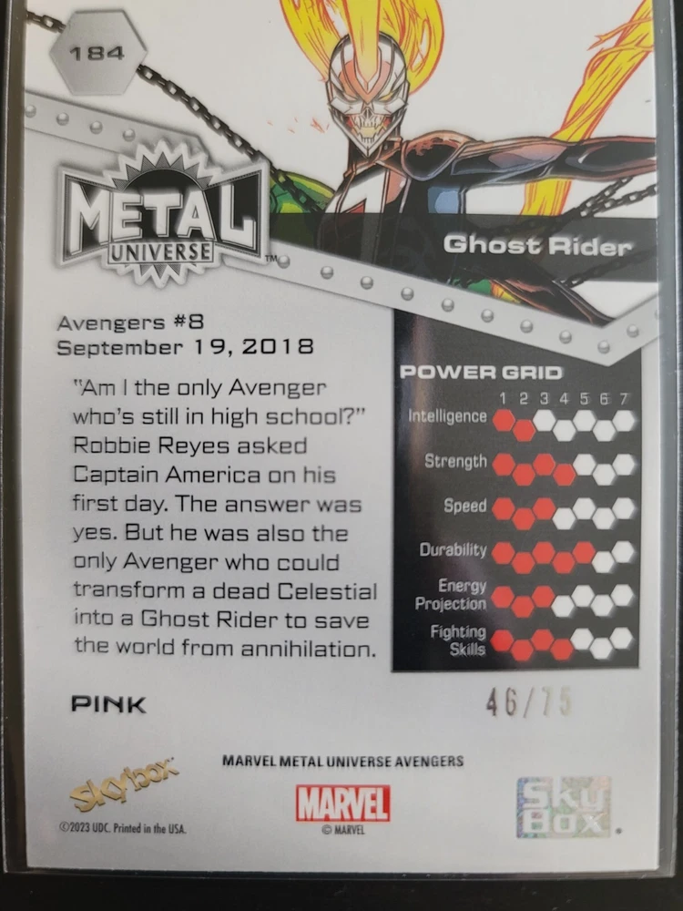 Combine shipments are welcome. Please wait for my Invoice before you make the payment once you combine the shipment. Each combine shipment, extra item will add USD$1 for the combining. Ex: Extra 1 item: add $1, Extra 2 items: add $2. Dive into the Marvel Metal Universe with the Ghost Rider Skybox Pink FX card, a must-have for fans and collectors alike. This non-sport trading card, numbered 184, features the iconic Ghost Rider in stunning detail, complemented by the rarity of the Pink FX parallel variety. With its serial numbering ensuring uniqueness, this card is a standout piece, especially for those who value exclusivity. Crafted with care by SkyBox, this card comes from the high series of the Marvel Metal collection and is a tribute to the Avengers franchise. It's a true original, devoid of autographs, and presented in English. Whether you're a devotee of the Avengers TV show, the Ghost Rider movie, or a connoisseur of intricate card design, this Pink FX insert set card encapsulates the essence of both.