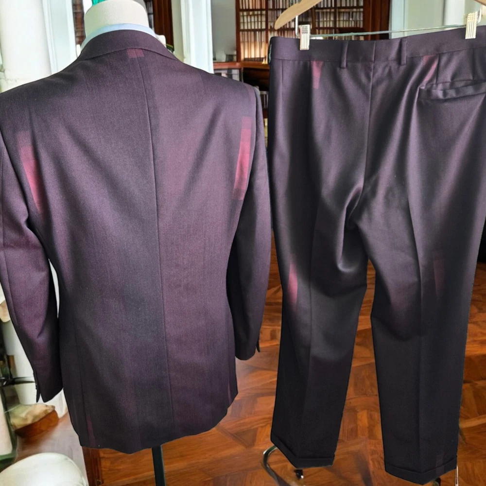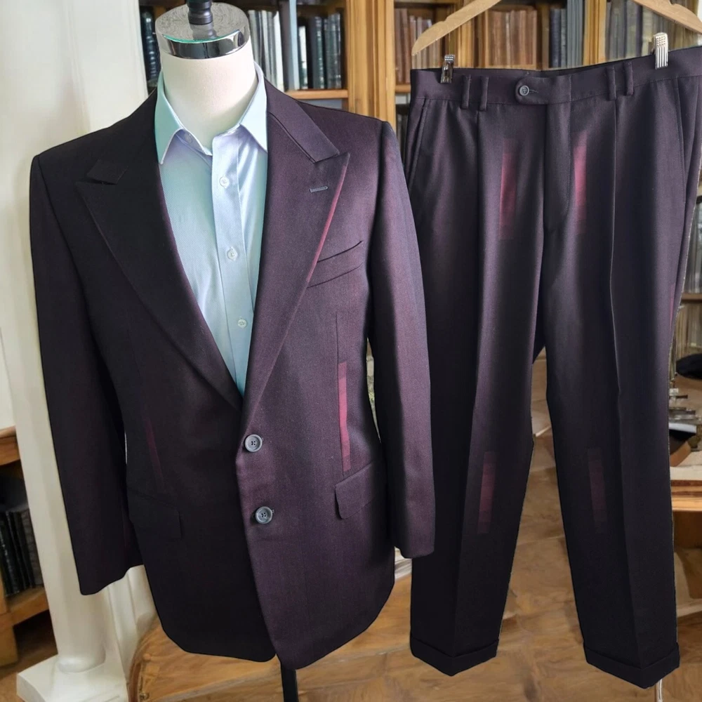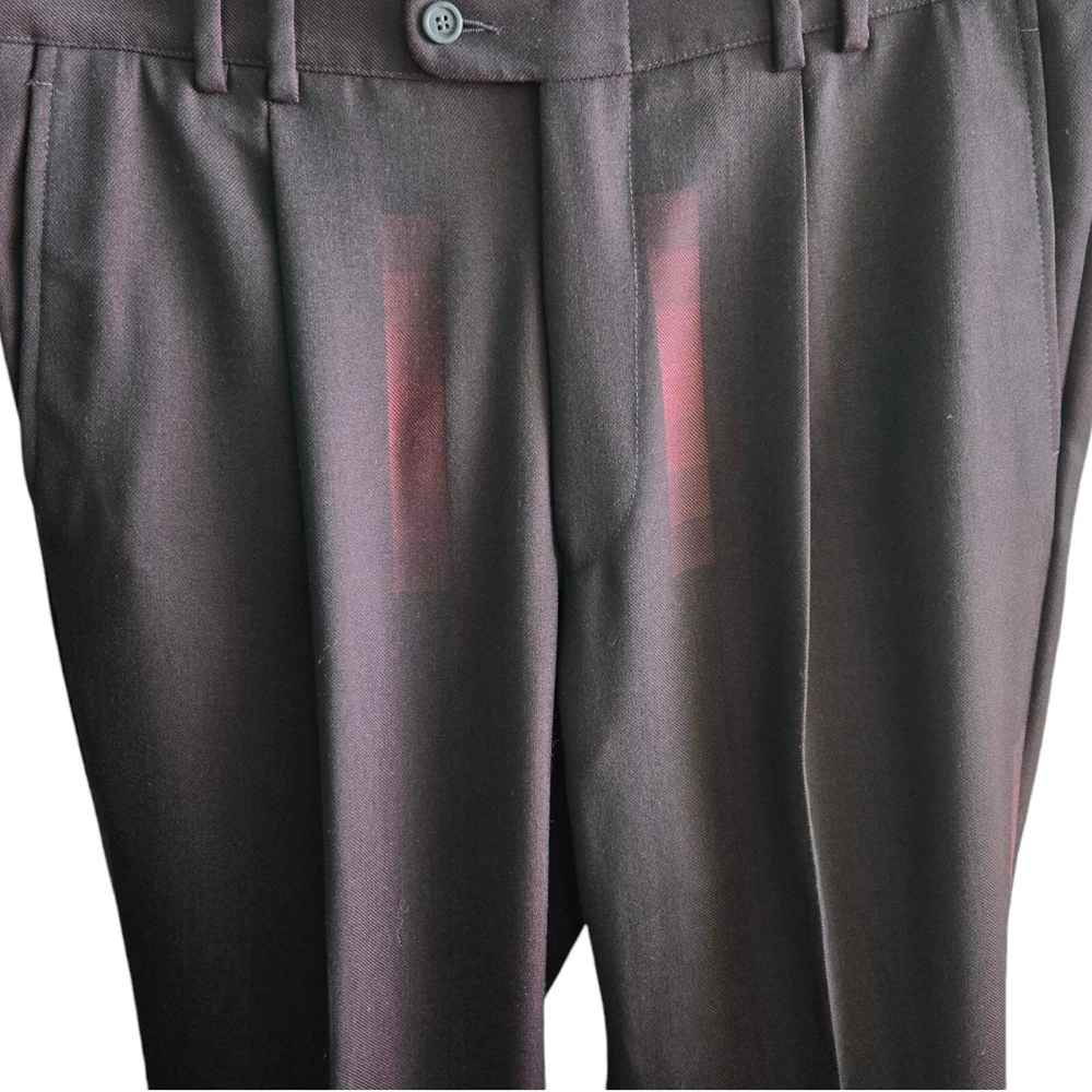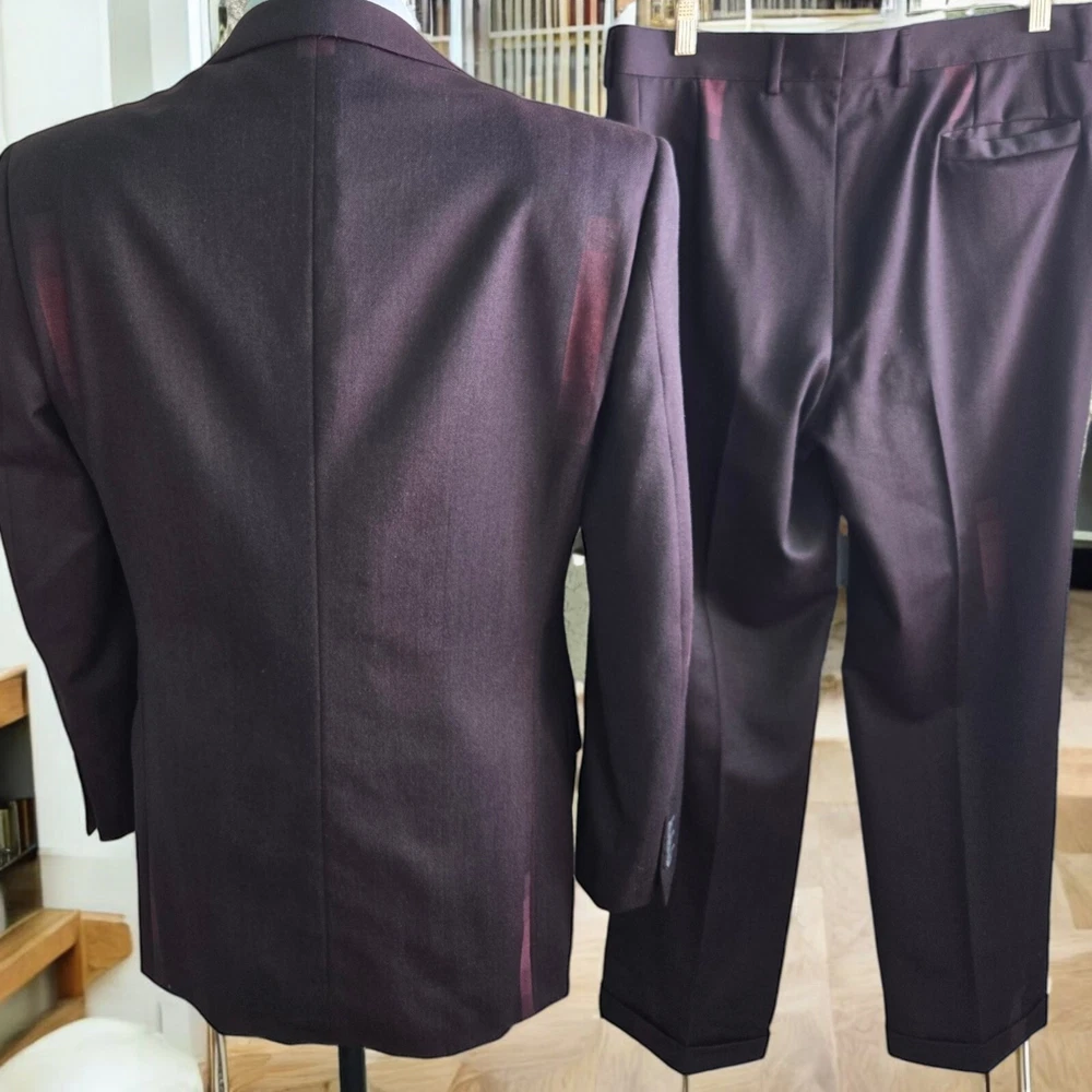 Condition: Excellent. No signs of use were found. Size and material tag still crispy. Extra buttons are still in the chest pocket. No holes. No stains. No snags. No smells. Color: wine red sharkskin with black undertones and red oversized stripes For measurements, see photos #2 and #3 To see exactly how we measure, see the last series of photos. Extra fabric for adjustments: Waist: 2 inches Inseam: 0 Arms: 1 inch We ship the next business day after the payment is made. Please note this is a vintage 1990s cocktail or dinner suit. It is a loud pattern.