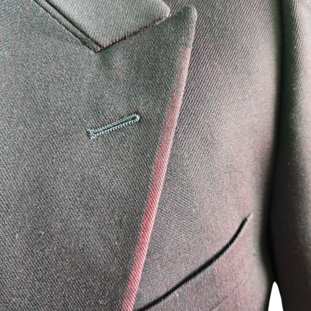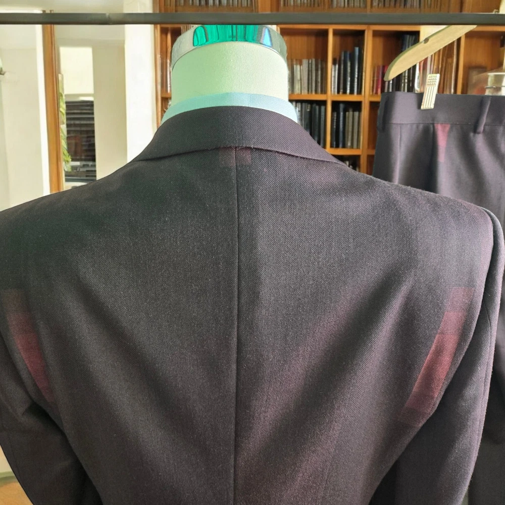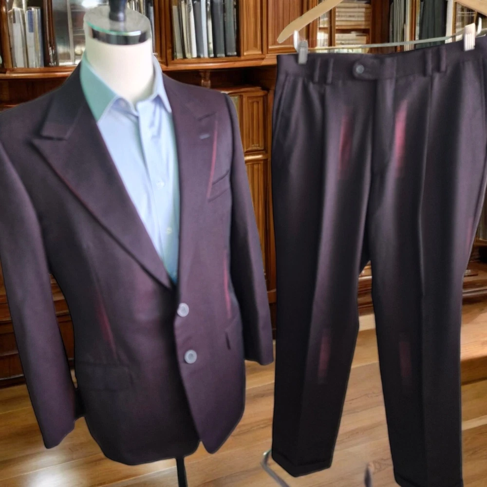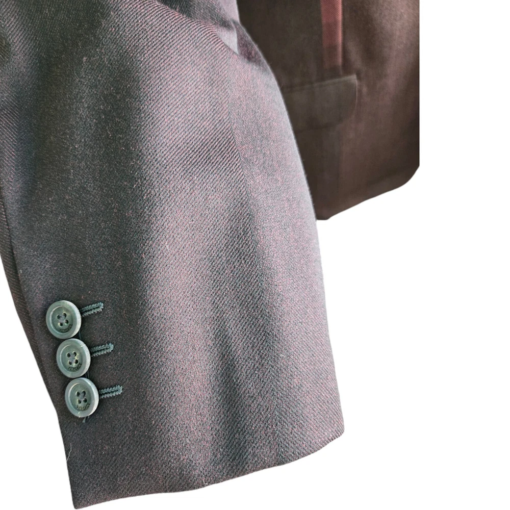 Condition: Excellent. No signs of use were found. Size and material tag still crispy. Extra buttons are still in the chest pocket. No holes. No stains. No snags. No smells. Color: wine red sharkskin with black undertones and red oversized stripes For measurements, see photos #2 and #3 To see exactly how we measure, see the last series of photos. Extra fabric for adjustments: Waist: 2 inches Inseam: 0 Arms: 1 inch We ship the next business day after the payment is made. Please note this is a vintage 1990s cocktail or dinner suit. It is a loud pattern.