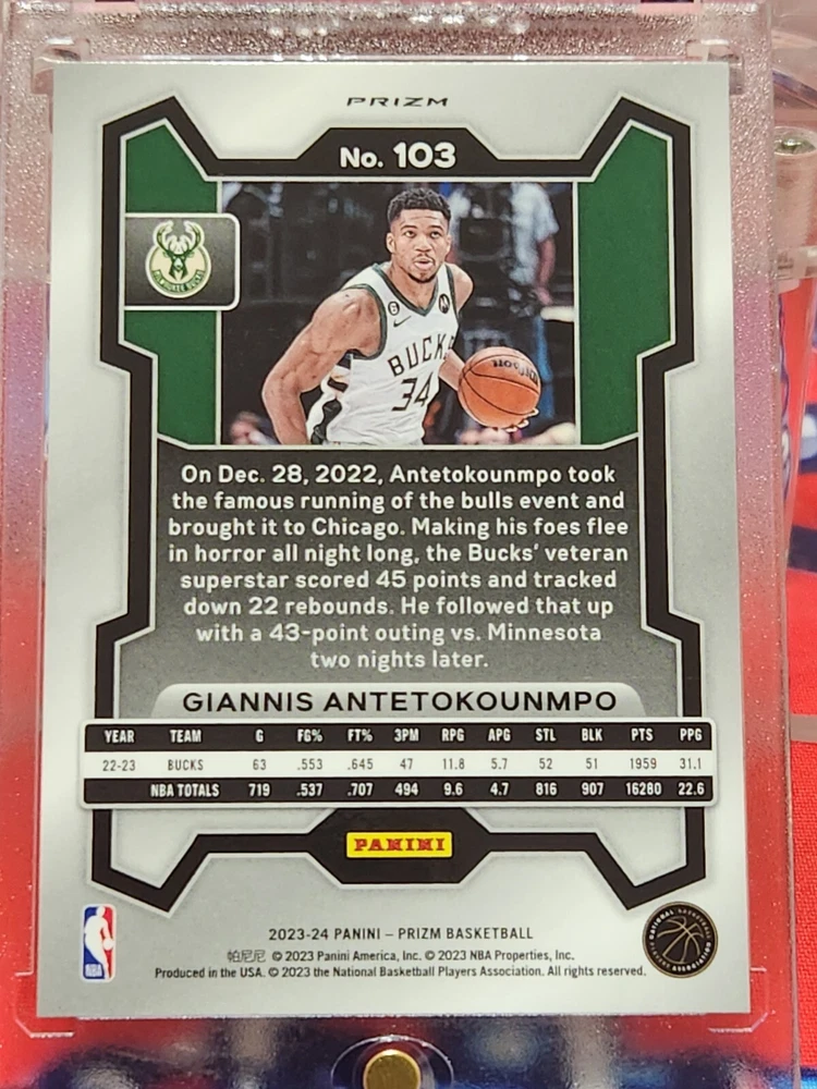Manufacturer: Panini League: National Basketball Association (NBA) Season: 2023 Player/Athlete: Giannis Antetokounmpo Set: 23-24 Panini Prizm Card Name: Prizm Card Number: 103 Team: Milwaukee Bucks Features: Short Print Type: Sports Trading Card Parallel/Variety: Cracked Ice Sport: Basketball Autographed: No