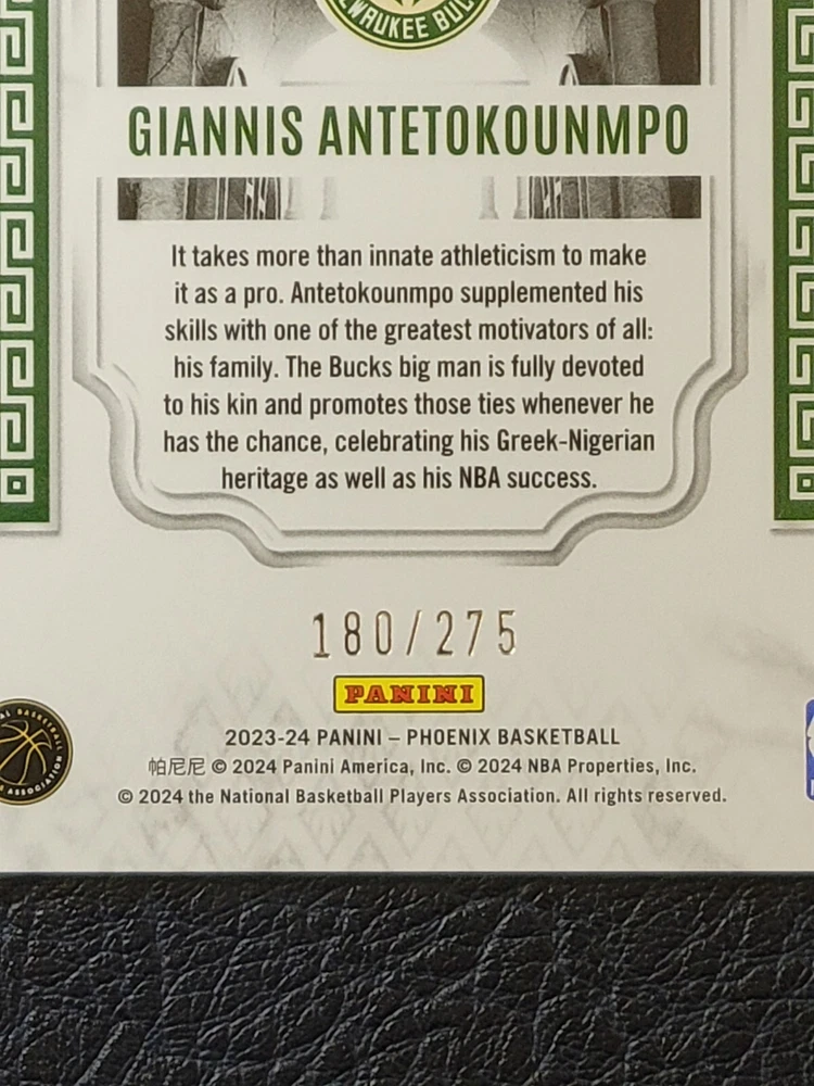 This Giannis Antetokounmpo 2023-24 Phoenix Temple Men Blue Lazer trading card is a must-have for any NBA fan. With a limited edition of only 275 cards produced, this card is a rare find and perfect for collectors. The card features a stunning blue laser design that is sure to catch the eye of any collector. The card is made of high-quality card stock and is serial numbered as 180 out of 275. It is an insert card from the 2023-24 Panini Phoenix set and is perfect for anyone who loves basketball trading cards. This card is not autographed but still holds great value. Get your hands on this unique card and add it to your collection today!