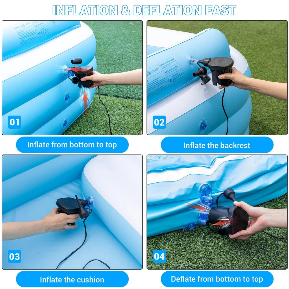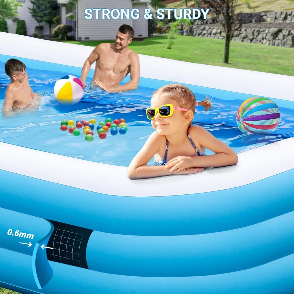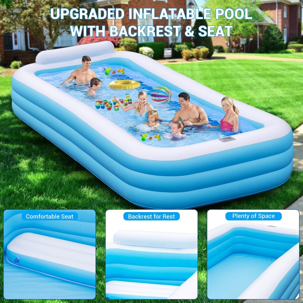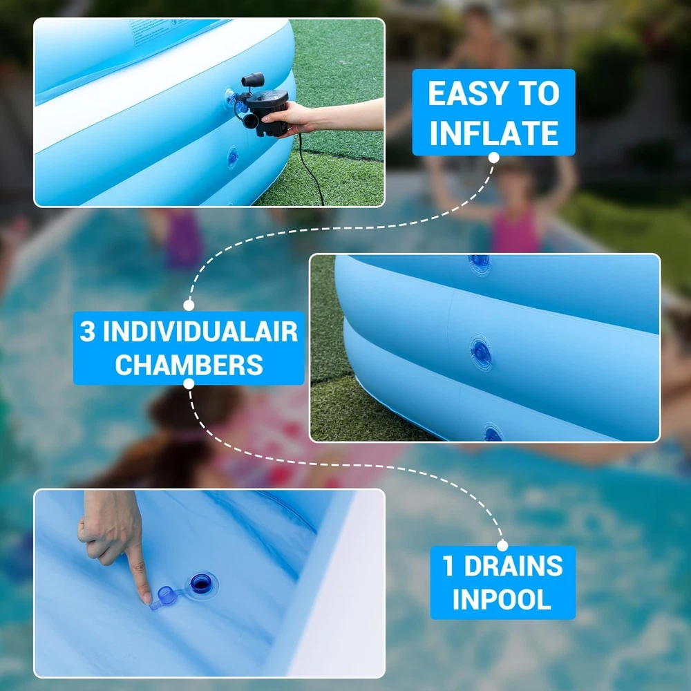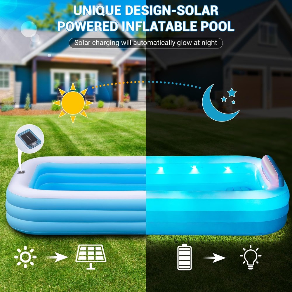 Inflatable Pool Large - 145'' X 74'' X 22'', Oversize Blow Up Pool with Pump (Blue) Large Inflatable Pool - Our super large swimming pool measures 145 "X 74" X 22 ", with a capacity of 744 gallons, and can accommodate up to 6 adults simultaneously 0.6mm Thickened Material - The blow up pool is made of 0.6mm thickened material to prevent puncturing. You can enjoy the cool summer with your pet Inflatable Seat and Backrest - The inflatable swimming pool features comfortable inflatable seats and backrests, providing a better experience for your summer water parties Solar-Powered & Color Changing - The inflatable pool equipped with led lights, and the solar panels can be charged during the day, with up to 12 hours of lighting after a fully charged. And the LED lights has 7 color changes and 4 light modes, addding more fun to your family swimming pool 3 Air Chambers - The 3-chamber inflatable swimming pool has 3 independent chambers, each of which is inflated separately. Such a structure is more stable and less likely to collapse 3-5 Minutes Inflation - Just need 3-5 minutes to inflate the whole pool. Then add water to about 70-80% of the pool's capacity and have fun with your family(Pump Included) For All Summer Activities - Our inflatable swimming pool can be used not only as an outdoor pool, but also as an indoor ball pool and fishing pool, so that you and your family can fully enjoy the warmth of home. Best Summer Gift - The inflatable swimming pool is the perfect gift for your friends and family. This rectangular inflatable pool is perfect for your birthday party, water party or family picnic What You Get - 1 Large Family Pool, 1 Use Manual,1 Electric Air Pump, 3 Patches