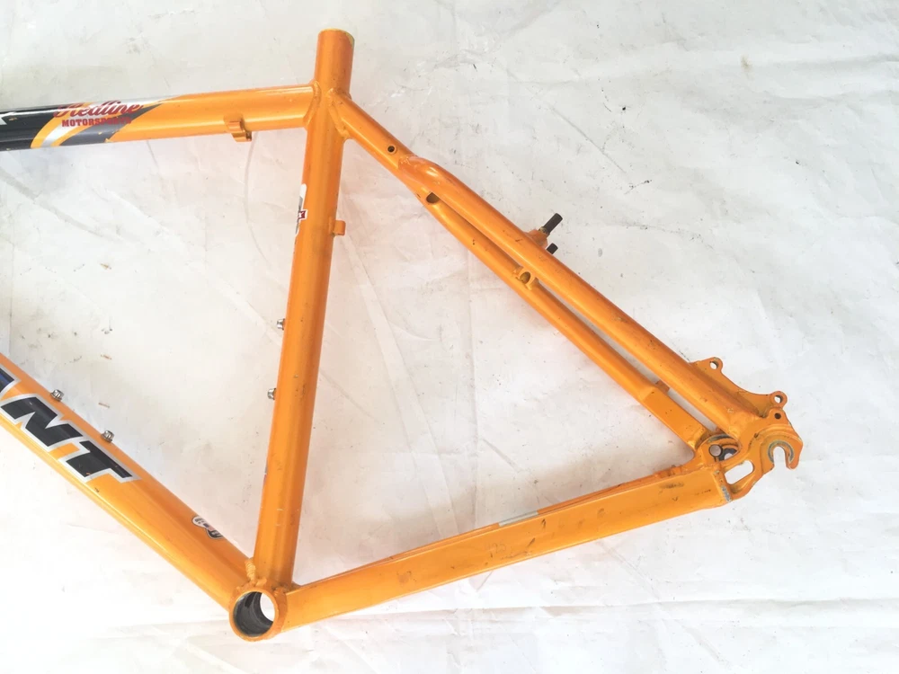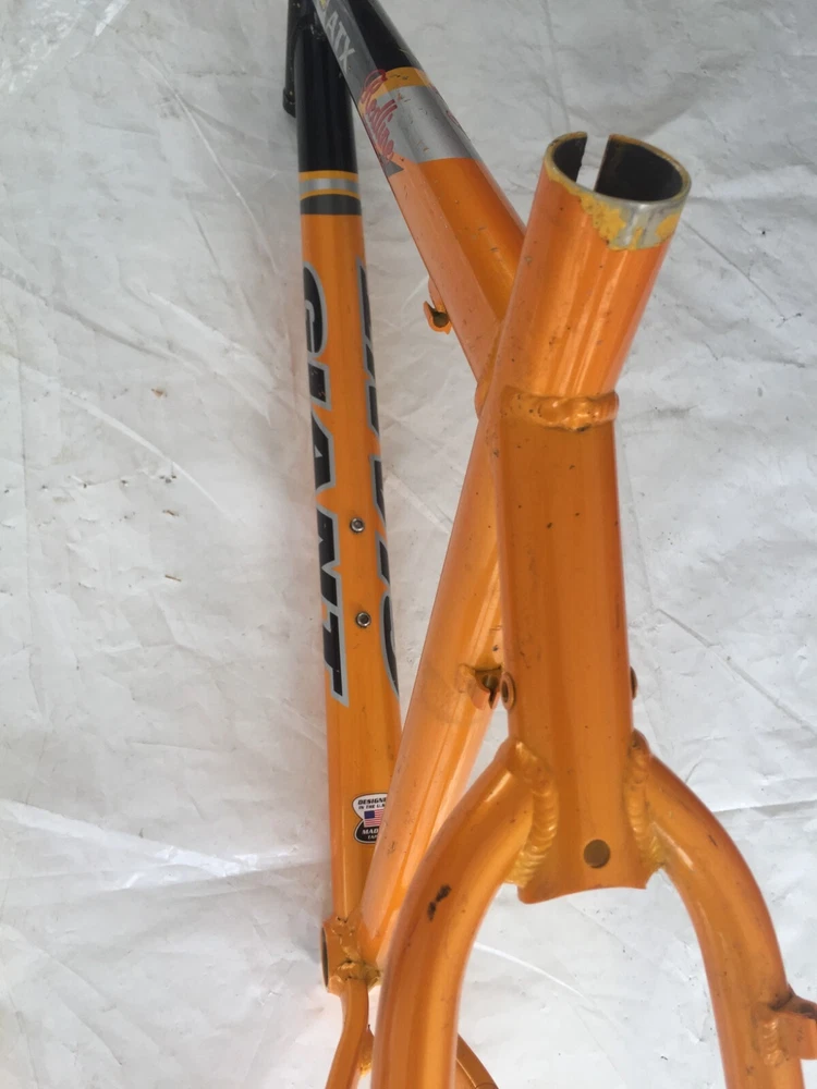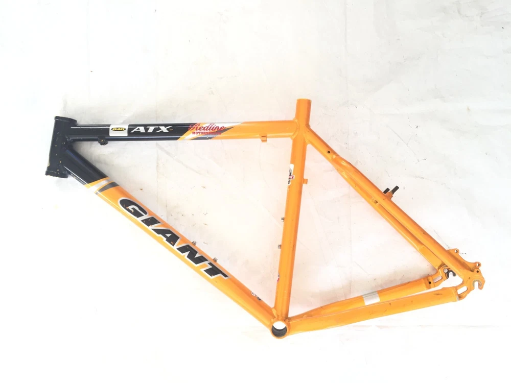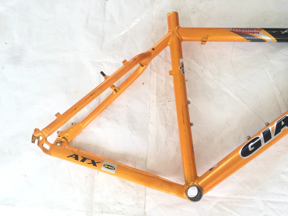 Giant ATX 840 mountain bike frame, for 26 inch wheel size. It says Large frame 21 inch frame I think its 1997 year or maybe 2003, not sure. No cranks, frame only. Light weight aluminum racing frame, hard tail 1.747 kg frame 425 chain stays It looks like roughly 600mm horizontal top tube. The lower head tube was slightly dented at the race at the front part, but I was able to bend it back to the original diameter and file it slightly. This should not affect anything when putting the bearing races in. Its back close to where it should be. Head tube 44mm inner diameter where the races go. No derailer hanger, but those can be found easily. Spares at bike store or online. Free Shipping to mainland USA 48 states & Canada. If outside that contact me for shipping price. Buyer Is Responsible to Make Sure Parts Fit their Application.