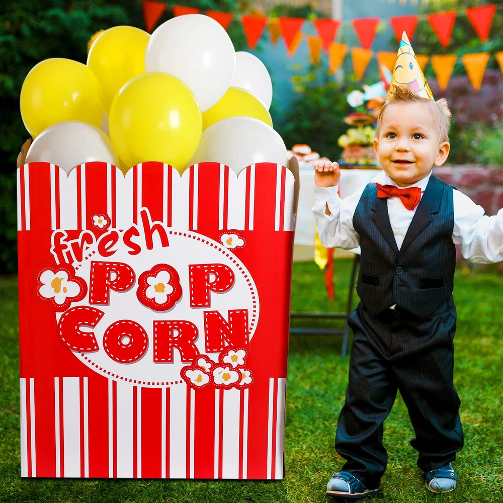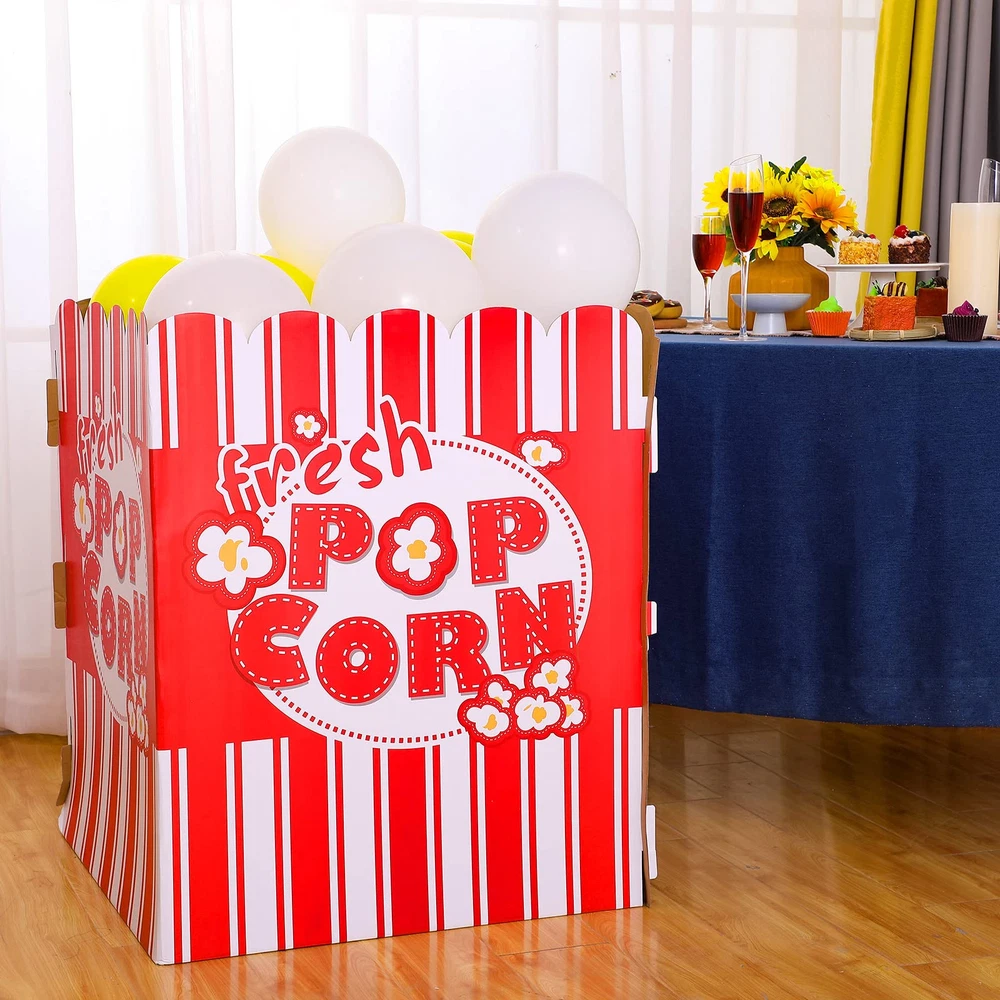 Package Content: you will receive a popcorn balloon box, 20 white balloons and 20 yellow balloons, an exquisite combination for you to meet various needs of decoration, you could also send them as gifts to other people Large size: the size of the balloon box is about 80 x 65 x 65 cm/31.5 x 25.6 x 25.6 inches; They are large enough to be a charming decoration for some occasions, but they are folded, so you need to install them before using the box; Please note: at each interface, the bayonet and its corresponding reserved opening need to be spliced to ensure the normal use of the product; If the connection is not too tight, additional hot melt adhesive or tape needs to be added for fixation 3D Style: the large party props adopt 3D stand up design and it looks like a very large popcorn box with popcorn, a nice decor for movie night, carnival, party and more, creating a funny and interesting atmosphere for you Photo Prop: the vivid design and bright color of popcorn decorations are suitable as a photo prop, no matter if you wear a shirt or dress, it will easily match your clothes, making your photo distinct and charming, both children and adults will love it Wide Application: the popcorn box can be widely adopted on many different occasions such as Children's birthday parties, schools, corporate events, incentive programs, fairs, festivals, parties and more, it will help to drive the scene atmosphere