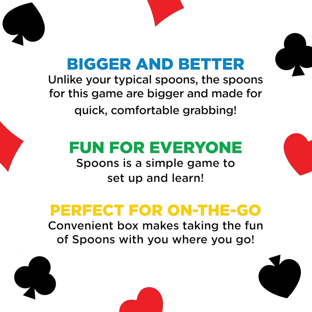 CLASSIC GAME—Enjoy the classic game of Spoons with large spoons included BIGGER AND BETTER—Unlike your typical spoons, the spoons for this game are bigger and made for quick, comfortable grabbing FUN FOR EVERYONE—Spoons is a simple game to set up and learn PERFECT FOR ON-THE-GO—Convenient box makes taking the fun of Spoons with you where you go a breeze COMES WITH EVERYTHING YOU NEED—Never worry about not having the spoons you need to play ever again with the included cards, spoons, and rules It's the classic card game in giant form--well, with giant spoons anyway! Race to get four of a kind and grab a spoon if you want to stay in the game Each round someone will be left out of the spoon-grabbing fun, so remember to move fast! For 3 to 8 players, ages 7 and up Includes 1 Deck of 54 Playing Cards, 7 Giant Spoons, Rules Product Description Play this classic card game that's bigger than life! Race to get four of a kind…and you'd better snag a spoon if you want to stay in the action! Each round somebody will be eliminated, so be sharp, but be thankful that the spoons aren't! From the Manufacturer Giant Spoons The Game of Card Grabbin and Spoon Snaggin. Play this classic card game that's bigger than life! Race to get four cards of a kind... then you'd better snag a giant spoon fast if you want to stay in the action! Each round the slowest player will be left empty-handed and is out of the game.