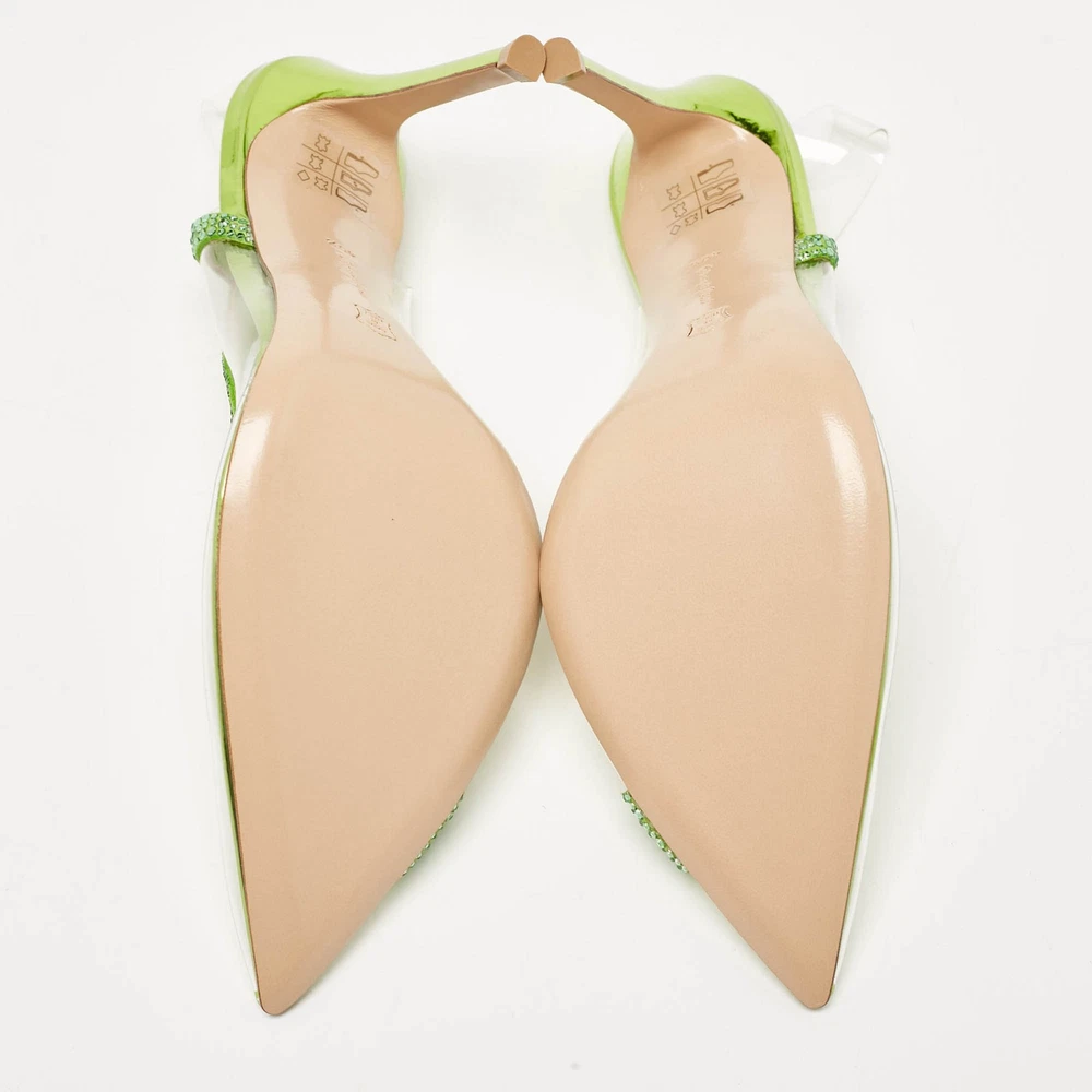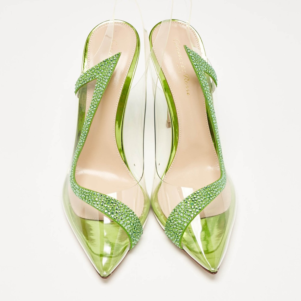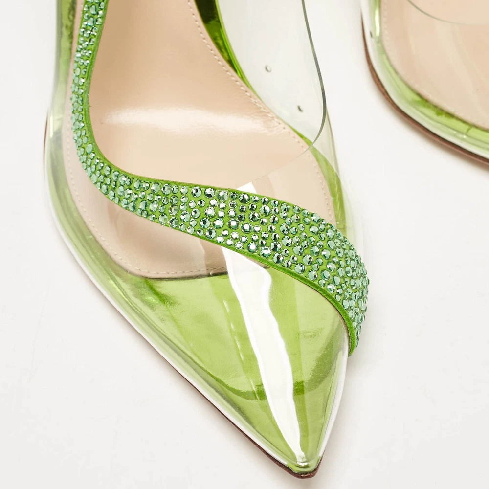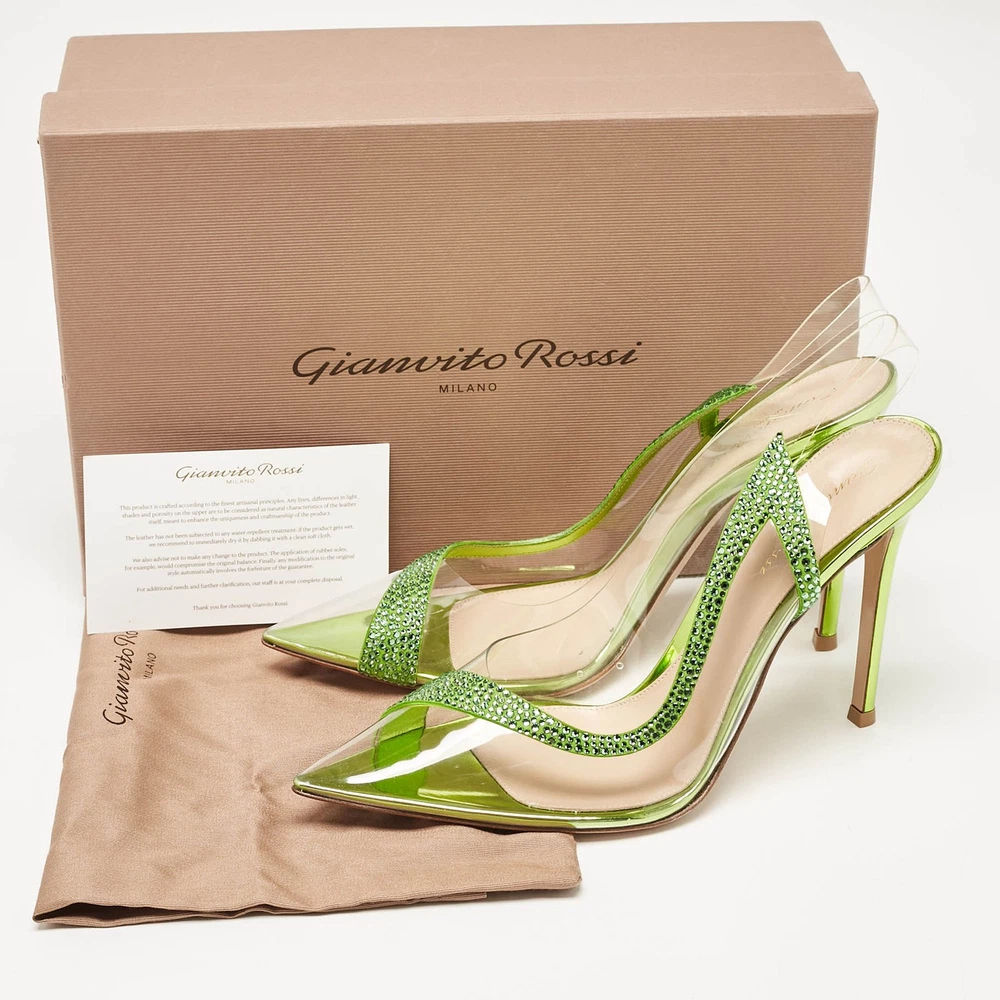 Crafted with a mix of transparent PVC and green suede, these Gianvito Rossi Hortensia pumps offer a striking embellished design. The sleek silhouette and bold details create a statement look that transitions effortlessly from day to night.Certified by The Luxury Closet - This item has gone through a detailed authentication process overseen by our experts. We offer a lifetime guarantee of authenticity on all our items. Import duties, taxes and charges are not included in the item price. These charges are the buyers responsibility. Please check with your country’s customs office to determine what these additional cost will be prior to buying. Our eBay Store About Us Contact Us Add to Favorite Sellers Gianvito Rossi Transparent/Green PVC and Suede Embellished Hortensia Pumps Size 40.5 $420.2 Crafted with a mix of transparent PVC and green suede, these Gianvito Rossi Hortensia pumps offer a striking embellished design. The sleek silhouette and bold details create a statement look that transitions effortlessly from day to night. Product Details Brand Color Transparent Dimensions Material PVC, Suede Size 40.5 Outsole Width 8 cm Outsole Length 24.5 cm Heel Height 11 cm Includes Original Dustbag, Original Box, Info Card Certified by The Luxury Closet This item has gone through a detailed authentication process overseen by our experts. We offer a lifetime guarantee of authenticity on all our items. How We Check The in-house team of experts at The Luxury Closet is highly trained to verify the authenticity and the condition of the luxury products. They ensure that only 100% authentic items are put on sale.The evaluation process is unique with its own mix of assessment criteria and differs according to the category. Each item is evaluated based on the following combination of hallmarks, hardware, stitching, symmetry, material, craftsmanship, stamping, codes, hologram stickers, and packaging. Our authenticators also check if the items have been modified or amended (e.g., aftermarket diamonds, replaced batteries, repaired bags, etc.) International Buyers Import duties, taxes and charges are not included in the item price. These charges are the buyers responsibility. Please check with your country’s customs office to determine what these additional cost will be prior to buying.