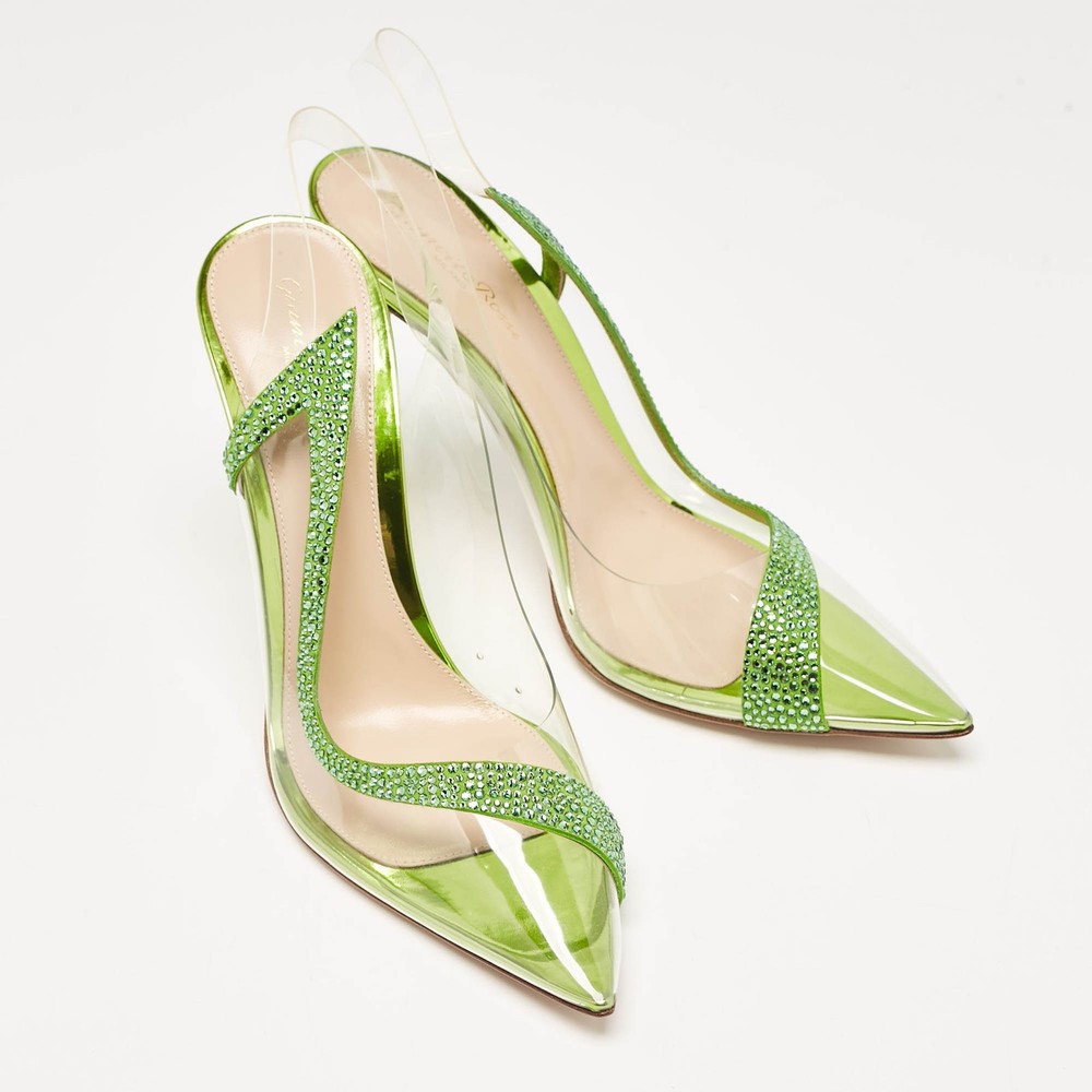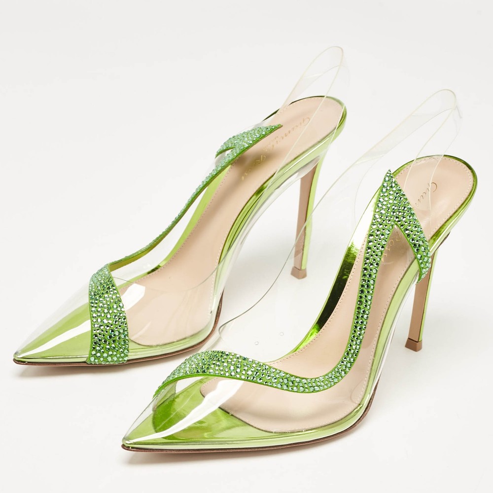 The Gianvito Rossi Hortensia pumps showcase a modern blend of luxury and innovation. Featuring a clear PVC design accented with green suede and intricate embellishments, these pumps offer a bold yet refined aesthetic. The pointed toe and slender stiletto heel create a sleek silhouette, perfect for adding sophistication to evening or formal looks.Certified by The Luxury Closet - This item has gone through a detailed authentication process overseen by our experts. We offer a lifetime guarantee of authenticity on all our items. Import duties, taxes and charges are not included in the item price. These charges are the buyers responsibility. Please check with your country’s customs office to determine what these additional cost will be prior to buying. Our eBay Store About Us Contact Us Add to Favorite Sellers Gianvito Rossi Transparent/Green PVC and Suede Embellished Hortensia Pumps Size 38 $387.2 The Gianvito Rossi Hortensia pumps showcase a modern blend of luxury and innovation. Featuring a clear PVC design accented with green suede and intricate embellishments, these pumps offer a bold yet refined aesthetic. The pointed toe and slender stiletto heel create a sleek silhouette, perfect for adding sophistication to evening or formal looks. Product Details Brand Color Transparent Dimensions Material PVC, Suede Size 38 Outsole Width 8 cm Outsole Length 23.5 cm Heel Height 10.5 cm Includes Original Dustbag, Original Box, Info Card Certified by The Luxury Closet This item has gone through a detailed authentication process overseen by our experts. We offer a lifetime guarantee of authenticity on all our items. How We Check The in-house team of experts at The Luxury Closet is highly trained to verify the authenticity and the condition of the luxury products. They ensure that only 100% authentic items are put on sale.The evaluation process is unique with its own mix of assessment criteria and differs according to the category. Each item is evaluated based on the following combination of hallmarks, hardware, stitching, symmetry, material, craftsmanship, stamping, codes, hologram stickers, and packaging. Our authenticators also check if the items have been modified or amended (e.g., aftermarket diamonds, replaced batteries, repaired bags, etc.) International Buyers Import duties, taxes and charges are not included in the item price. These charges are the buyers responsibility. Please check with your country’s customs office to determine what these additional cost will be prior to buying.