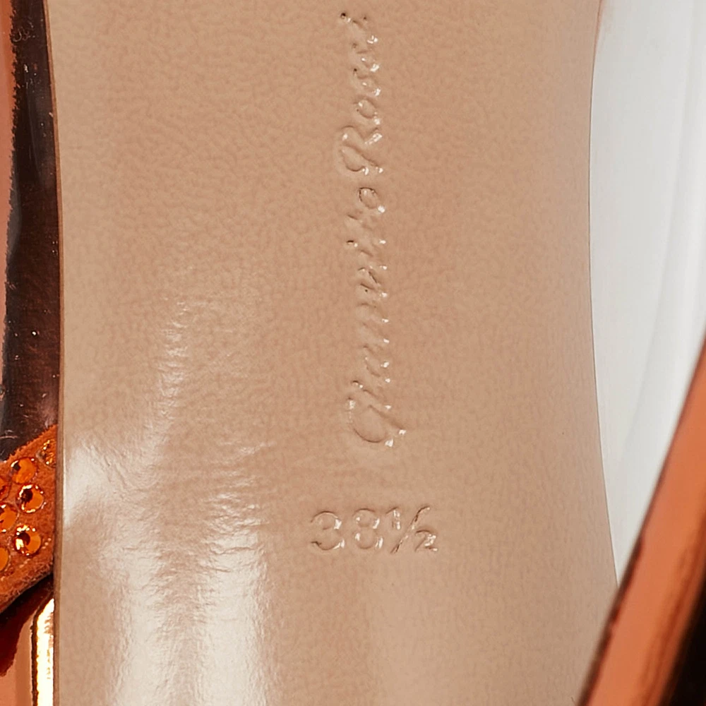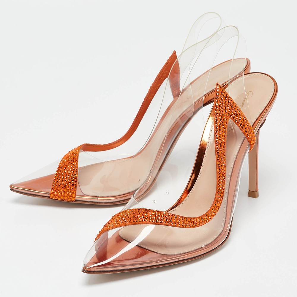 Make a statement with these designer pumps for women. Impeccably crafted, these chic heels offer both fashion and comfort, elevating your look with each graceful step.Certified by The Luxury Closet - This item has gone through a detailed authentication process overseen by our experts. We offer a lifetime guarantee of authenticity on all our items. Import duties, taxes and charges are not included in the item price. These charges are the buyers responsibility. Please check with your country’s customs office to determine what these additional cost will be prior to buying. Our eBay Store About Us Contact Us Add to Favorite Sellers Gianvito Rossi Transparent/Orange PVC and Suede Embellished Hortensia Pumps Size 38.5 $385 Make a statement with these designer pumps for women. Impeccably crafted, these chic heels offer both fashion and comfort, elevating your look with each graceful step. Product Details Brand Color Transparent Dimensions Material PVC, Suede Size 38.5 Outsole Width 8 cm Outsole Length 23.5 cm Heel Height 10.5 cm Includes Original Dustbag, Original Box, Info Card Certified by The Luxury Closet This item has gone through a detailed authentication process overseen by our experts. We offer a lifetime guarantee of authenticity on all our items. How We Check The in-house team of experts at The Luxury Closet is highly trained to verify the authenticity and the condition of the luxury products. They ensure that only 100% authentic items are put on sale.The evaluation process is unique with its own mix of assessment criteria and differs according to the category. Each item is evaluated based on the following combination of hallmarks, hardware, stitching, symmetry, material, craftsmanship, stamping, codes, hologram stickers, and packaging. Our authenticators also check if the items have been modified or amended (e.g., aftermarket diamonds, replaced batteries, repaired bags, etc.) International Buyers Import duties, taxes and charges are not included in the item price. These charges are the buyers responsibility. Please check with your country’s customs office to determine what these additional cost will be prior to buying.
