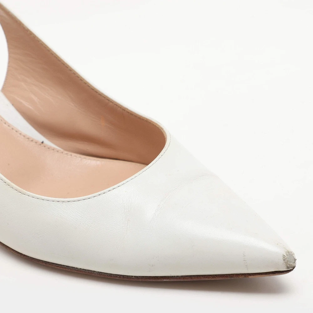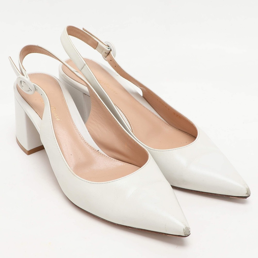 Our eBay Store About Us Contact Us Add to Favorite Sellers Gianvito Rossi White Leather Slingback Pumps Size 375 These white leather slingback heels by Gianvito Rossi are exquisite. Impeccably crafted from leather, they offer both style and comfort. The chic buckle closure provides a secure fit, while the sophisticated design ensures they complement you in any setting. Product Details Brand Gianvito Rossi Color White Includes The Luxury Closet Packaging Outsole Length 26 cm Outsole Width 8 cm Size EU 37.5 (US 7/UK 4.5) Certified by The Luxury Closet This item has gone through a detailed authentication process overseen by our experts. We offer a lifetime guarantee of authenticity on all our items. How We Check The in-house team of experts at The Luxury Closet is highly trained to verify the authenticity and the condition of the luxury products. They ensure that only 100% authentic items are put on sale.The evaluation process is unique with its own mix of assessment criteria and differs according to the category. Each item is evaluated based on the following combination of hallmarks, hardware, stitching, symmetry, material, craftsmanship, stamping, codes, hologram stickers, and packaging. Our authenticators also check if the items have been modified or amended (e.g., aftermarket diamonds, replaced batteries, repaired bags, etc.) International Buyers Import duties, taxes and charges are not included in the item price. These charges are the buyers responsibility. Please check with your country’s customs office to determine what these additional cost will be prior to buying.