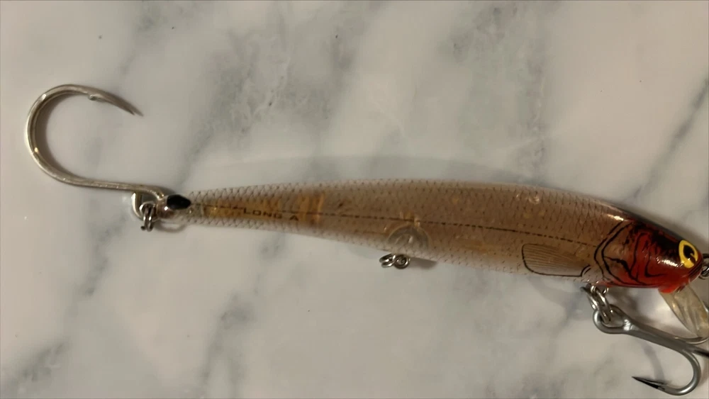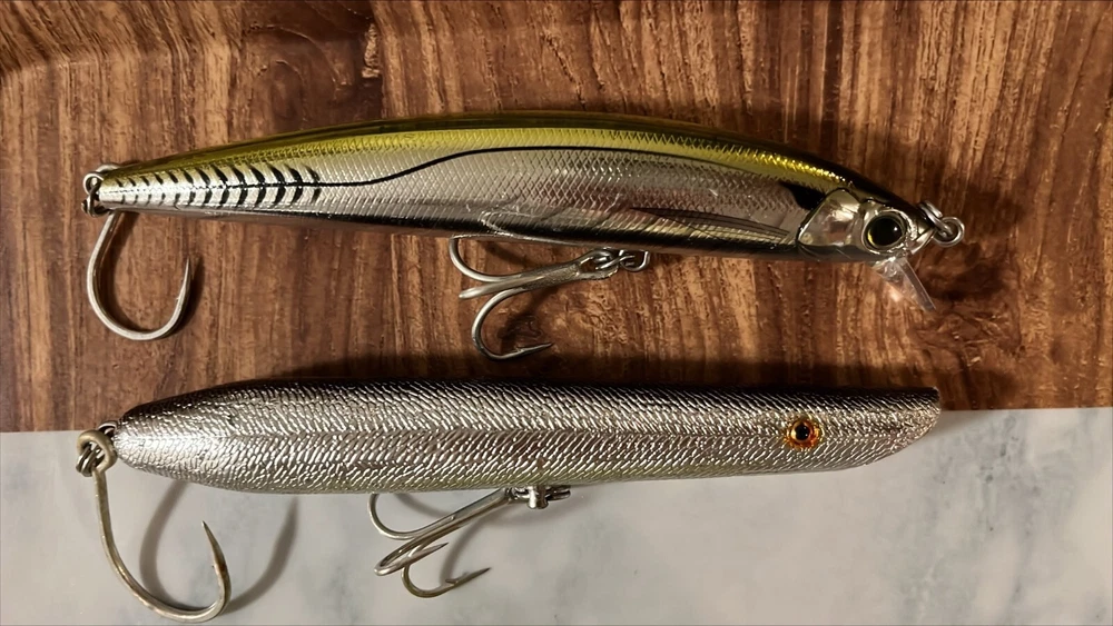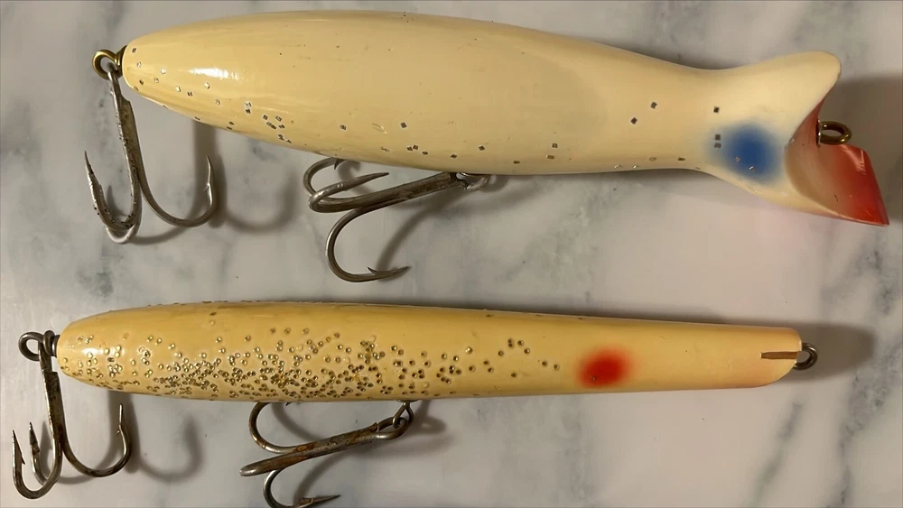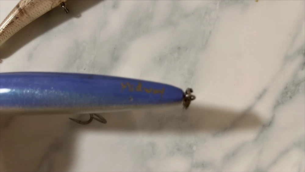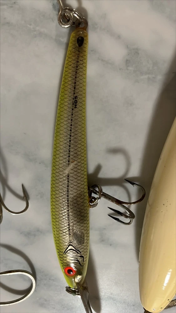 Lures from top to bottom: 1) Yo-Zuri Hydro Minnow LC Bronze 6" 2) Cotton Cordell Pencil Popper black on silver 6" 3) Bomber HD5 Chartreuse deep running 4 and 5 I believe are wooden Gibbs lures. #4 is a bottle neck swimmer; #5 is a pencil popper 6) Midway Minnow 7) Bomber Long A 15 Thanks for looking!