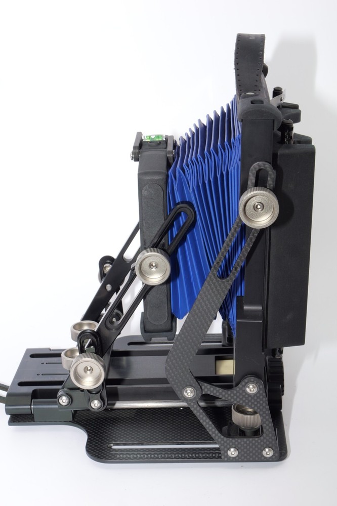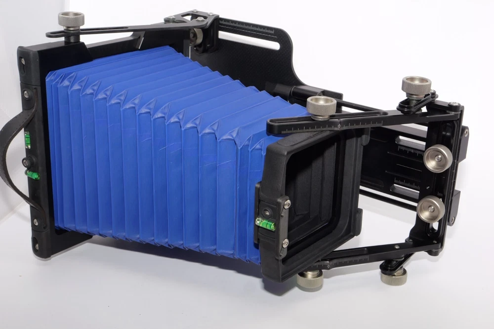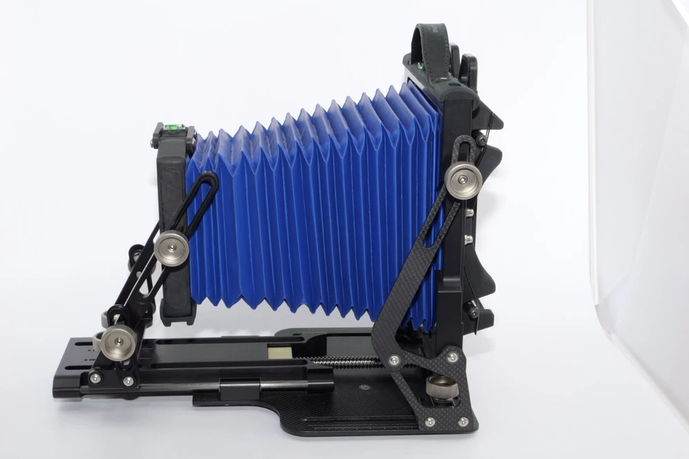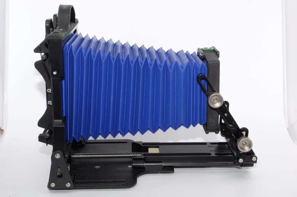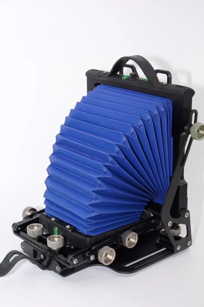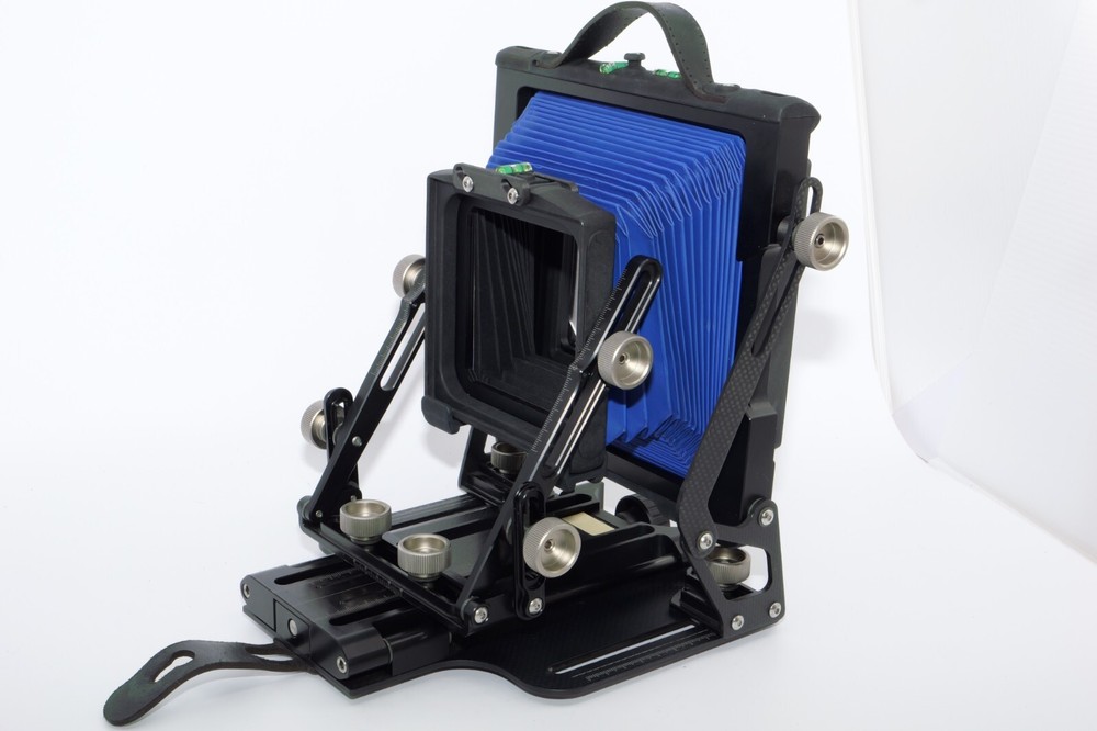 Gibellini ACN45 4x5 Field Camera. Made in Italy. High quality deluxe 4x5" large format field camera made from carbon fiber, and aluminum. Sturdy 4x5 camera with precise movements, and aluminum rails. Carbon fiber camera bed. Lined ground glass focusing screen. Light weight camera. Contrasting color royal blue normal & wide angle bellows. Chrome knobs on the camera. Professional traditional folding 4x5 field camera. Camera is in Mint/Mint- or 9.5 of 10 cosmetic condition. No dings or dents. Little sign of use. Good working order. Includes original box, Gibellini ACN 45 camera with normal bellows in Blue , and Wide Angle Bellows also in Blue . extra set of black knobs included, and two(2) 4x5 plastic Fidelity Elite sheet film holders. *************************************************** Gibellini crafts folding cameras that seamlessly blend heritage with innovation. These Italian-made beauties boast a distinctive design aesthetic and leverage cutting-edge technology to deliver exceptional functionality and performance. Furthermore, Gibellini's meticulous attention to detail extends to the materials used, incorporating high-strength, lightweight elements like aerospace titanium and carbon fiber to ensure exceptional technical quality and a premium user experience. Gibellini ACN 45 4x5 View Camera is a professional, traditional folding camera. It is made with Aluminum and Carbon Fiber. The camera is unibody CNC milled and includes a Carbon Fiber base, providing unparalleled stability while being lightweight. Aluminum rails allow for precise movements. EXTERNAL DIMENSIONS: 260x220x80 mm WEIGHT: 2.4kg / 5.3 lbs MIN/MAX extension bellows: 50 – 340 mm MIN/MAX with bag bellows: 0 – 400 mm FRONT RISE/FALL: + 55 / – 35 mm FRONT SHIFT: +/- 25 mm FRONT TILT: +/- 45° limited by bellows FRONT SWING: +/- 45° REAR RISE/FALL: 0 mm REAR SHIFT: +/- 15 mm REAR TILT:– 20° / + 90° (closure direction) REAR SWING: +/- 45° LENSBOARD: Requires Gibellini Size or Gibellini Adapter (Special Order, please send inquiry, Linhoff adapter is item #392040) TRIPOD MOUNT: 3/8” and 1/4 “ CAMERA BACK: horizontal/vertical positioning HOLDERS: compatibility with all commercial and Gibellini MECHANISMS: Aluminum/Carbon BELLOWS COLOR: Black (Special Order options available) BODY COLOR: Black (Special Order options available) ***************************************************** Nice high quality unique 4x5 Gibellini carbon fiber and aluminum field camera from Italy with extra wide angle bellows in Mint- condition. Sells with no reserve at a price of $1875 . I have LOT more Wisner View Cameras, Large Format cameras, Lenses and Accessories, Soft Focus and Barrel lenses on my other auctions, web page and eBay Store.