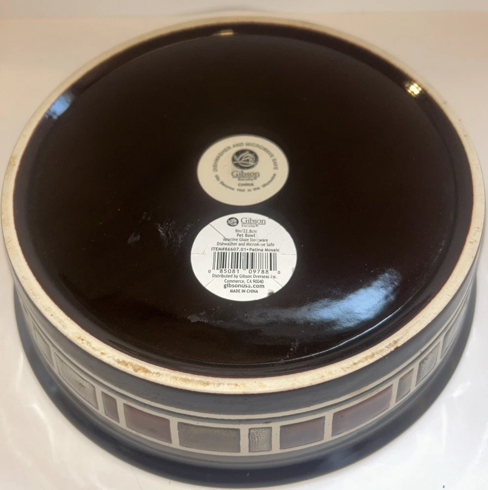 This Gibson serving bowl features an animal print pattern in beige, made of ceramic with a diameter of 9 inches and a height of 2.5 inches. The art pottery production style from the 2010-2019 time period showcases a modern aesthetic, with a production technique of pottery from China. The set includes a single serving bowl, suitable for various dining occasions. Handmade status is unknown, but the overall design and quality make it a beautiful addition to any table setting. kk403