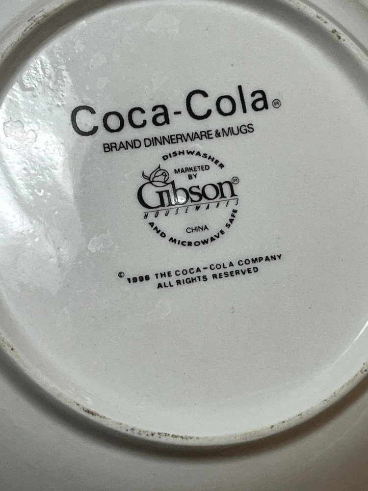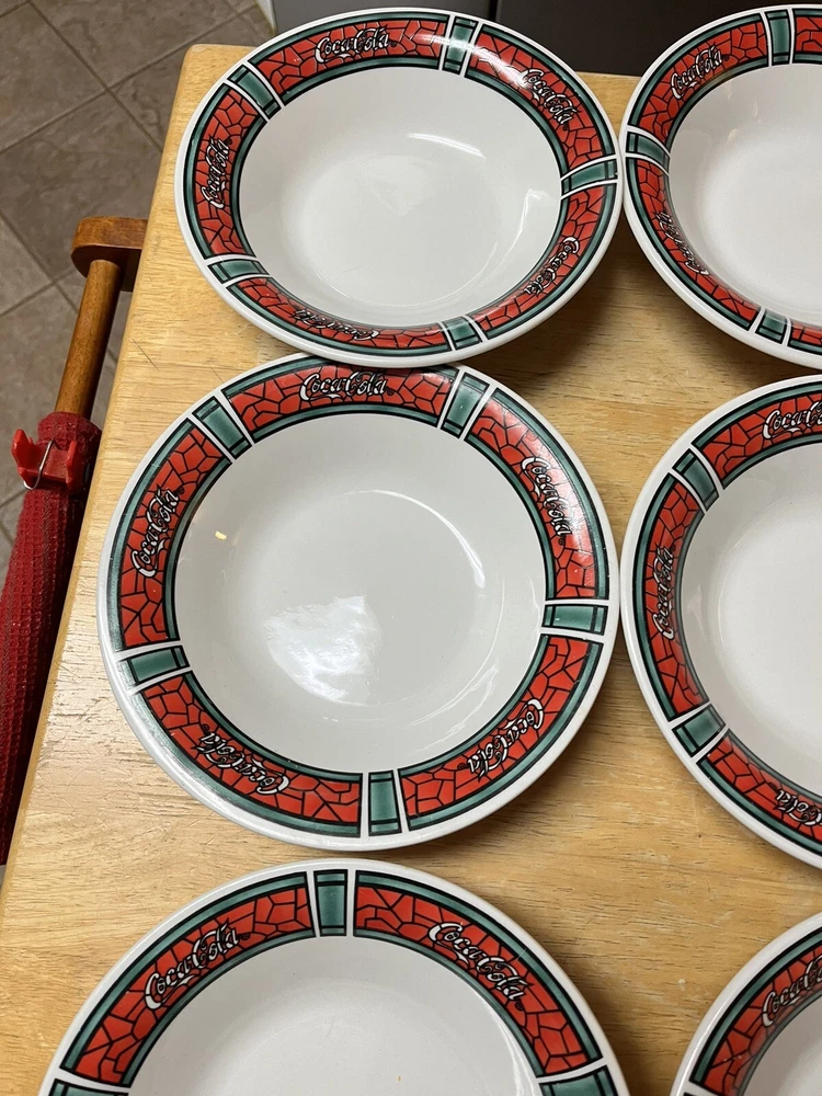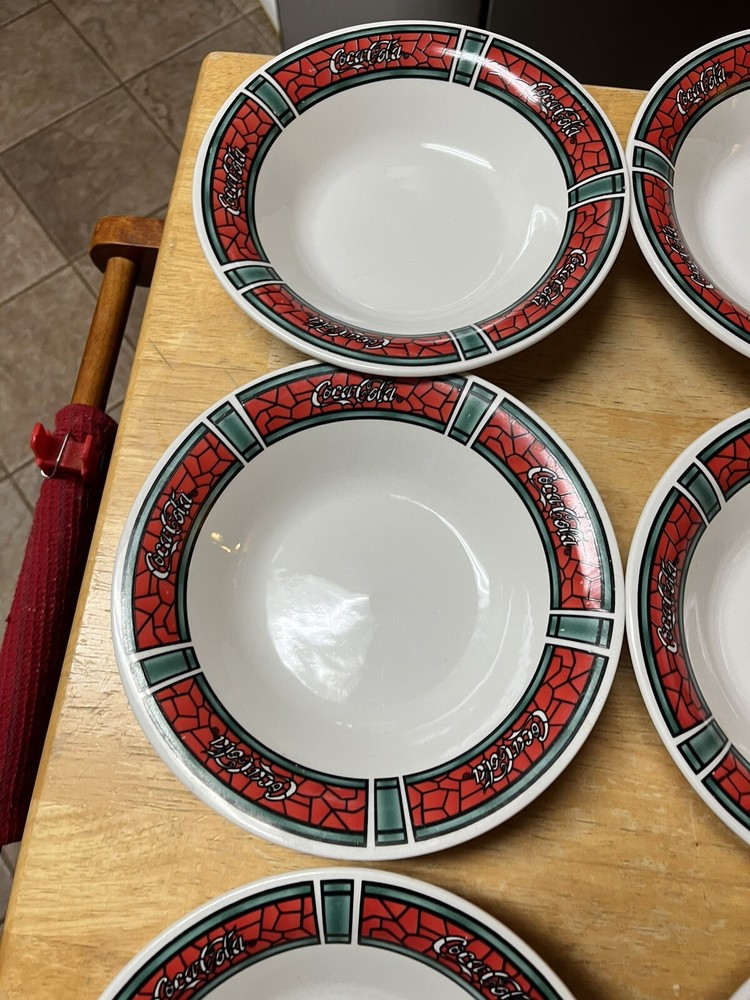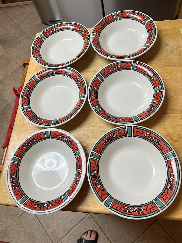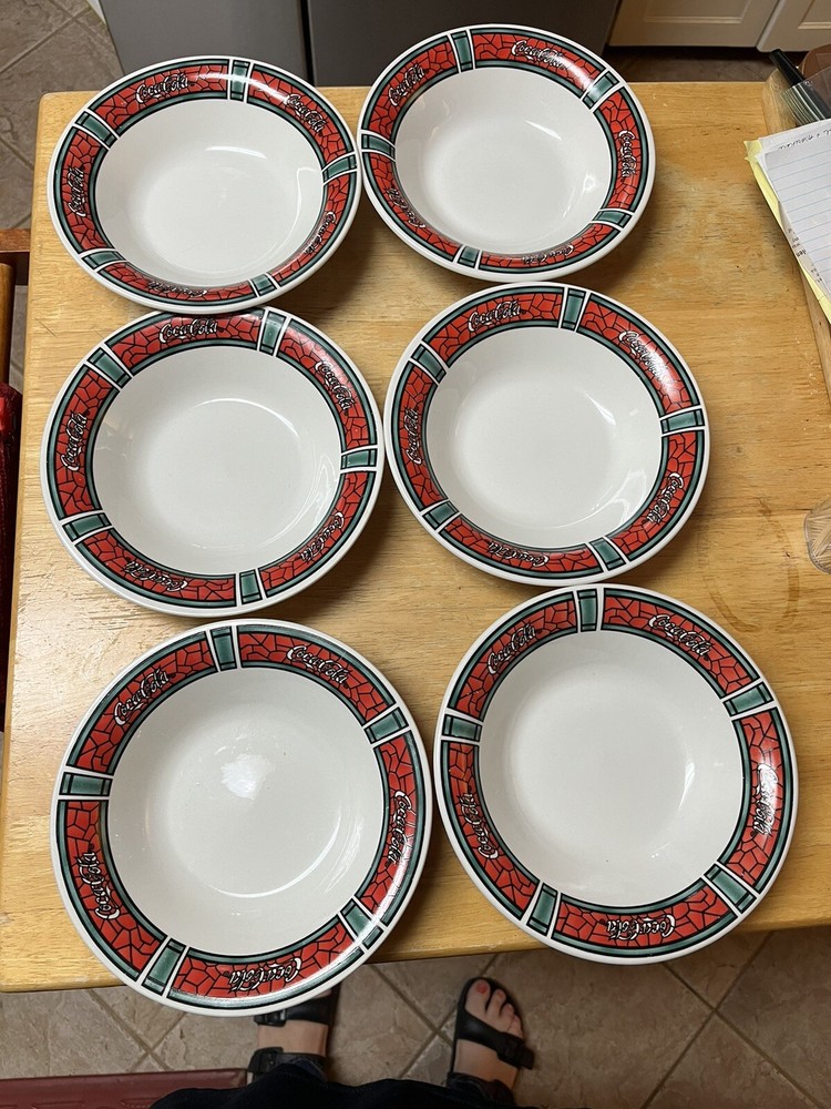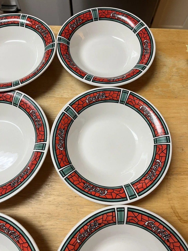 Add a touch of vintage charm to your dining table with this set of six Gibson Designs Coca Cola Traditions soup/cereal bowls. These round bowls feature a beautiful stained glass pattern in a glossy finish, making them perfect for all occasions. The set includes one piece of porcelain, stoneware, and ceramic, and is microwave safe for easy use. The bowls are part of the late 20th-century art pottery style, with an antique look that is sure to impress. They are printed with the Gibson Designs backstamp and are an original production line. The set is perfect for collectors and is a great addition to your decorative cookware, dinnerware, and serveware collection.