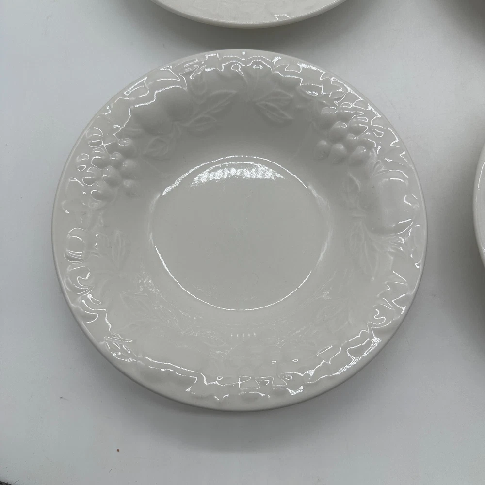 Gibson FLOURISH OFF WHITE Coupe Soup Bowl Set of 4. Made of stoneware in a round shape with a RAISED FRUIT design. The bowls are 8 1/8" in diameter, suitable for all occasions. The set includes four soup bowls. This contemporary original Gibson model features a white color and is made in China. The backstamp is printed on each bowl.