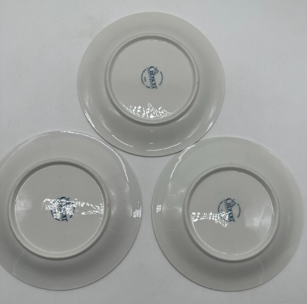 Add a touch of elegance to your dining table with this beautiful set of three Gibson Four Seasons white salad plates. The round plates measure 7.75 inches in diameter and feature an embossed floral fruit pattern that's perfect for any occasion. Made of high-quality earthenware and stoneware materials, these plates are both discontinued and microwave safe, making them a convenient addition to your dinnerware collection. The plates are printed with the brand's backstamp and are perfect for adult use. The set includes a dessert plate, a salad plate, and a side plate, all of which are ideal for serving fruits and other dishes. These plates are a must-have for any 21st-century home and are a great addition to your pottery and glass collection.