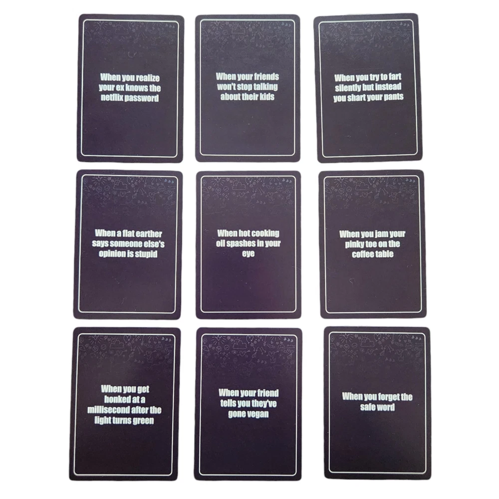 500 hilarious cards come in the box. Once you have the game, scan the QR code and start playing! 100+ classic gifs were chosen to fit perfectly with 500 Cards. Limited Product, Not Affiliated with Cards Against Humanity or Its Creators. Instructions Gif Showdown is a card game. The person with the largest smartphone is the first judge and must scan the QR code on the box. the judge picks a gif meme and all others must pick a card from their hand of 7. Players give the judge their best card to match the gif and collect a new card. The judge picks the winning card. The winner keeps their winning card. Collect 10 cards to win. The person to the left of the judge is the next judge. Have fun!