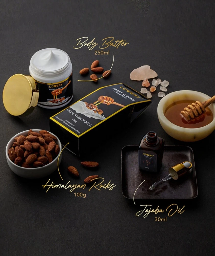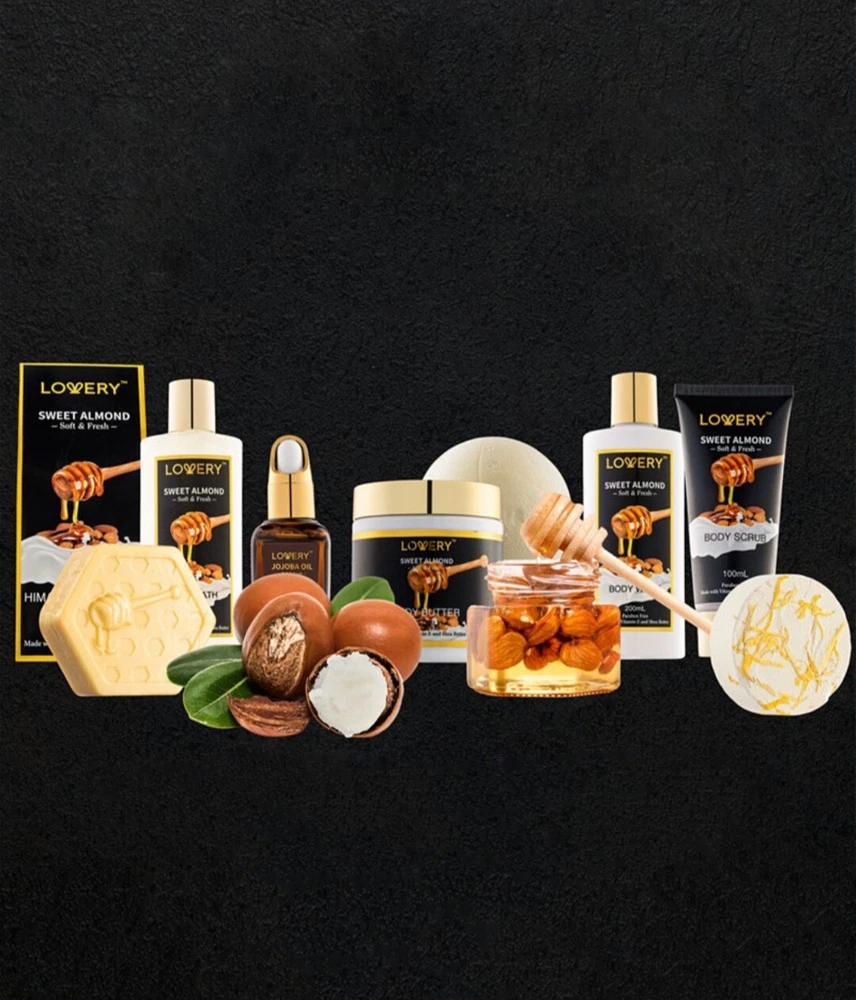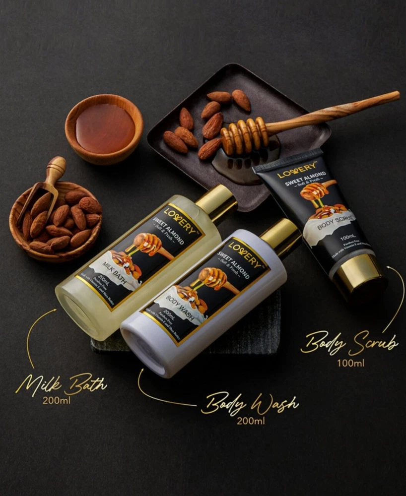 Product Details This premium beauty personal care package is infused with sweet almond for an invigorating aromatherapy experience that is also one of the best things you can do for your skin rich in vitamin E to protect and keep skin moisturized. Set includes - 200 ml body wash, 200 ml milk bath, 100 ml body scrub, 250 ml body butter, 30 ml jojoba oil, 100g Himalayan rocks, 100g handmade bath soap, 150g bath bomb, 60g steamer tablet, decorative gift bo