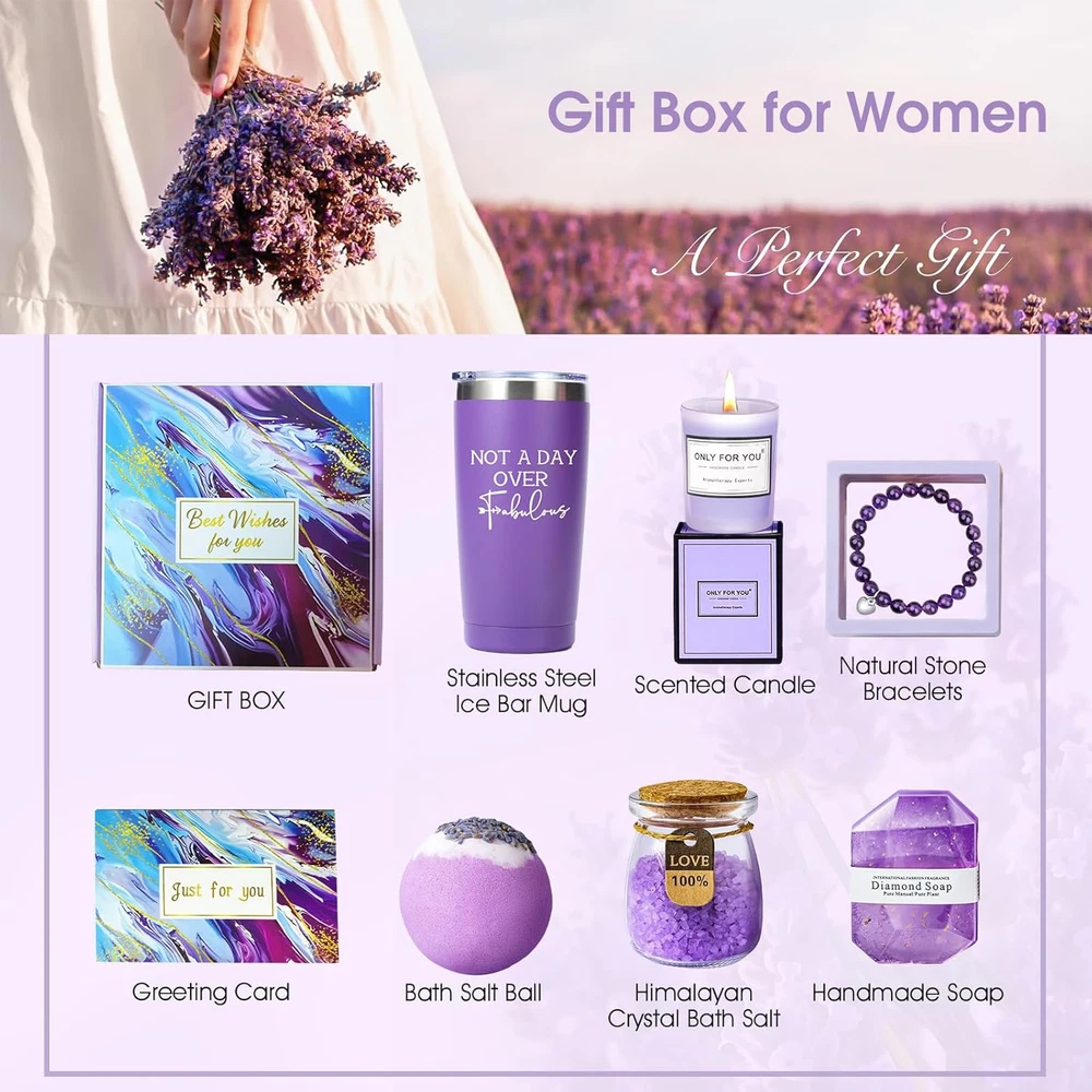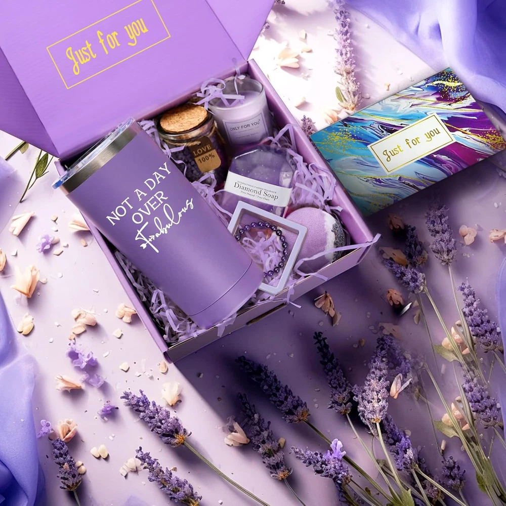 Store New Arrivals Add to Favorite View Feedback Contact Gift Baskets for Women, Happy Birthday Gifts Baskets for Women, Lavender Relaxing Spa Gift Basket Set for Christmas, Mothers Day Gifts, Valentine'S Day Gifts for Her, Purple Gift Box for Girlfriend Description Item model number PX0013A Package Dimensions 9.33 x 9.17 x 4.21 inches; 2.71 Pounds Personalized Gifts for Women for Any Occasion: Our lavender gift basket for women, a carefully curated unique gifts for birthdays, Christmas, Mother's Day, Valentine's Day, Thanksgiving, Anniversaries, or any other special day to convey your love and appreciation Purple Gifts for Women: The 7-piece gift baskets is a practical and thoughtful choice, featuring a 20 oz stainless steel mug with “Not A Day Over Fabulous” on it, scented candle, bath salt, bath bomb, soap, natural stone bracelet and a "Just For You" heartfelt greeting card, all gifts are packaged in a Premium purple gift box Happy Birthday Gifts for Women: Are you looking for the perfect birthday gifts for best friends, sisters, sister in law, daughter in law, mother in law, moms, wife, girlfriends, boyfriends mom, teachers, coworkers female, boss woman, her? This birthday gift basket for women is your best gift ideas. Our gifts for women birthday unique are designed to impress every lady at first sight. Try this funny birthday box for woman Spa Baskets for Women Gift: Experience Relaxing with our spa day gifts for women. This spa gift sets for women collection combines the soothing properties of natural handmade lavender soap, a lavender bath bomb, a bath salt, and a fragrant lavender-scented candle. Immerse yourself in the calming aroma of lavender as you pamper your senses and unwind from the stresses of the day, perfect for self care basket Pampering Gift for Women: Pamper her with this best gifts for women. Our gift set for women is thoughtfully selected, filled with warmth. Perfect for women christmas gifts basket, valentines day gifts for her basket, anniversary gifts for women, mom birthday gifts, mothers day gifts, teacher appreciation gifts, employee appreciation gifts, retirement gifts, bridal shower gifts, thinking of you gifts for women. Also suitable for get well soon gift baskets for women Product Description ABOUT US We offer the best prices around on high quality products. Our E-store includes media such as books, movies, music and games while offering electronics, toys, sporting apparel, clothing, tools, general home, garden items and more. SHIPPING We are always working hard to ensure your package arrives as soon as possible. Please understand that some factors like weather, high postal traffic, and the performance of shipping companies are outside of our control. We offer free shipping to the lower 48 states and ship within 1 business day of payment, usually sooner. P.O. Boxes are accepted, so please feel free to provide either a physical address or a P.O. Box. We do not offer shipping outside of the continental USA. We only ship to states within the continental United States. RETURNS We offer a 30-Day Return Policy on items which you are not completely satisfied with. You have the option for a full-refund or an exchange of the item. No returns are available on items shipped outside of the USA. PAYMENT We accept PayPal. CONTACT US This page content is yet to come Please ad us to your favorite seller and visit again later Thank You CUSTOMER SATISFACTION We try our very best to make sure every customer is completely satisfied. If there's a problem, message us! We're happy to help.