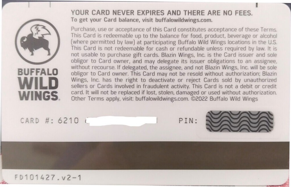 Welcome to another Goalielover auction! This is for one gift card: B-DUBS Buffalo Wild Wings (USA) ($0.00/new): 2022 YOU'RE LEGENDARY FD#10427.v2-1 No doubt this great card will be a nice addition to your collection. Sample of front of cards shown. Don't miss out on a great deal and a wonderful collectible! Payment Via (US funds) Shipping/Handling : North American mailing only. (no overseas) * Your envelope will be sent via regular postal mail (Canada Post). No "ebay tracking number". Thank you kindly for viewing! Goalielover