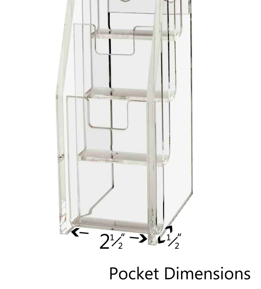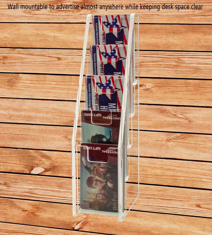 Tiered 5 Pocket Business Card Gift Card Holder Wall Mount or Countertop Lot of 24 Product Features: Overall dimensions: 2 1/2”W x 10”H x 3 7/8”D Pocket dimensions: 2 1/4”W x 1/2”D High quality premium acrylic, proudly made in the USA. This five pocket business card holder provides a sturdy display for vertically designed business cards or gift cards that complements any decor. Made of durable materials, the tiered design displays five sets of business cards and can be conveniently placed on walls or even desks, retail counters, tables or anywhere you want to leave your calling cards or gift cards for the taking. This holder is freestanding and portable. You can display on desks, retail counters, or tables. Pre-drilled with two keyholes for easy wall mounting or easily fits on a countertop. Wall hanging contact card cases and racks are perfect for locations with many employees and agents. Large office buildings or stores frequently use multi-pocket dispensers to distribute as much information at once. Other times, simple gift cards are placed in the pockets. *Hanging hardware not included *All sizes are approximate Return Policy 30 Day Return Policy: By purchasing our product you are agreeing to our return policy, so please read! Perfect returns (NO used merchandise) on stock items are accepted within 30 days of delivery. Any visual appearance that the product is used will result in 00 refund. All returns are subject to a 20% inspection, re-boxing and restocking fee. All returns must be repacked and returned in their original packaging for protection. (MUST return on pallet if received on Pallet) Packages being returned should be insured by you for your protection No credits are issued on shipping costs. Absolutely no returns accepted on custom order displays, including orders with custom text, imprinting or graphics