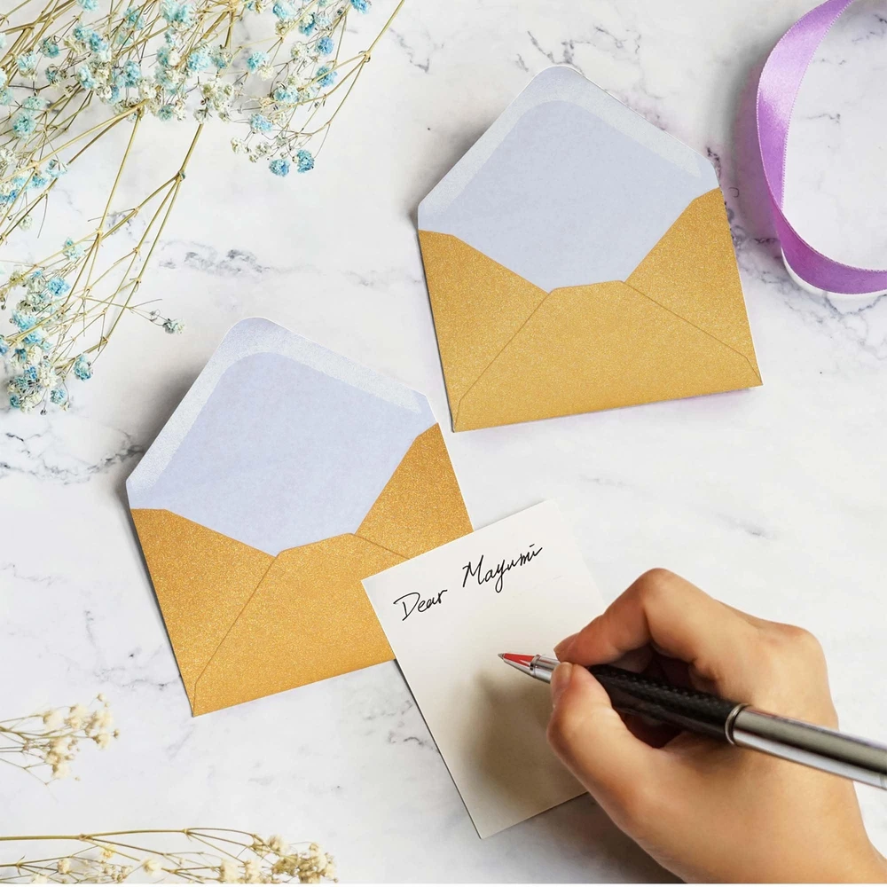 Gift Card Envelopes - 100-Count Mini Envelopes, Paper Business Card Envelopes, Bulk Tiny Envelope Pockets for Small Note Cards, Gold, 4 x 2.7 Inches GOLD MINI ENVELOPES: Perfect sized paper envelopes for gift cards, wedding placeholders, name cards, gift cards, thank you notes, gift tags and more! GREAT FOR HOLIDAYS AND EVENTS: Perfect for holidays, weddings, baby showers, birthdays and banquets. VALUE PACK: Make sure to always have some mini envelopes on hand when you need them! EASY TO SEAL GUM FLAP ENCLOSURE: Apply water to edges of flap and stick DIMENSIONS: Each mini envelope measures 4 x 2.7 inches. These are the perfect sized envelopes for gift cards, wedding placeholders, name cards, gift cards, thank you notes, gift tags and more! They are perfect for holidays, weddings, baby showers, birthdays and banquets. Make sure to always have some mini envelopes on hand when you need them! Each mini envelope measures 4 x 2.7 inches. NOTE: These envelopes can NOT be mailed via the United States Postal Service (USPS). Shipping We offer FREE shipping on all orders! We ship within Three business days of payment, usually sooner. We use a selection of shipping services such as UPS, FedEx, USPS etc. We only ship to the lower 48 states, no APO/FPO addresses or PO Boxes allowed. Local pickups and combined shipping options are not provided at this time. Return You can return a product for up to 30 days from the date you purchased it. Any product you return must be in the same condition you received it and in the original packaging. Please keep the receipt. Payment We accept payment by any of the following methods: PayPal Please pay as soon as possible after winning an auction, as that will allow us to post your item to you sooner! Feedback Customer satisfaction is very important to us. If you have any problem with your order, please contact us and we will do our best to make you satisfied. Contact Us If you have any queries, please contact us via ebay. We usually respond within 24 hours on weekdays. Please visit our eBay store to check out other items for sale! Thank you for shopping at our store.