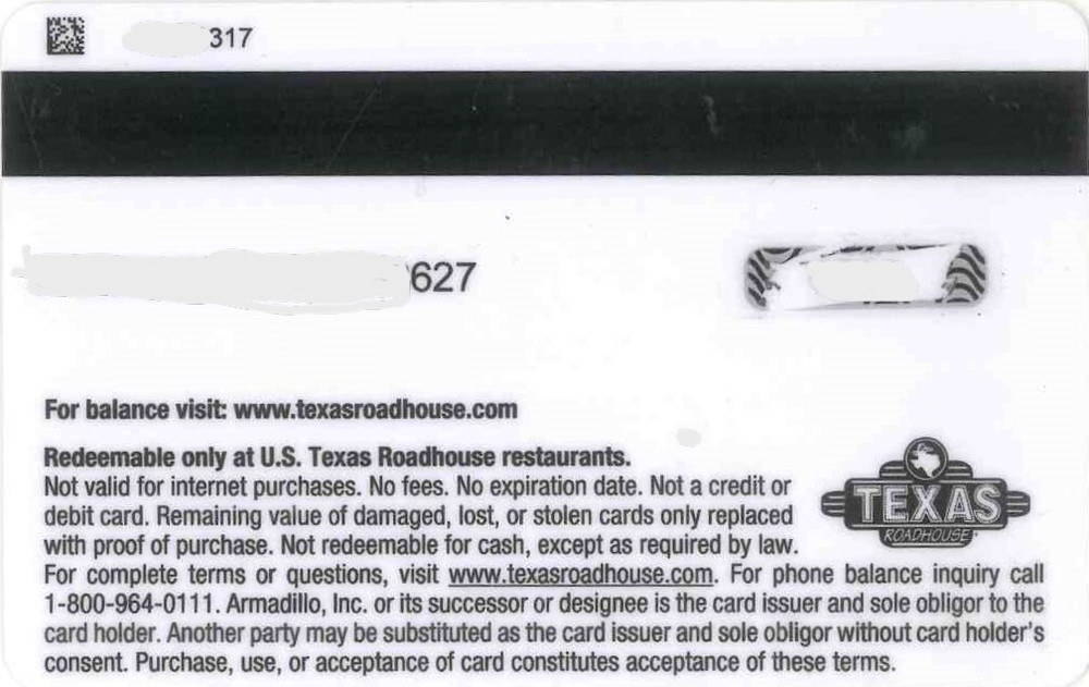 Welcome to another Goalielover auction! This is for one gift card: TEXAS ROADHOUSE (USA) ($0.00/USED/pin scratched) "Foster & Adoptive Care Coalition - For Every Child..." No doubt this nice card will be a nice addition to your collection. Sample of front of card shown. NOTE: Card may have minor surface blemishes due to contact with other cards. This card is used with the PIN SCRATCHED. Don't miss out on a great deal and a wonderful collectible! Payment Via (US funds) Shipping/Handling Costs: North American mailing only. (no overseas) * Your envelope will be sent via regular postal mail (Canada Post). Thank you kindly for viewing! Goalielover