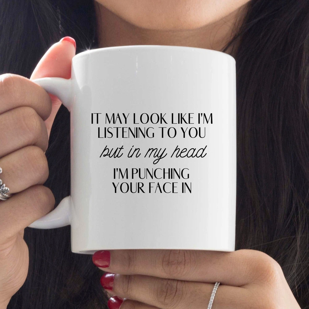 Gift For Anyone Funny Gifts Coffee Mug In My Head I'm Punching Your Face In Gift Product Details.. This high quality 11oz. ceramic white mug has a premium hard coat that provides crisp and vibrant color reproduction sure to last for years. Perfect for all hot & cold beverages. The highest quality printing possible is used. It will never fade no matter how many times you wash it. Material: 100% Ceramic. Print both sides. Dishwasher and Microwave Safe. High Gloss + Premium White Finish. Printed in the U.S.A. Personalized & Custom. We support personalized and custom mug to add custom, when placing an order, you can add notes to the "order note" in shipping address section. Also you can contact us directly via message. Shipping Info. Ready to ship in 1 to 2 business days, All products are made-to-order and proudly printed in the United States. Shipped by USPS and DHL, You will receive your order in 5-7 days. Replace & Refund. All products are defective during shipping broken, chipped will be replaced free of charge. You are not satisfied with the product, we will refund 100% money to you. If any other issues arise, please do not hesitate to message, we would be more than happy to assist you.