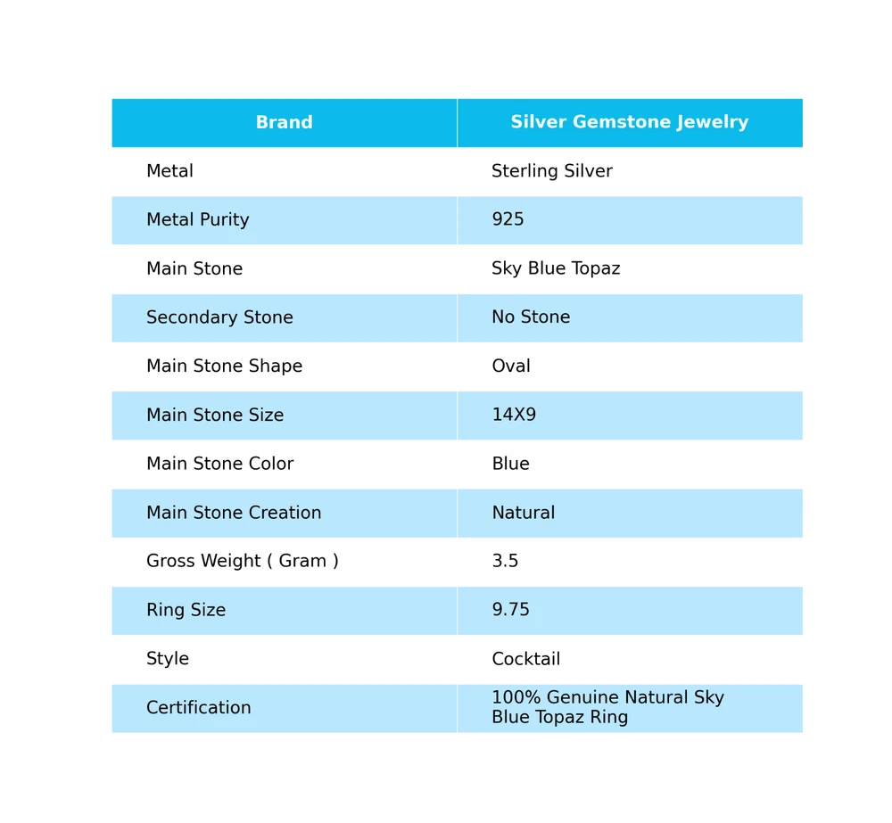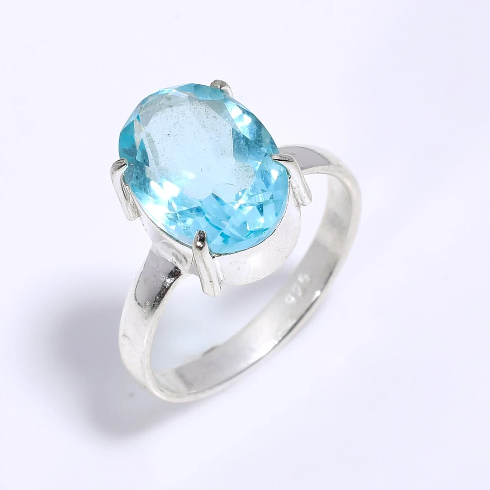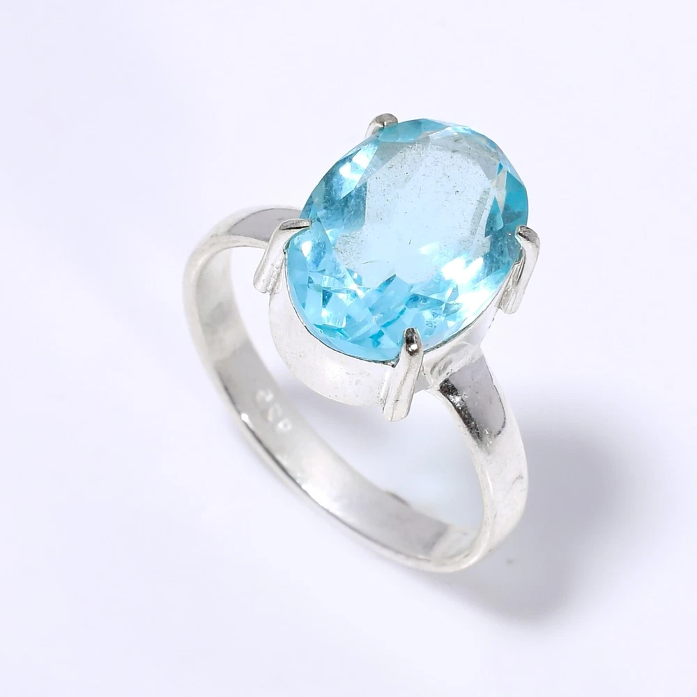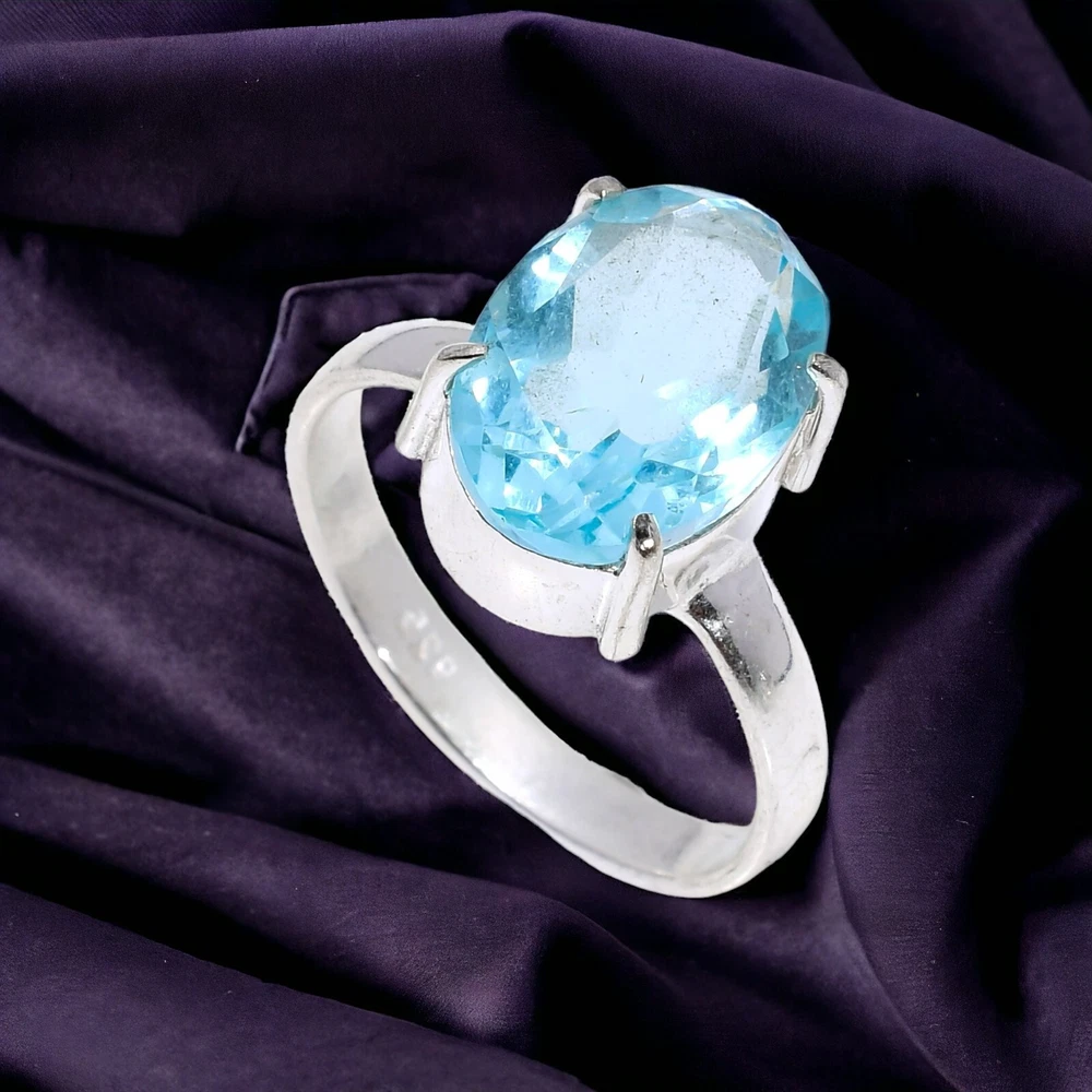 Welcome to Jaipur Silver Gallery Gift For Her 925 Silver Natural Sky Blue Topaz Gemstone Cocktail Ring Size 9.75 Handmade Ring, Sterling Silver Ring, Sky Blue Topaz Ring, Handcrafted Ring SKU : - UKR-3089 Gemstone : - Sky Blue Topaz Stone Shape : - Oval Metal : - Sterling Silver Metal Purity : - 925 Ring Size : - 9.75 US Adjustable : - _______________________________________________________________________________________ Amazing Properties of Silver ****************************** Tough and Long-lasting: Silver is incredibly strong, built to withstand daily wear and tear as well as tough environmental conditions. Easy to Shape and Design: Silver is like clay for skilled craftsmen, allowing them to create beautiful and intricate designs effortlessly. Great at Conducting Energy: When it comes to heat and electricity, silver is the go-to. It can quickly and efficiently transfer energy, making it ideal for various applications. Keeps Things Clean and Safe: Silver has a natural ability to keep harmful bacteria at bay, making it a reliable choice for promoting cleanliness and well-being. 3 Underrated Benefits Of Silver ****************************** Gorgeous Charm: Silver jewelry shines brightly, enhancing any outfit and fitting everyone's style with ease. Gentle on Skin: Silver is kind to your skin, reducing the chance of allergies and making it a favorite choice for accessories. Healing Vibes: Some believe silver jewelry has a soothing touch, possibly aiding in easing issues like arthritis, anxiety, and the blues. _______________________________________________________________________________________ For Mother's Day Gift For Father's Day Gift For Promise For Valentine' Day For Halloween Party For Christmas Day Gift For New Year Party For Mom For Her _______________________________________________________________________________________ If you need more help or want design tips, just give us a shout! We're lightning-fast in getting back to you. Every single thing we create is made by hand in our special workshop, and we put a whole lot of love and care into every piece. Thank you for stopping by! We're confident you'll have an amazing time shopping with us. We're here to make sure every moment you spend with us is filled with delight and satisfaction. Happy shopping!
