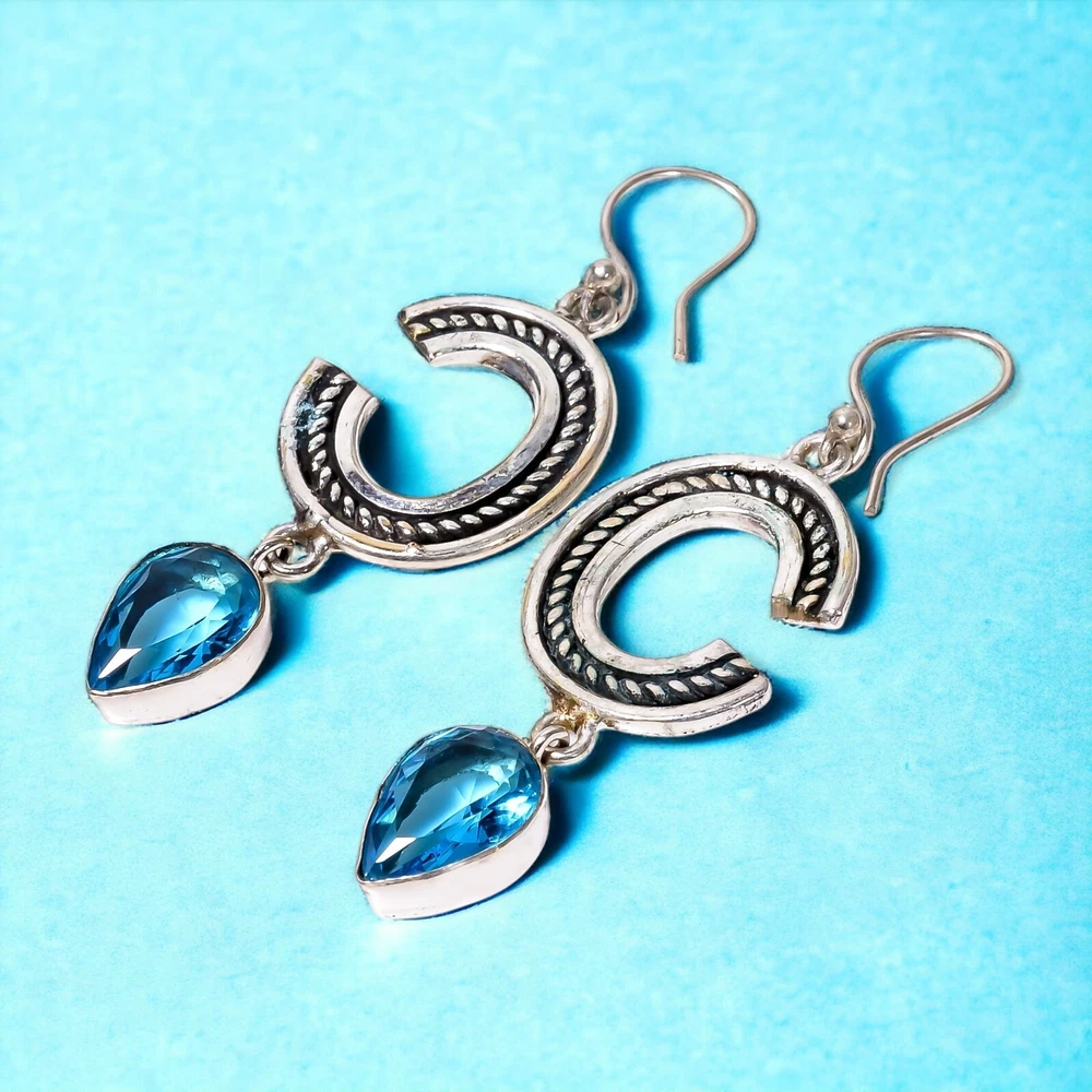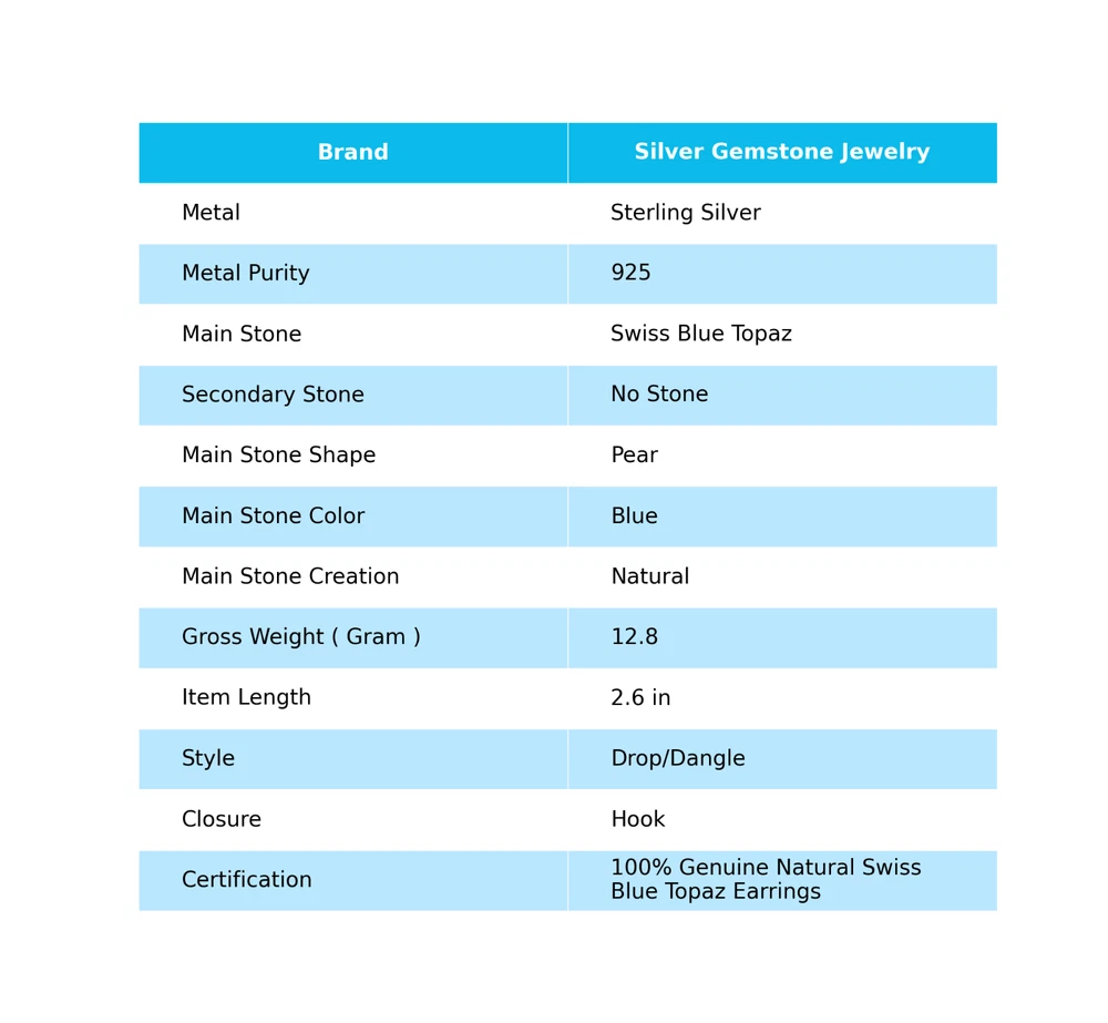 Welcome to Jaipur Silver Gallery Gift For Her 925 Silver Natural Swiss Blue Topaz Drop/Dangle Birthstone Earrings Handmade Earrings, Sterling Silver Earrings, Swiss Blue Topaz Earrings, Handcrafted Earrings SKU : - JSUKE-1842 Gemstone : - Swiss Blue Topaz Stone Shape : - Pear Metal : - Sterling Silver Metal Purity : - 925 Earring Length : 2.6 Inches Earring Width : Inches _______________________________________________________________________________________ Amazing Properties of Silver ****************************** Tough and Long-lasting: Silver is incredibly strong, built to withstand daily wear and tear as well as tough environmental conditions. Easy to Shape and Design: Silver is like clay for skilled craftsmen, allowing them to create beautiful and intricate designs effortlessly. Great at Conducting Energy: When it comes to heat and electricity, silver is the go-to. It can quickly and efficiently transfer energy, making it ideal for various applications. Keeps Things Clean and Safe: Silver has a natural ability to keep harmful bacteria at bay, making it a reliable choice for promoting cleanliness and well-being. 3 Underrated Benefits Of Silver ****************************** Gorgeous Charm: Silver jewelry shines brightly, enhancing any outfit and fitting everyone's style with ease. Gentle on Skin: Silver is kind to your skin, reducing the chance of allergies and making it a favorite choice for accessories. Healing Vibes: Some believe silver jewelry has a soothing touch, possibly aiding in easing issues like arthritis, anxiety, and the blues. _______________________________________________________________________________________ For Mother's Day Gift For Father's Day Gift For Promise For Valentine' Day For Halloween Party For Christmas Day Gift For New Year Party For Mom For Her _______________________________________________________________________________________ If you need more help or want design tips, just give us a shout! We're lightning-fast in getting back to you. Every single thing we create is made by hand in our special workshop, and we put a whole lot of love and care into every piece. Thank you for stopping by! We're confident you'll have an amazing time shopping with us. We're here to make sure every moment you spend with us is filled with delight and satisfaction. Happy shopping!