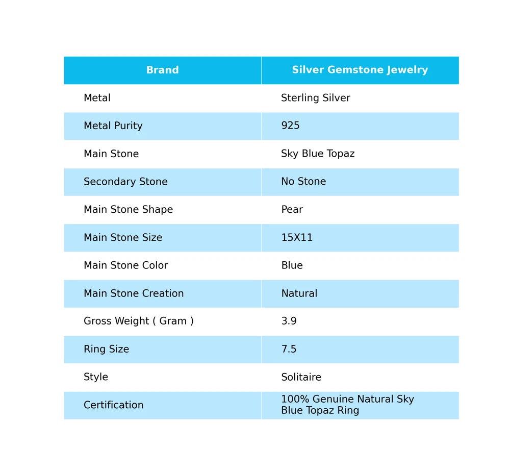 Welcome to Jaipur Silver Gallery Gift For Her Natural Sky Blue Topaz Solitaire Dailywear Ring Size 7.5 925 Silver Handmade Ring, Sterling Silver Ring, Sky Blue Topaz Ring, Handcrafted Ring SKU : - UKR-2849 Gemstone : - Sky Blue Topaz Stone Shape : - Pear Metal : - Sterling Silver Metal Purity : - 925 Ring Size : - 7.5 US Adjustable : - _______________________________________________________________________________________ Amazing Properties of Silver ****************************** Tough and Long-lasting: Silver is incredibly strong, built to withstand daily wear and tear as well as tough environmental conditions. Easy to Shape and Design: Silver is like clay for skilled craftsmen, allowing them to create beautiful and intricate designs effortlessly. Great at Conducting Energy: When it comes to heat and electricity, silver is the go-to. It can quickly and efficiently transfer energy, making it ideal for various applications. Keeps Things Clean and Safe: Silver has a natural ability to keep harmful bacteria at bay, making it a reliable choice for promoting cleanliness and well-being. 3 Underrated Benefits Of Silver ****************************** Gorgeous Charm: Silver jewelry shines brightly, enhancing any outfit and fitting everyone's style with ease. Gentle on Skin: Silver is kind to your skin, reducing the chance of allergies and making it a favorite choice for accessories. Healing Vibes: Some believe silver jewelry has a soothing touch, possibly aiding in easing issues like arthritis, anxiety, and the blues. _______________________________________________________________________________________ For Mother's Day Gift For Father's Day Gift For Promise For Valentine' Day For Halloween Party For Christmas Day Gift For New Year Party For Mom For Her _______________________________________________________________________________________ If you need more help or want design tips, just give us a shout! We're lightning-fast in getting back to you. Every single thing we create is made by hand in our special workshop, and we put a whole lot of love and care into every piece. Thank you for stopping by! We're confident you'll have an amazing time shopping with us. We're here to make sure every moment you spend with us is filled with delight and satisfaction. Happy shopping!