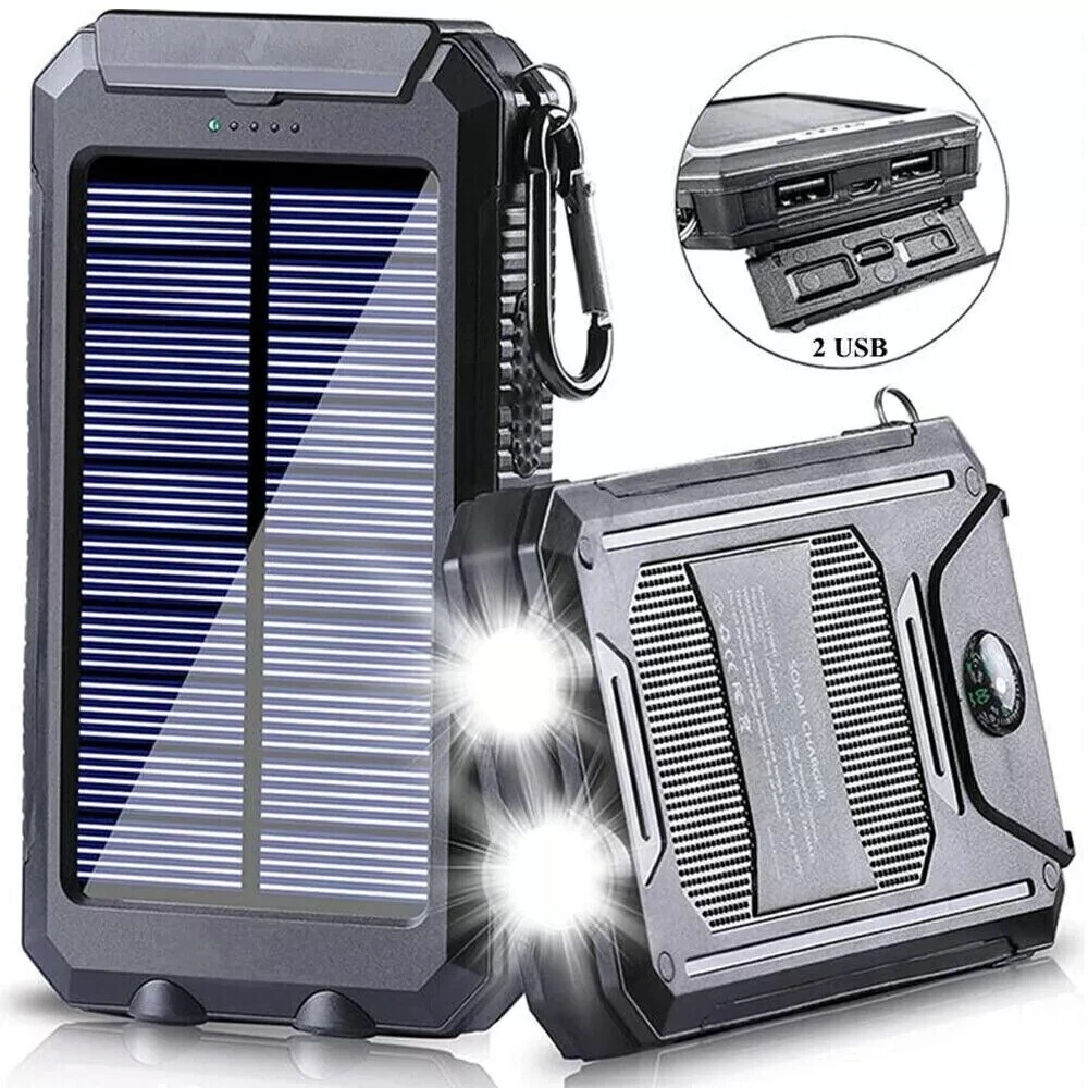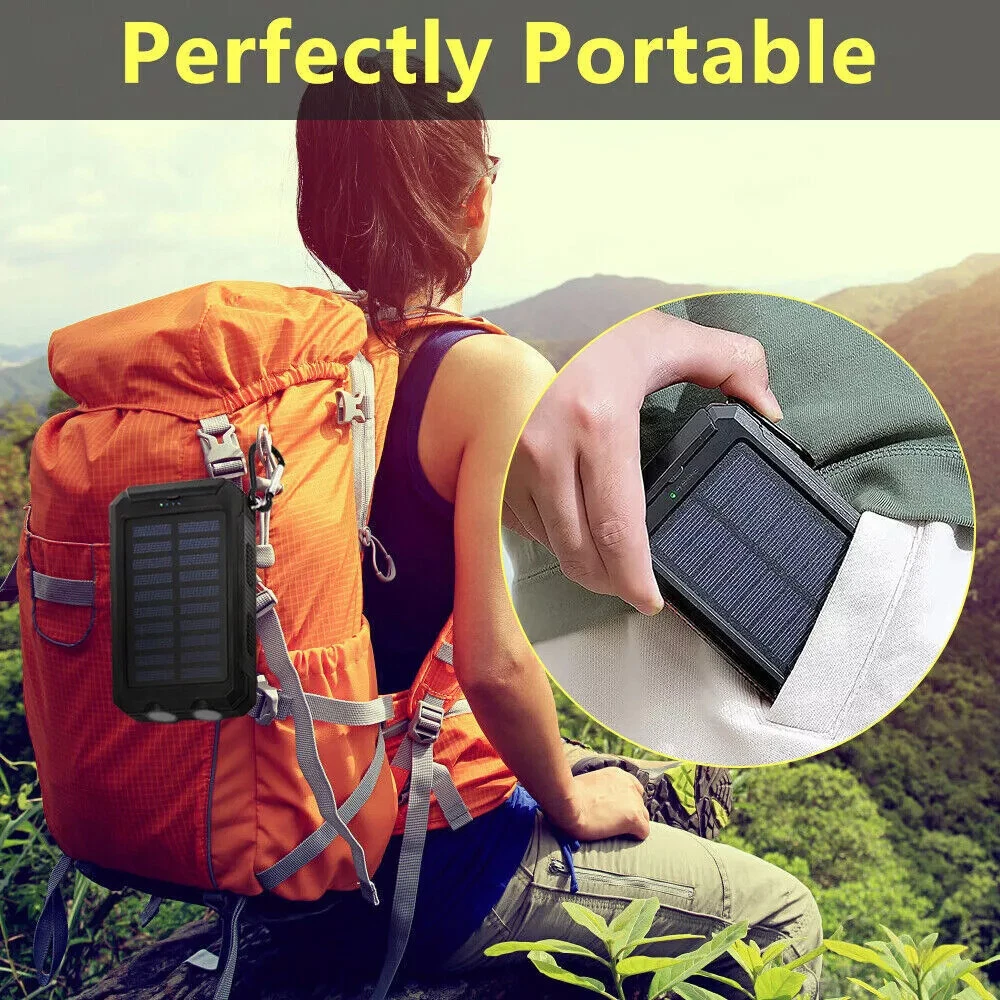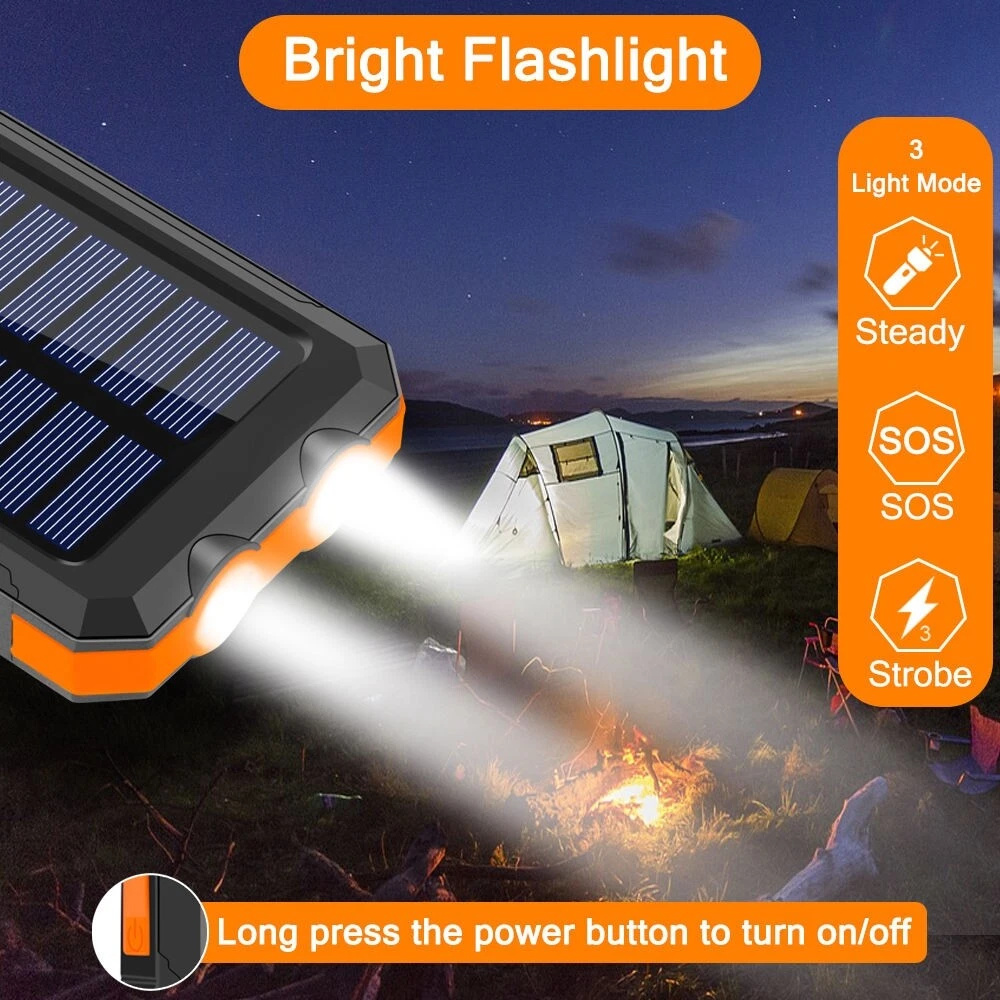 Waterproof Portable Solar Charger: Special Design for Outdoor. Compact design and with a hook , so you can freely attach it to your backpack in camping, and it will recharge itself under direct sunshine for emergency. 1.Dual USB Outputs DC 5V/2.1A(one device, output max 2.1A), DC 5V/1A(two devices, each output 1A) USB ports for Tablets, other smart phones or other electronic devices. DC 5V/1.5A USB input for fast charge solar power bank itself. Allow you to charge two devices at the same time, the USB cell phone charger provides great convenience with you and your friends who need charging services. Controlled by intelligent IC, dual USB ports offer 5V/2.1A outputs high speed charging and enable you to charge 2 devices simultaneously, compatible with all phone models. Warmth Tip: If you want to let the two devices charger together (two devices, each output 1A) will charge a little slower, but a device will charge 5V/2.1A outputs high speed, so charging will be faster. 2.Two LED Flashlight & SOS Function Two LED lights can be used as flashlight with Steady-SOS-Strobe mode. As an emergency lighting in darkness, the flashing light mode can be used as SOS. Warm Tip: 1. Please charge it via the outlet at least 8-10 hours at first-time use to fully activate this solar panel. 2. LED Working Method : LED button is on the side. You must first press and hold to turn on above 3-5 seconds, the led flashlight will work. short press to cycle modes/turn off. 3. Due to sunlight intensity and solar panel conversion rate, it may take a long time to fully charge the power panel. We suggest you fully recharge it via outlet before travel or hiking. 4. This question about USB cap is tight. Easiest way is to place 1st 3 fingernails under the cap and lever upwards. 5. In summer, the temperature rises. Don't leave the solar charger in the car. Due to the characteristics of the lithium battery material, the ambient temperature will overheat and the chemical reaction will occur, which will inevitably cause safety problems.