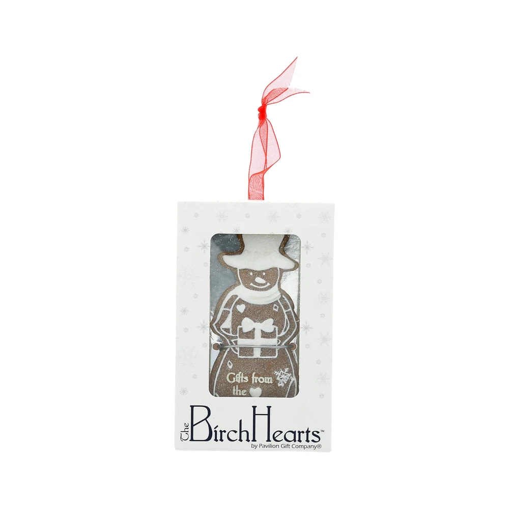 PREMIUM QUALITY: A charming 4" hand-painted gingerbread snowman ornament made from high-quality resin, featuring a raised "icing" texture for a cookie-like finish. The ornament is accented with a high-gloss coat and comes with a red organza ribbon for easy hanging. A signature snowflake charm adds extra festive flair. IN-HOUSE DESIGN: The snowman ornament features the heartwarming sentiment, "Gifts from the Heart," debossed on the front and highlighted with a white raised "icing" detail that mimics the look of a real gingerbread cookie. The snowman holds a beautifully wrapped gift, complete with a white bow, making this ornament a lovely symbol of holiday generosity. The high-gloss finish and snowflake charm give this piece a polished look, perfect for any Christmas tree. PERFECT GIFT: This gingerbread snowman ornament makes a thoughtful and festive gift for friends or family who love to celebrate the spirit of giving during the holidays. Its charming design adds warmth to any Christmas tree or holiday display, making it a timeless keepsake. Packaged in custom packaging, it's ready for gifting to spread holiday cheer. CARE INSTRUCTIONS: Wipe with a soft, dry cloth to maintain the ornament's shine and detail. MORE PRODUCTS: Explore other gingerbread ornaments with various sentiments to complete your holiday collection.