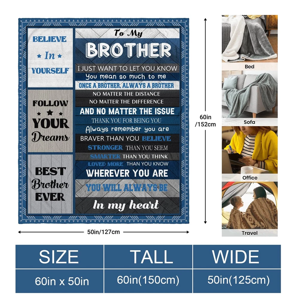 💖Gifts for Brother from Sister or Brother Big Brother Gift for Brother High-quality Materials It is Made of Soft, Skin-friendly, and Non-pilling Flannel, Which is More Comfortable, Warmer, and Does Not Hurt the Skin. It Has a Velvety Plush Touch, Soft Touch, No Pilling, No Wrinkling, No Allergy, No Shedding, No Shedding. Lightweight and Warm for All Seasons. Easy Care Machine Washable or Hand Washable, Quick Drying, Easy Care, Use Its Seat Cushion or Sofa Cushion when Not in Use, or Tuck Away for Storage. Durable. Multipurpose Use It Will Keep You Warm but Not So Thick That It Will Overheat. Giving You the Perfect Balance of Versatile Blankets for All Seasons. Also Can Be Used As Wearable Blanket, Sofa Blanket, Bed Blanket, Travel Blanket, Picnic Mat, Etc. Chic Design Unique Ideas Give the Blanket a Whole New Dimension, This Blanket Shows Love for Brothers" I Just Want To Let You Know, You Mean So Much To Me, Once A Brother, Always A Brother! No Matter The Distance, No Matter The Difference, Wherever You Are, You Will Always Be In My Heart." Gifts for Brother: This blanket is a practical and meaningful gift your brother will appreciate. This blanket is the Father's Day/Valentine's Day/Christmas/anniversary/wedding/baptism/Christian/adult/birthday gift for brother from sister/brother Size Instructions: This 50x60-inch blanket is the perfect size for all ages and is easy to carry, it will provide your brother with constant warmth To My Brother: This blanket is a thoughtful gift for your brother, it shows love for my brothers" I just want to let you know, that you mean so much to me, once a brother, always a brother! No matter the distance, no matter the difference, wherever you are, you will always be in my heart." Material Description: This brother's gift blanket features flannel fabric for beautiful color vibrancy even after washing, it is soft and skin-friendly, bringing you more comfortable and warm enjoyment Applicable Scene: Let your brother use this blanket and feel your warmth wherever they are. You can use this blanket to decorate sofa sofas and beds, It is also great for sofas, beds, parks, office naps, camping, and traveling
