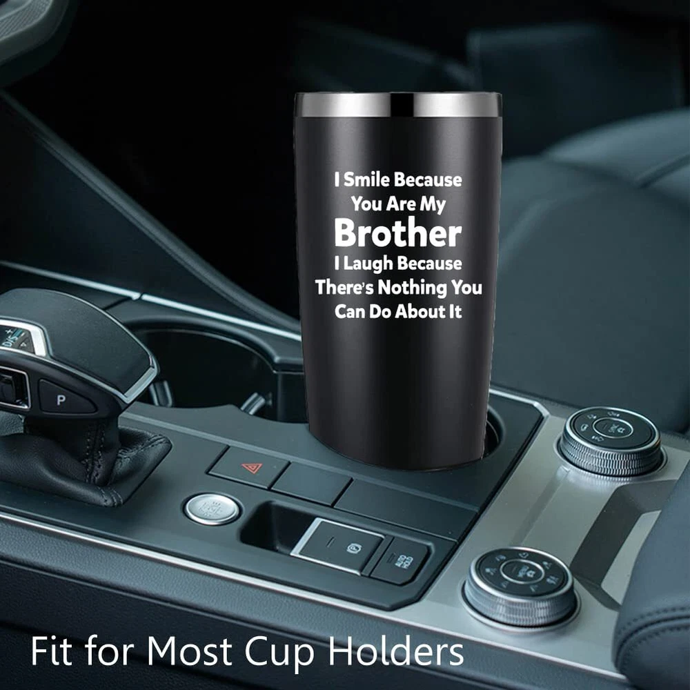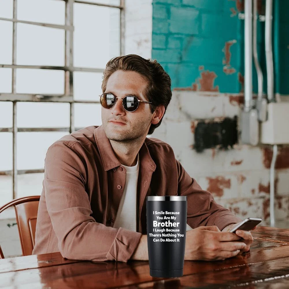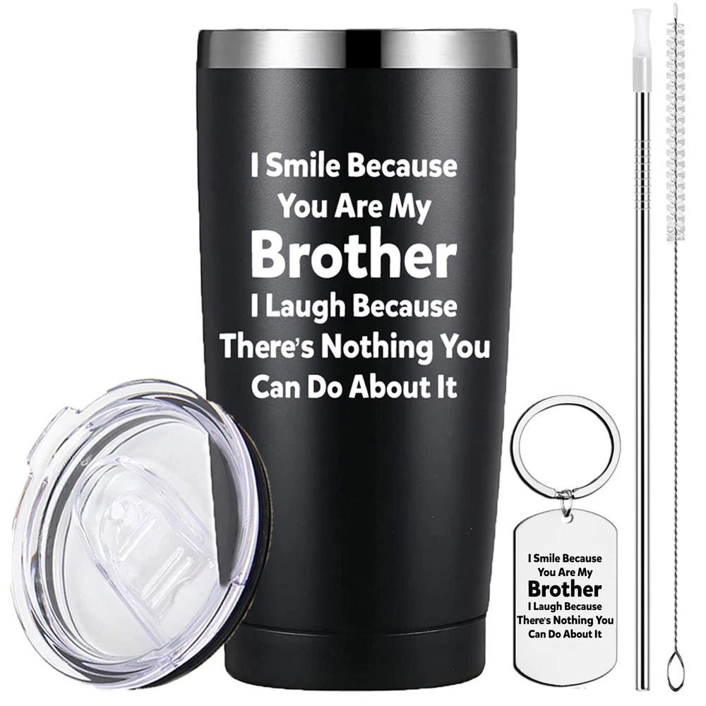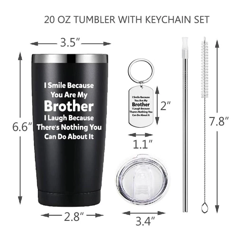 UNIQUE BROTHER CHRISTMAS GIFTS ------ With the funny word “I smile because you are my brother”, the simple modern tumbler and keychain set is a special way to express your emotions to your brother or friends. Perfect for birthday gift, holiday gift or other special occasions. UNIQUE BROTHER GIFTS ------ With the funny word “I smile because you are my brother”, the simple modern tumbler and keychain set is a meaningful way to express your love to your brothers or friends. He would grin from ear to ear to get a surprise! Perfect gift idea for birthday, Valentines, Father’s day, Thanks Giving, Christmas, New Years Day or other special occasions. SPILL-RESISTANT & NO LEAKS ------ The slide-closure lid comes with a seal ring, perfectly avoid annoying leaks and spills. Easy to carry around and fit most cup holders. Easy to wash by hand. DOUBLE-WALL VACUUM INSULATION ------ This tumbler cups is made of 304 18/8 food-stainless steel, rust-resistant and durable. The double-wall vacuum insulation effectively keeps your beverage at an ideal temperature for a long time and keeps your hands stay safe from the heat. SPECIAL KEYCHAIN ------ The stainless steel key chain is engraved the same words as the tumbler. The words on this keychain can’t be erased and it can be a meaningful keepsake. PACKAGE CONTENT ------ The brother gift set contains a 20 oz tumbler, an engraving keychain, a sliding lid, a straw and a straw brush. Very suitable for your big brother, little brother, step brother, old brother, siblings brothers, friends, best friend etc. Please feel free to let us know if you have any problem, we’re here to make it right.