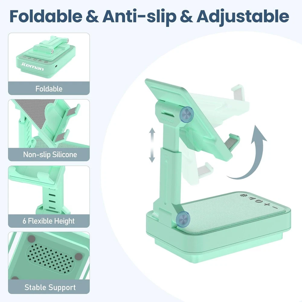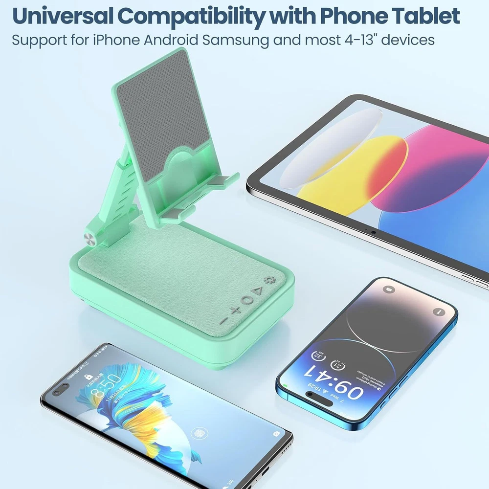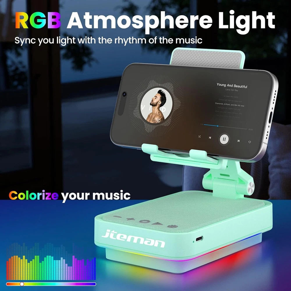 【3 IN 1 Multi-function Phone Stand+Bluetooth Speaker+Light】Our phone stand speaker with light combines cell phone stand, Bluetooth speaker and atmospheric light in one, the atmosphere light at the bottom can jump with the rhythm of the music. The loud Bluetooth speaker built-in 4Ω5W Power Speaker, provide HD stereo surround sound. The cool gadget is a great gift choice for men women. 【Rhythm-Synced Light Show】The Bluetooth speaker with lights has 5 monochrome lights and 6 mixed lighting modes, 3 of the mixed lighting modes will dance with the beat of the music. 4 brightness options, you can easily customize the light brightness. Turning on the color-changing lights to play music during the evening would be an awesome experience! 【Height and Angle Adjustable & Anti-slip & Foldable】The height and angle of the phone stand holder can be adjusted, you can easily adjust your device to find comfortable viewing angle. The panel, groove, and base are covered with anti-slip silicone to support your device firmly. Enjoy portability with a foldable design, perfect for travel or daily use. 【Universal Compatibility with Phone Tablet】The cell phone stand for desk supports for most 4-13" smartphones, tablets, e-readers, Kindel, Switch, iPad and more. Bluetooth 5.3 easily connects your device without any latency. The wireless speakers with Bluetooth compatible with iPhone, Samsung, Android smartphones, Computer, and most devices with Bluetooth. 【Cool Gadgets for Men Women】The portable Bluetooth speakers with stand is a great birthday gifts for men, women, father, mother, wife, husband, friends and anyone you love. Also perfect for mothers day gifts, fathers day gifts, anniversary gifts, graduation gifts, retirement gifts, teacher appreciation gifts, Thanksgiving gifts, Christmas gifts and more.