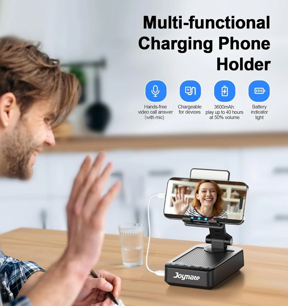 Gifts for Men Women, Joymate Bluetooth Speaker Phone Stand with Charging Function 360° Rotable Adjustable Cell Phone Holder HD Surround Sound for Desk Fits All Phones,Tablet (Black) Item Description 3 in 1 Bluetooth Speaker Charging Stand-With built in speaker, charging port and mic, it can not only be used to listen to music, answer calls, but also charge phone of power outages. Supports a wide range of smartphones, tablets. Practical gift for Birthday, Mother's Day, Father's Day, Christmas etc. 3600mAh Battery and Non-slip Design- Our cell phone holder comes with a large capacity battery which serves as a power bank (not wireless charging), and the play time is up to 40h at 50% volume in fully charged state. Plus, remaining power is visible from the battery indicator light. Panel and base are covered with silicone pads which can prevent slipping. Bluetooth 5.3 & HD Stereo Subwoofer Speaker- This Bluetooth speaker equipped with advanced 5.3 Bluetooth signal supports stronger connection, range up to 32.80ft. It combines stereo and subwoofer to make clear sound that complies with every beat and less distortion, good for creating an atmosphere for party or festival. Foldable and Angle Adjustable- Being foldable and weighs only 13.05oz, it is easy to fit into your bag/backpack, ideal for enjoying music anytime and anywhere. Adjustable height and angle for comfortable watching view or taking hands-free showcase video, save your neck and wrist. 360° Click Rotation and Perfect Gift- The phone stand can rotate 360° and emit a click sound, making it easy to get best view or play with it to alleviate stress. The technophile will totally love it. Cool and functional gift for him/her. Being able to connect to computer via the original data cable. Please feel free to contact us if you have any problem. › See more product details Faster link speed and stronger signal, with a maximum connection range of 10 meters. Easy to adjust to the comfortable angle and firmly hold electronics. Payment We accept payment only through PAYPAL Shipping We ship products worldwide through standard express courier service, it will reach within 7 to 10 days to abroad buyers, we ship the product after recieved clear payment and give full information about shipment to the buyer Return We accept product return within 7 to 21 days from delivery date but product should be in original position and not in damaged condition,the return shipping charges will be buyer responsibility