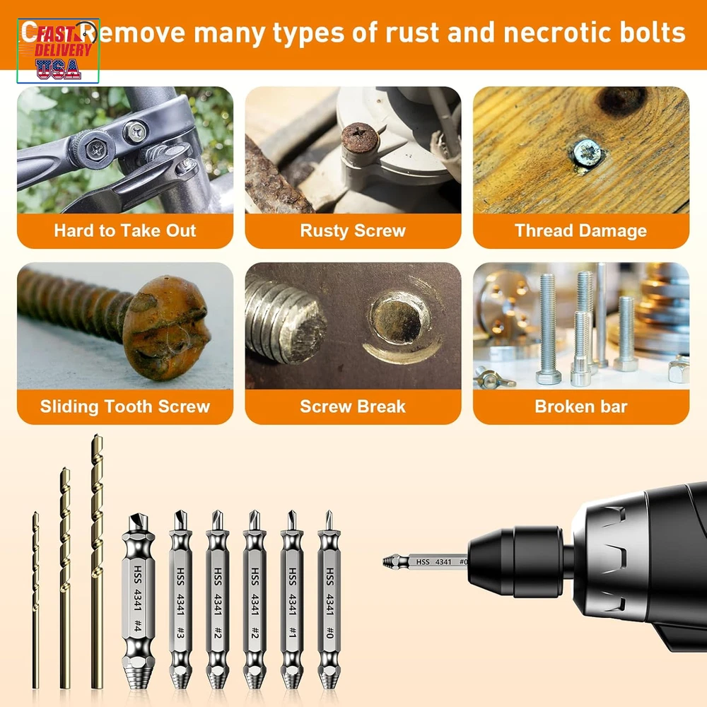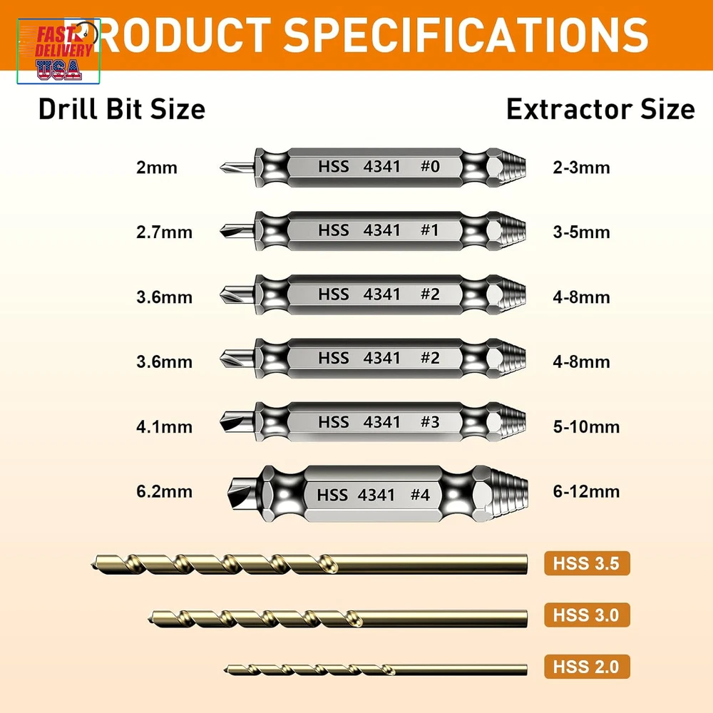 Brand: Does not apply Power Source: hand_powered Material: Carbide, High Speed ​​Steel, HSS 4341 Country of Origin: China Product Dimensions: 5.63 x 43.31 x 14.45 inches UPC: 313108758736 Type: Does not apply Item model number: 9-screw extractor Batteries Required?: No Part Number: 9-screw extractor Item Weight: 3.52 ounces gtin13: 313108758736 Included Components: 6 screw extactor set, 3 Twist Drill Bit