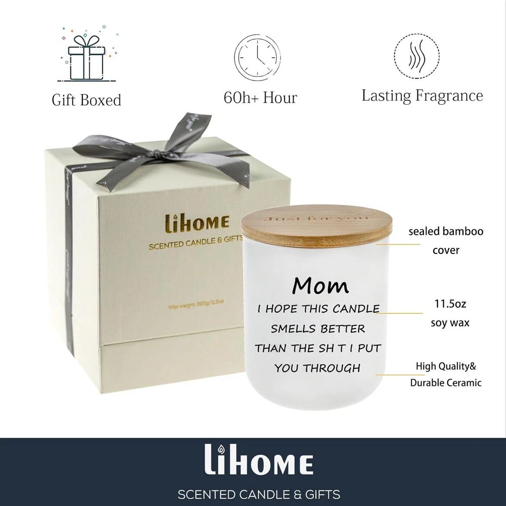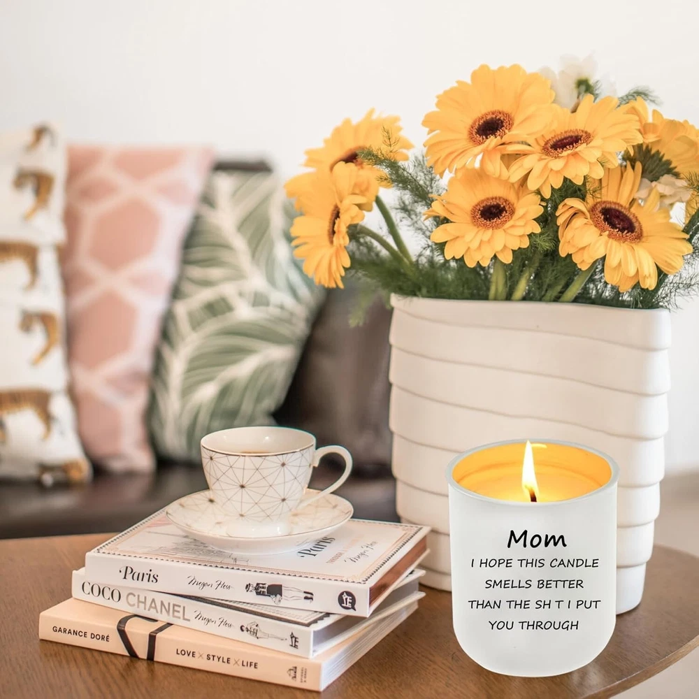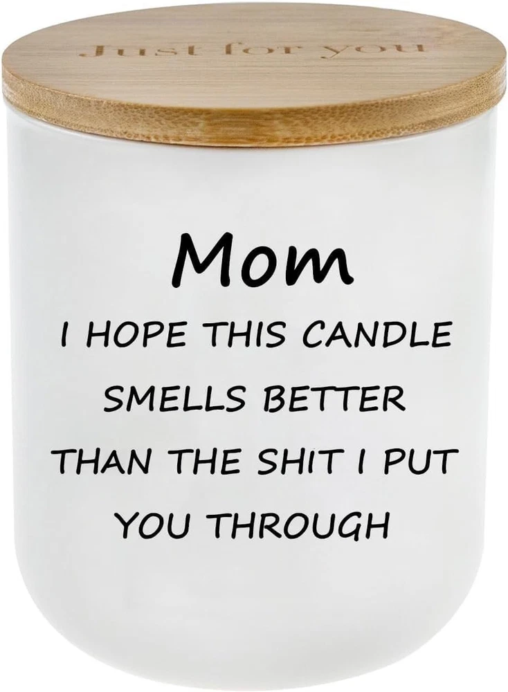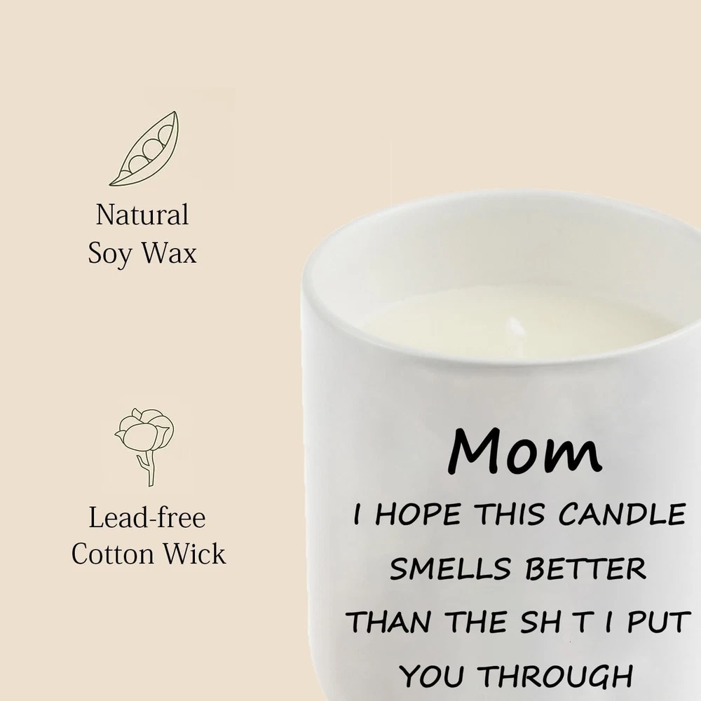 Gifts for Mom from Daughter Son Mom Gifts Funny Birthday & Mothers Day Gift Style:Mom06 Color: White Product Dimensions: 3.4"W x 4.3"H Item Weight: 11.5 Ounces Number of Items 1 Scent: Vanilla Are Batteries Included No Indoor/Outdoor Usage: Indoor Specific Uses For Product: Relaxation Shape: Round THE PERFECT GIFT FOR A MOTHER OR FATHER - MOM I HOPE THIS CANDLE SMELLS BETTER THAN THIS SH T I PUT YOU THROUGT, Ceramic candle makes a humorous present for any parent from their child. GOOD FOR SEVERAL OCCASIONS - An awesome and useful gift to candle lovers for 2023 Christmas, Valentines day, Mothers Day, Fathers Day, bday, cool stocking stuffer, Hanukkah, inexpensive holiday gift, cute gift basket, holidays,valentine’s day, white elephant gift exchange, secret santa, yankee swap, sarcastic gag bags wraps, work party, retirement, inappropriate naughty humor, parents birthday gift, funniest creative small gifts. 100% NATURAL SOY WAX - Scented candle is made from natural soy wax; Soy wax provides a slower and cleaner burn, which is better for environment, burns more sufficiently and long time. CANDLE INFO: Individually gift boxed | Reusable ceramics jar with wooden Lid | Jar Size: 3.4" x 3.4" x 4.3" | 11.5oz soy wax and cotton wick | 60h+ Hour Burn Time. Return Policy: We offer a 30 day return policy from the receiving date. Please contact us for a Free Return Label. Please use our return label so it will go back to our supplier and we can do a refund or replacement afterwards. Feedback: Your satisfaction is very important to us! If you have any problem with your order, please contact us and we will do our very best to make you satisfied. As long as you are happy with your purchase, please leave a positive feedback for us. We will always leave you a positive feedback in return. If you have any problem with your purchase, please do not leave a negative feedback. Please Contact us ... and your issue will be solved quickly and positively We are a small family-owned business trying to make a living, not a huge company that does not care ... We will ALWAYS do our best for you!
