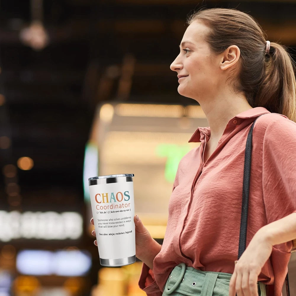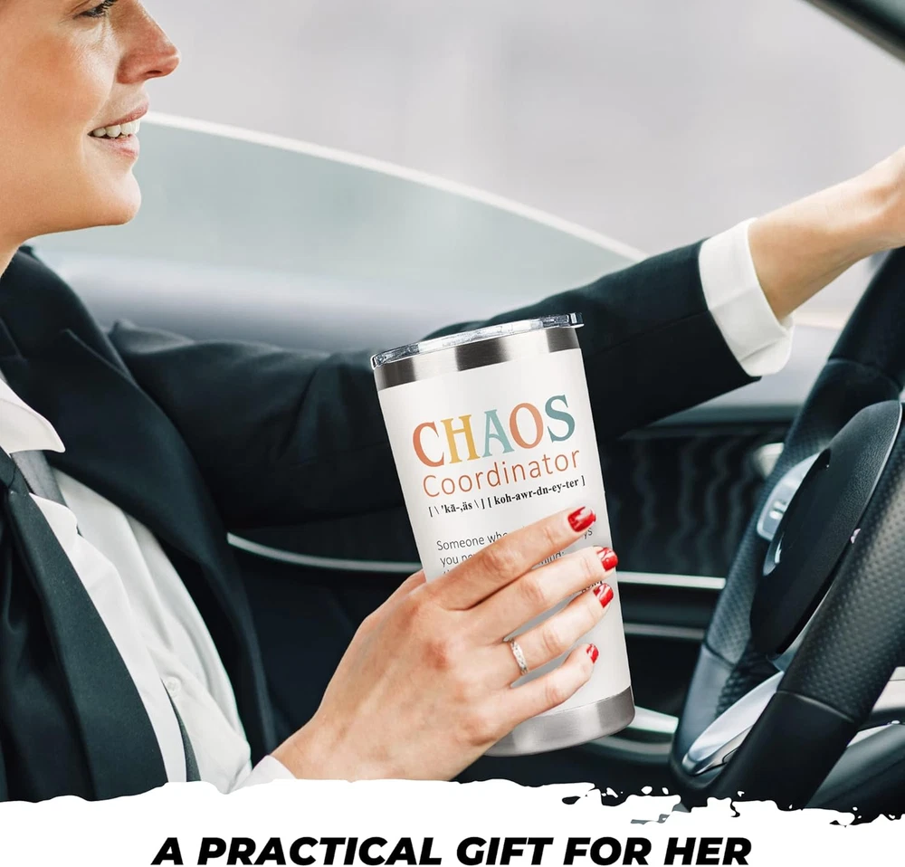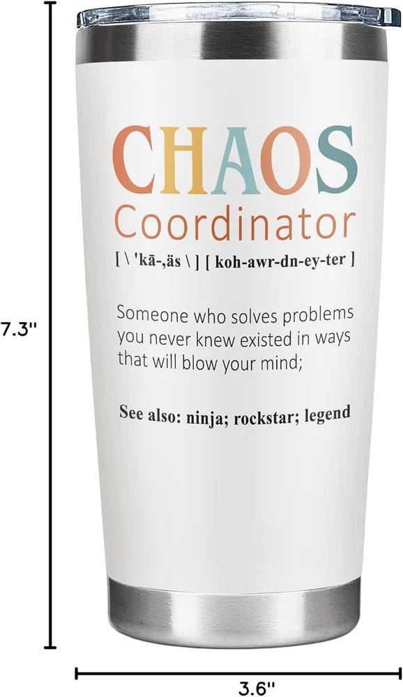 GIFTS FOR WOMEN: Let this Chaos Coordinator Mug Tumbler add humor to her tedious work life. Ideal for gifts for women who have everything, gifts for women who have everything, gifts for mom, friendship gifts for women friends, womens gifts, teacher gifts for women, gift for women, gift for her, office gifts for coworkers, boss lady gifts for women, gifts for coworkers, office gifts for women,... THANK YOU GIFTS FOR WOMEN: Put a smile on her face with our Chaos Coordinator Gifts Tumbler. Suitable for boss appreciation gifts for women, farewell gifts for boss, farewell gifts for coworkers, coworker leaving gifts for women, christmas gifts for coworker, boss day gifts for women, boss birthday gifts for women, coworker birthday gifts for women, teacher appreciation gifts, ... SPILL RESISTANT & DURABLE DESIGN: Come with a clear, push-on lid and crafted with 18/8 food-grade stainless steel, this tumbler is unbreakable, sweatproof, rust-resistant, portable, and perfect for morning coffee or to regularly drink out of. DOUBLE WALL VACUUM INSULATION: Made with double-wall vacuum insulation, this tumbler can keep your favorite beverages hot for 8+ hours and cold for 12+ hours in normal temperature environment. This can hold hot coffee, iced cold fruit teas, wine tumbler,... without affecting your drink’s natural taste. PORTABLE TRAVEL TUMBLER: fit into most cup holders. Our 20 Oz tumbler is ideal for both outdoor and indoor use like working, exercising, backyard barbecues, picnic, hiking adventure, RV tour, beach outing, fishing trip or in any daily activity. Product Description A FUNNY GIFT FOR HER If you are looking for a fun and unique gift for your coworker, boss, mom, woman, or friends, look no further than our funny tumbler! This tumbler is the perfect way to add a little humor to someone's day while keeping them hydrated. A Practical Gift For Her! Our tumbler is made from high-quality stainless steel, ensuring that it will last for years to come. It features a double-wall vacuum insulation, which means that it can keep drinks cold for up to 12 hours or hot for up to 8 hours. The lid is also spill-proof, good for taking on the go. Sweet Gift For Any Occasion What sets our tumbler apart is the funny message printed on the front. It will bring a smile to the face of anyone who sees it. Plus, with its sleek and stylish design, it is sure to be a hit with anyone who receives it. So if you are looking for a gift that is both practical and fun, consider this tumbler. It's the perfect way to show your appreciation for a coworker, boss, mom, woman, or friend... A Daily Reminder Of Your Love Imagine the smile on her face as she sips her coffee or tea from this gift, or the joy she will feel as she carries it with her throughout the day. It's a gift that will bring a little bit of laughter and a lot of practicality to anyone's life. The gift of laughter and hydration! If you are searching for a unique, practical gift for a coworker, boss, mom, woman, or friends... our funny gift is the lovely choice. With its durability, fun message and stylish design, it's sure to be a hit with anyone who receives it.